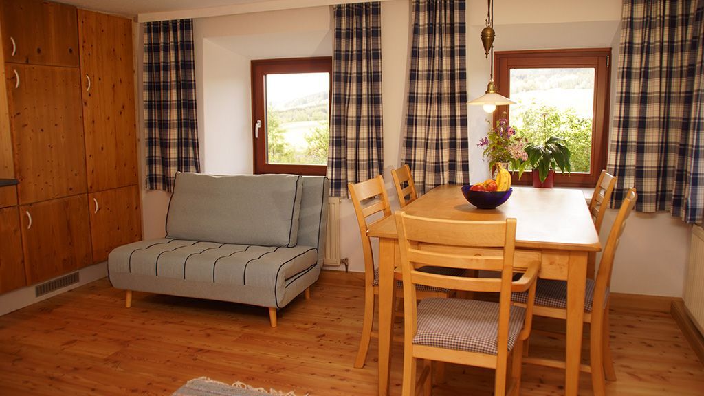 Die Ferienwohnung hat eine voll ausgestattete Wohnküche mit einem Schlafsofa, ein seperates Schlafzimmer mit einem Doppelbett. Bad und WC sind getrennt. Weiters einen großzügigen Vorraum mit Garderobe.