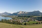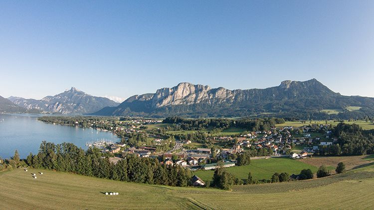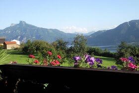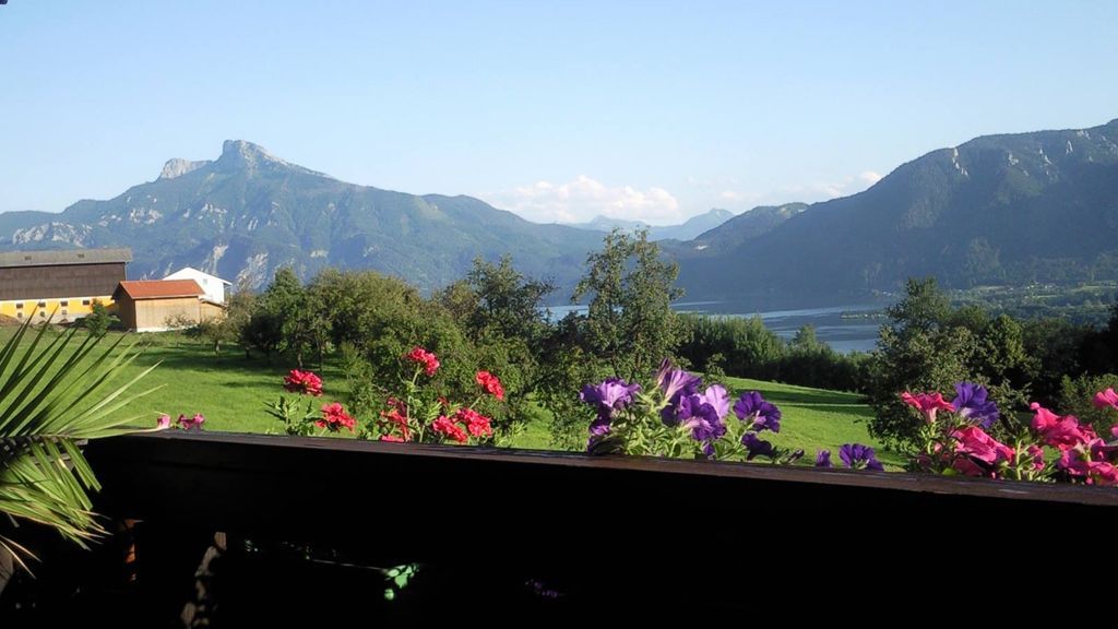 Unser Bauernhof liegt auf einer Anhöhe mit einem Ausblick auf den Mondsee und die wunderschöne Gebirgskulisse.