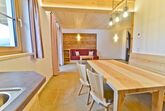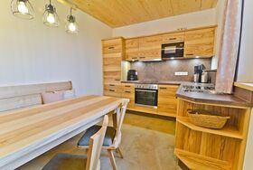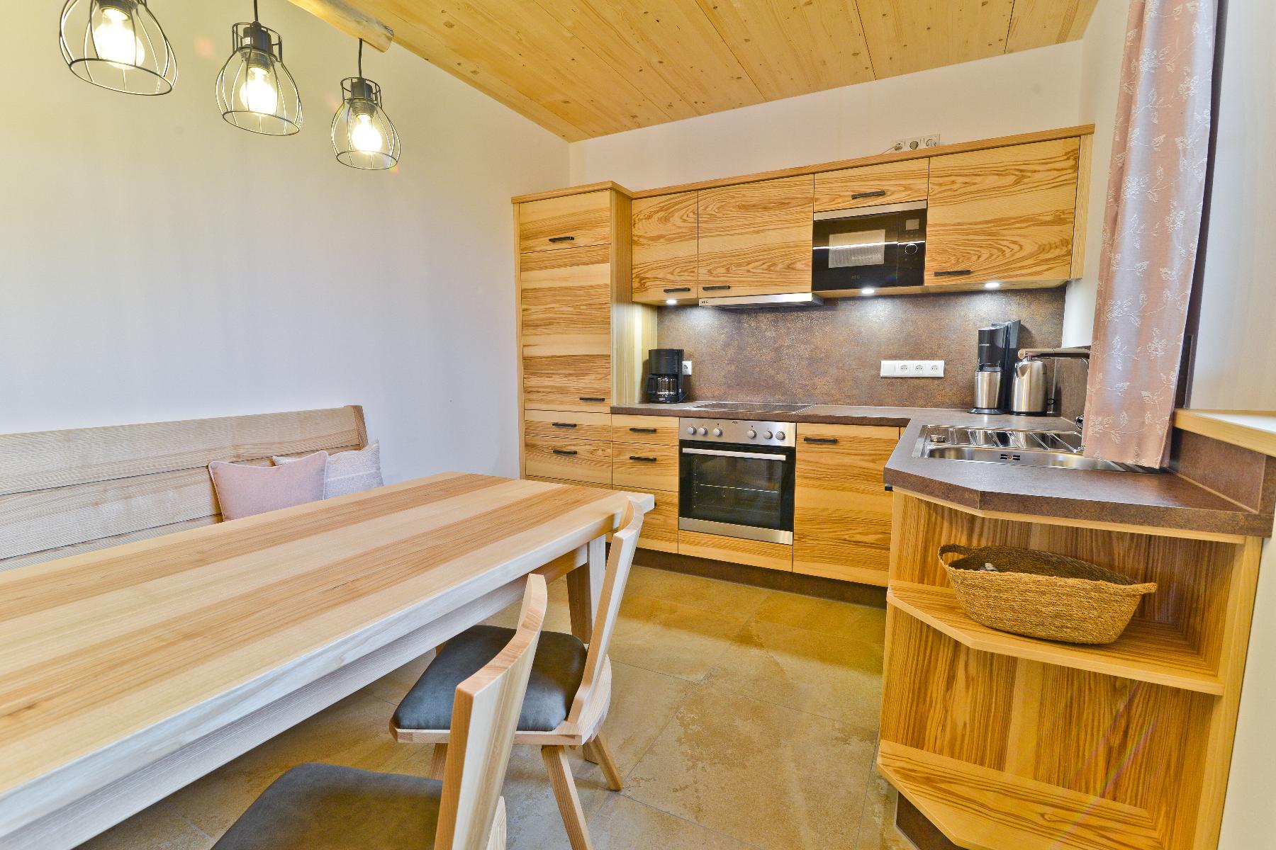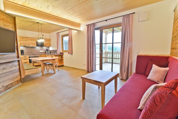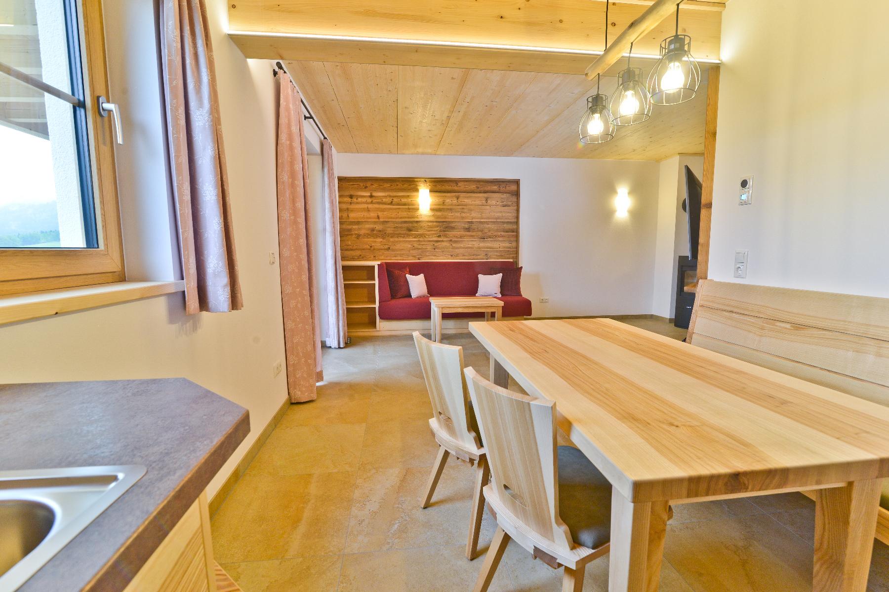 Die Wohnung umfasst eine voll ausgestattete Küche, Fußbodenheizung, einen gemütlichen Wohnbereich mit Kaminofen, ein Badezimmer mit Regendusche sowie eine Infrarotkabine im Schlafzimmer für entspannte Wohlfühlmomente.