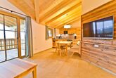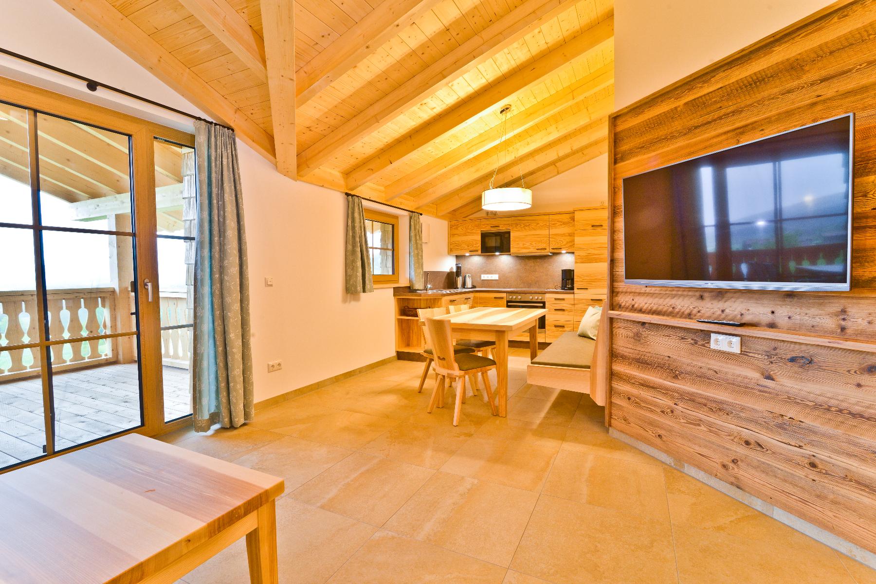 Der großzügige Terrasse bietet einen atemberaubenden Panoramablick auf das Tal und die umliegende Bergkette. Eine voll ausgestattete Küche mit Essgruppe und der gemütliche Wohnbereich mit Fußbodenheizung und Kaminofen laden zum Verweilen ein.