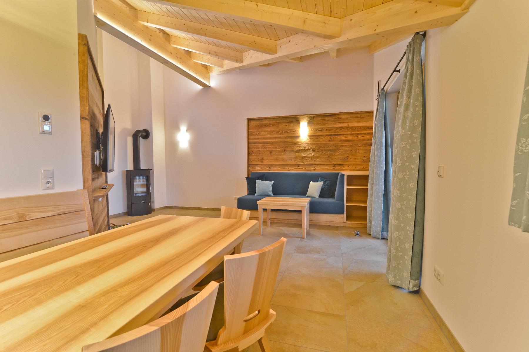 Der offene Sichtdachstuhl aus Holz aus dem eigenen Wald und die Möbel vom hiesigen Schreiner verleihen der Wohnung eine warme, natürliche Atmosphäre.