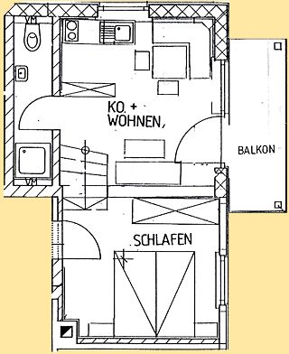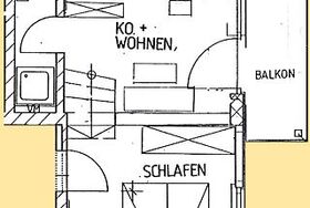 Gemütliche 2-Raum-Wohnung auf 2 Ebenen mit sonnigem Süd-Ost-Balkon. Im ländlichen Stil eingerichtet. Vollständig ausgestattete Küchenecke mit Mikrowelle.