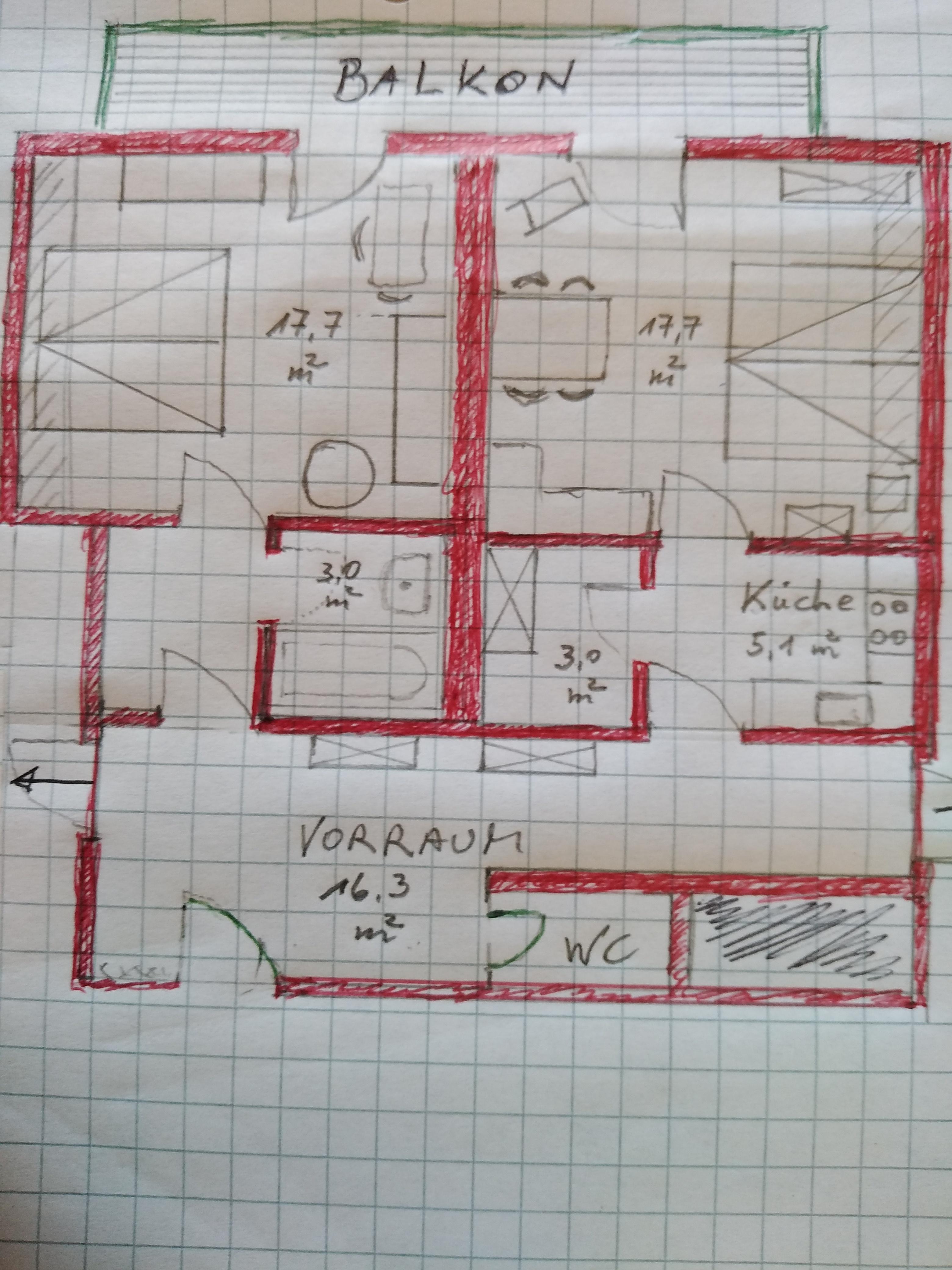 Das Appartement liegt im 2 Stock. Es hat 1 Schlafzimmer mit Balkon und einem Zirben-Doppelbett. Das 2. Zimmer ist das Wohn-Esszimmer mit dem SAT-TV und hat 2 Schlafgelegenheiten in einem Messing-Doppelbett. Angrenzend ist die Küche mit Herd und Backrohr, Wasserkocher und Kaffee(filter)Maschine. Der Kühlschrank und der Kleiderschrank befinden sich im Nebenraum. Es gibt ein kleines Badezimmer mit Waschbecken und Badewanne-Dusche, das WC ist vom großen Vorraum erreichbar. W-LAN ist vorhanden. Parkmöglichkeit ist vorm Haus oder 10m entfernt.