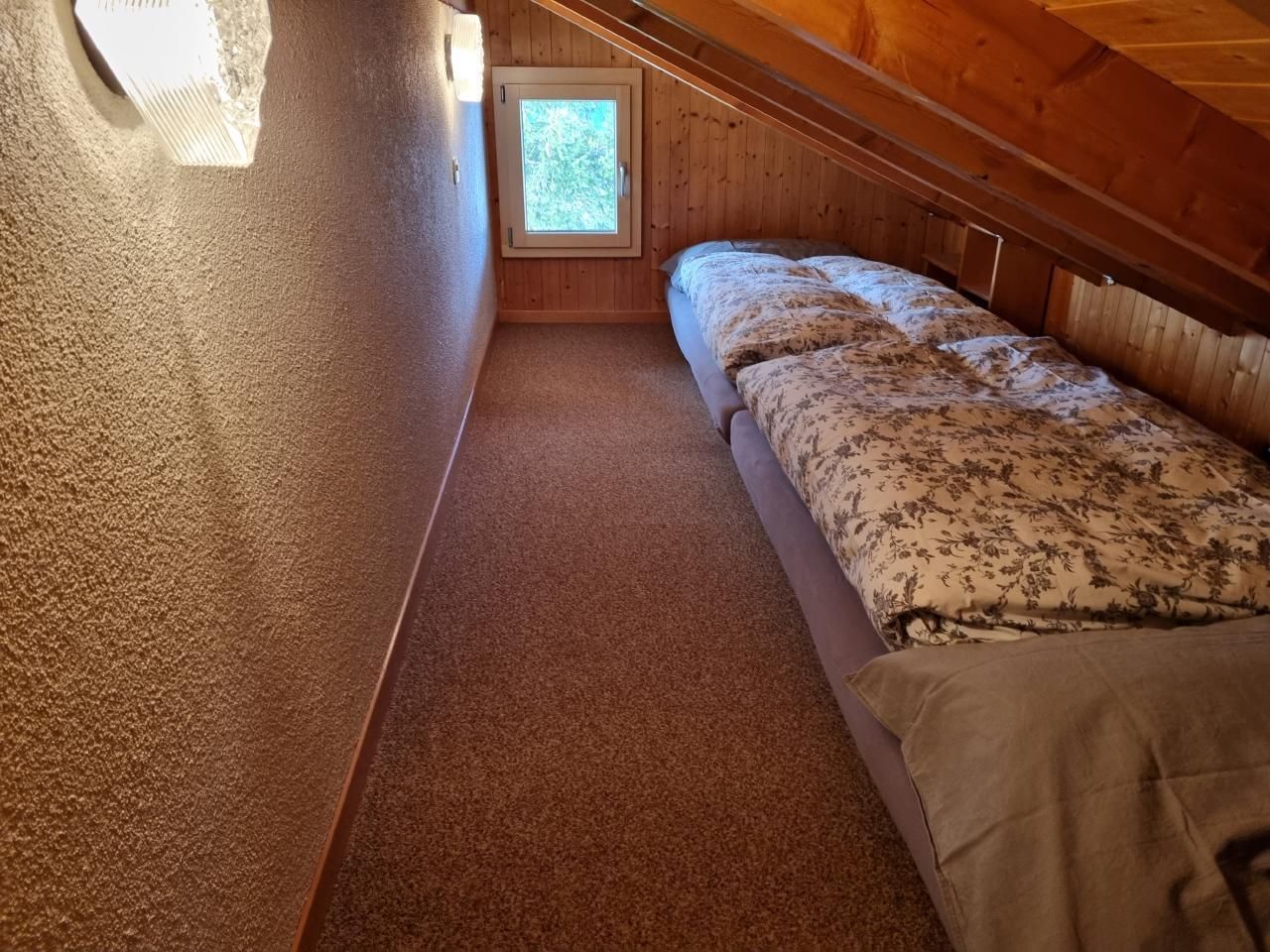 Im Inneren erwarten die Gäste eine gemütliche Atmosphäre mit einem Schlafzimmer sowie einem Mansardenzimmer, das mit einer maximalen Höhe von 1,65 Metern über eine Leiter zugänglich ist und somit ein besonderes Abenteuer bietet, allerdings für Kleinkinder nicht geeignet ist. Die Küche lässt keine Wünsche offen und ist mit allem ausgestattet, was das Herz begehrt - von Racletteofen über Fondue-Caquelon bis hin zu einer Kaffeemaschine mit Nespressosystem. Ein Wohnzimmer mit einem ausziehbaren Esstisch und einem Cheminéeofen verspricht gemütliche Stunden, während das Badezimmer mit Dusche/WC praktischen Komfort bietet.