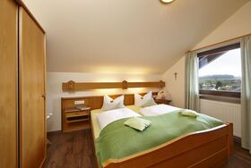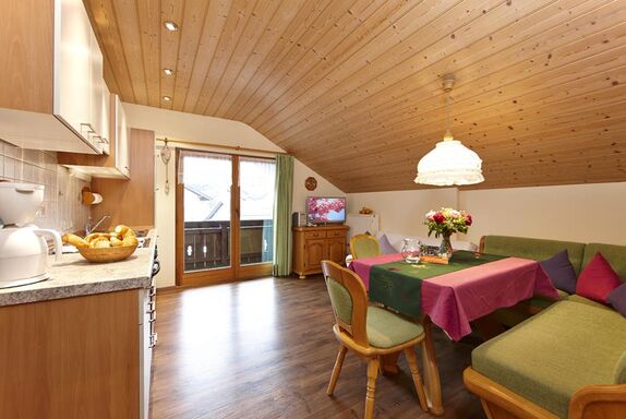 Komfortabel eingerichtete Ferienwohnung für 2 Personen im 2. Stock (Dachgeschoß). Die Wohnung ist aufgeteilt in 1 separates Schlafzimmer, eine Wohnküche mit großem Kühl- u. Gefrierschrank, 4-Plattenherd mit Backofen, Spülmaschine u.v.m. und Dusche/WC. Vom schönen Westbalkon genießen Sie bei Sonnenuntergang den freien Blick auf unseren Hausberg, das Hörnle.
