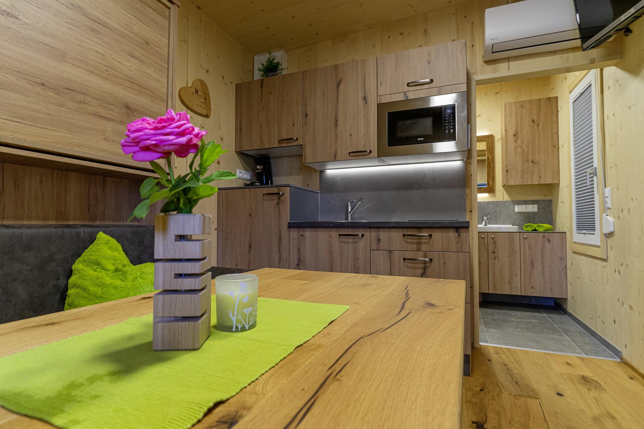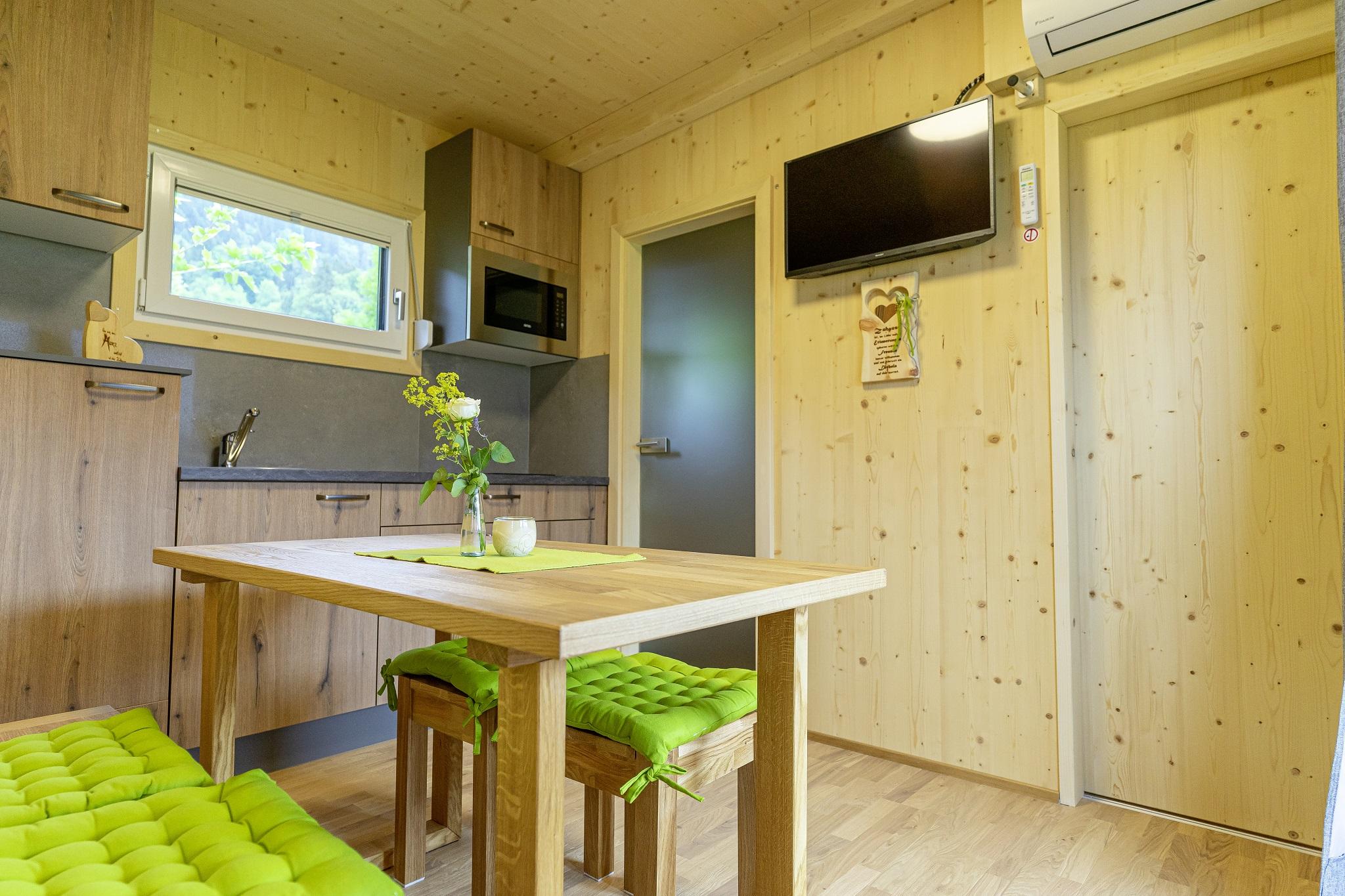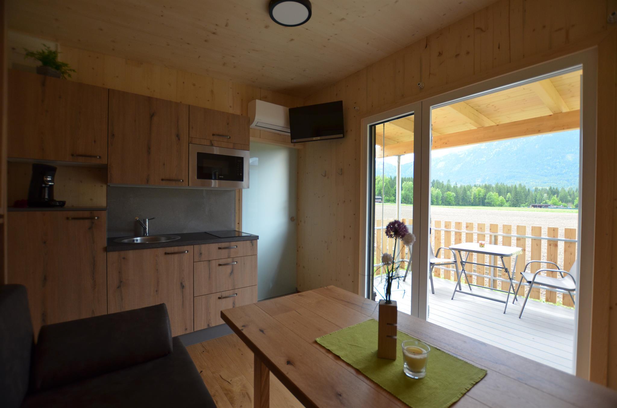 Das Reisskofel Blick Mobil Home ist mit Küche, Schlafzimmer mit 2 Betten ( 80x200), Sitzgarnitur mit Option zum Bettumbau, eigenem Bad und WC sowie einer kleinen überdachten Terrasse, die keine Wünsche offen lässt, ausgestattet.