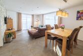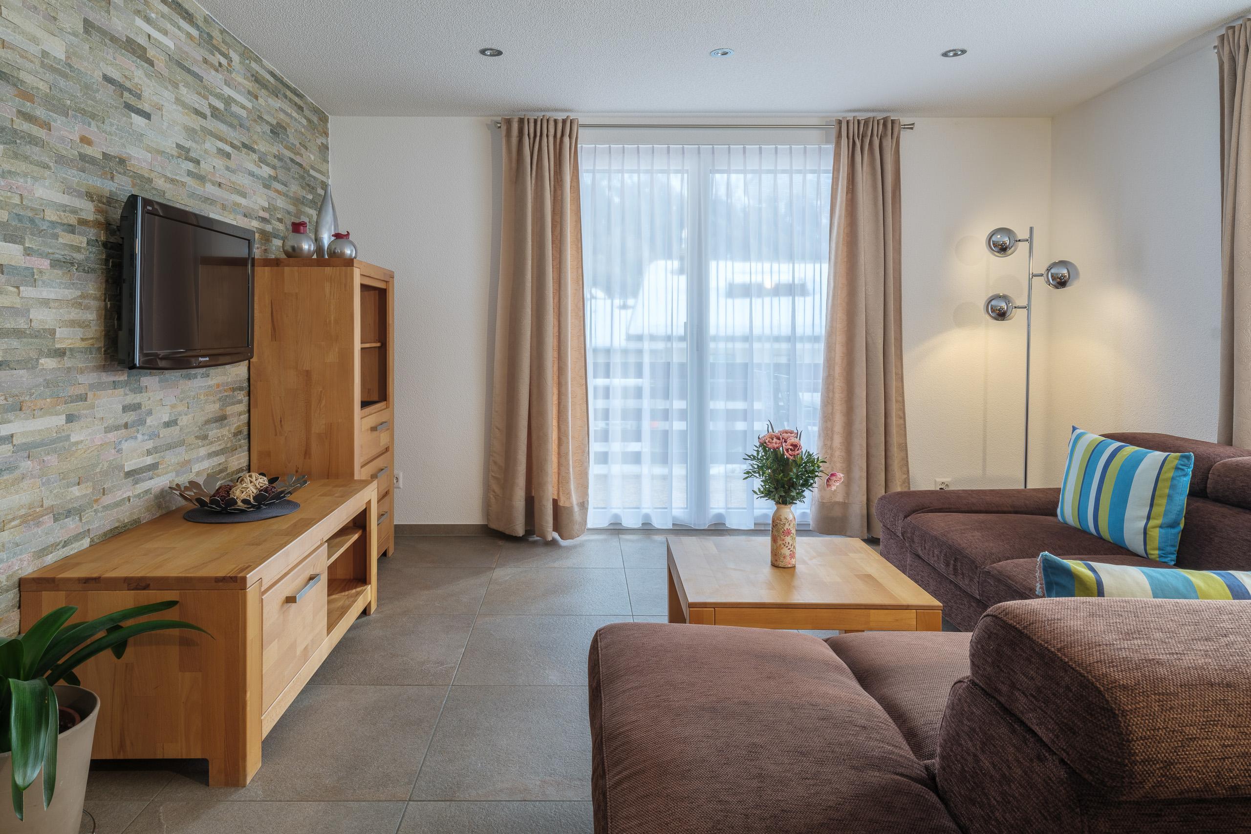 3-Zimmerwohnung, neu renoviert: Offene Küche mit Geschirrspüler, Wohnzimmer, TV, Radio, gratis W-LAN, 2 Schlafzimmer mit je 2 Betten (90 x 200cm), Dusche/WC, 2 x Südbalkon, Rasenplatz.