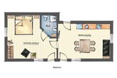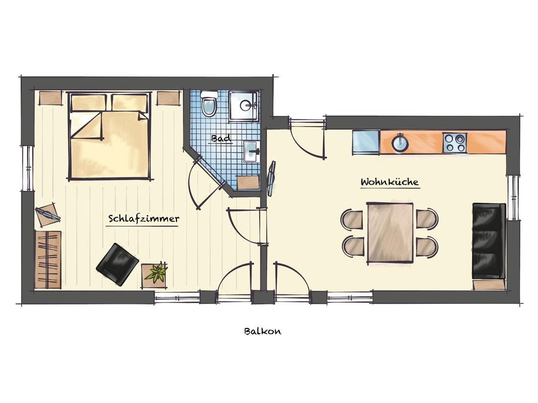 Schlafzimmer, Wohnküche mit großem Schlafsofa einem Badezimmer (Dusche und WC) / Ausstattung: LCD-Screen mit SAT, gratis Internet WLAN, komplett eingerichtete Küche mit Kühlschrank, E-Herd mit Backrohr, Mikrowelle, Geschirrspüler, Kaffeemaschine, Wasserkocher, Geschirr, Kochtöpfe, Handtücher, Bett- und Küchenwäsche. / Dieses Appartement befindet sich im Obergeschoß mit Balkon.