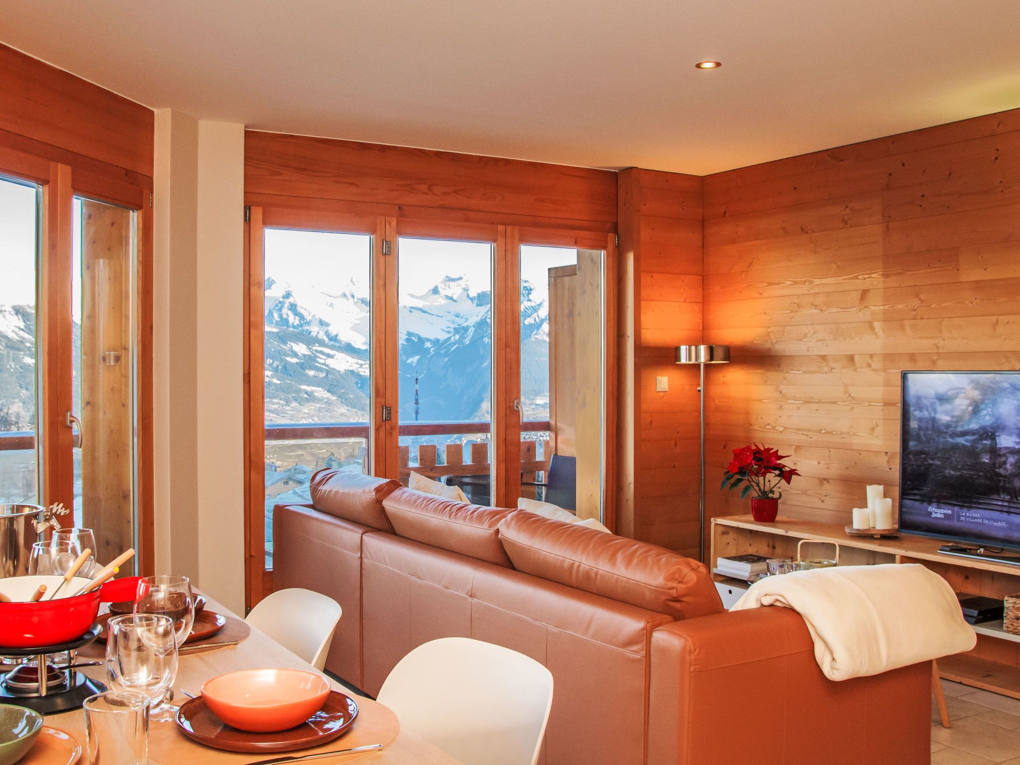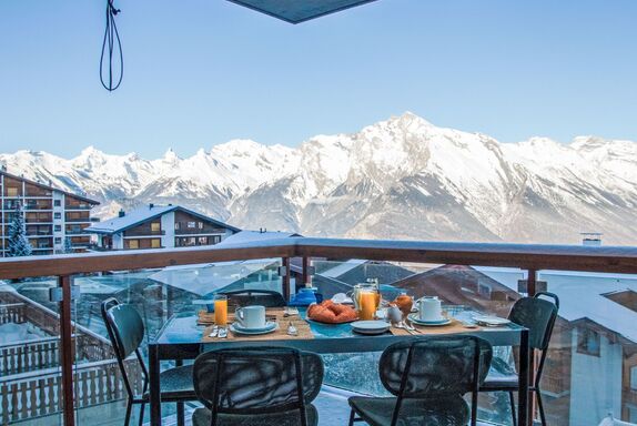 Domaine des Reines B3, 3-Zimmer-Wohnung 55 m2. Komfortabel und schön eingerichtet: Wohn-/Esszimmer mit Kabel-TV. Ausgang zum Balkon, Richtung Norden. 1 Zimmer mit 1 franz. Bett (160 cm, Länge 200 cm). 1 Zimmer mit 1 x 2 Etagenbetten (90 cm, Länge 190 cm). Offene Küche (Backofen, Geschirrspüler, 4 Glaskeramikplatten, Toaster, Wasserkocher, Mikrowelle, elektrische Kaffeemaschine, Kapseln für die Kaffeemaschine (Nespresso) extra, Racletteofen, Fondue Set (Käse)). Dusche/WC. Heizung. Balkon. Sehr schöne Sicht auf die Berge. Zur Verfügung: Haartrockner. Internet (WLAN, gratis). Parkplatz (1 Auto), Garage (1 Auto) in 200 m. Bitte beachten: Nichtraucher-Unterkunft.