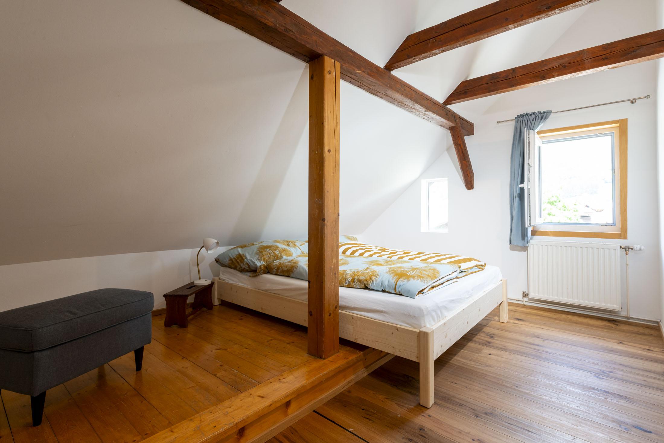 In drei gemütlichen Schlafzimmern mit Doppelbetten finden bis zu 6 Gäste ausreichend Platz, um sich nach einem aktiven Tag zu erholen. Das Highlight dieses Apartments sind die Dachbalken und die rustikale Holzstiege, welche eine besonders heimelige Atmosphäre verleihen.