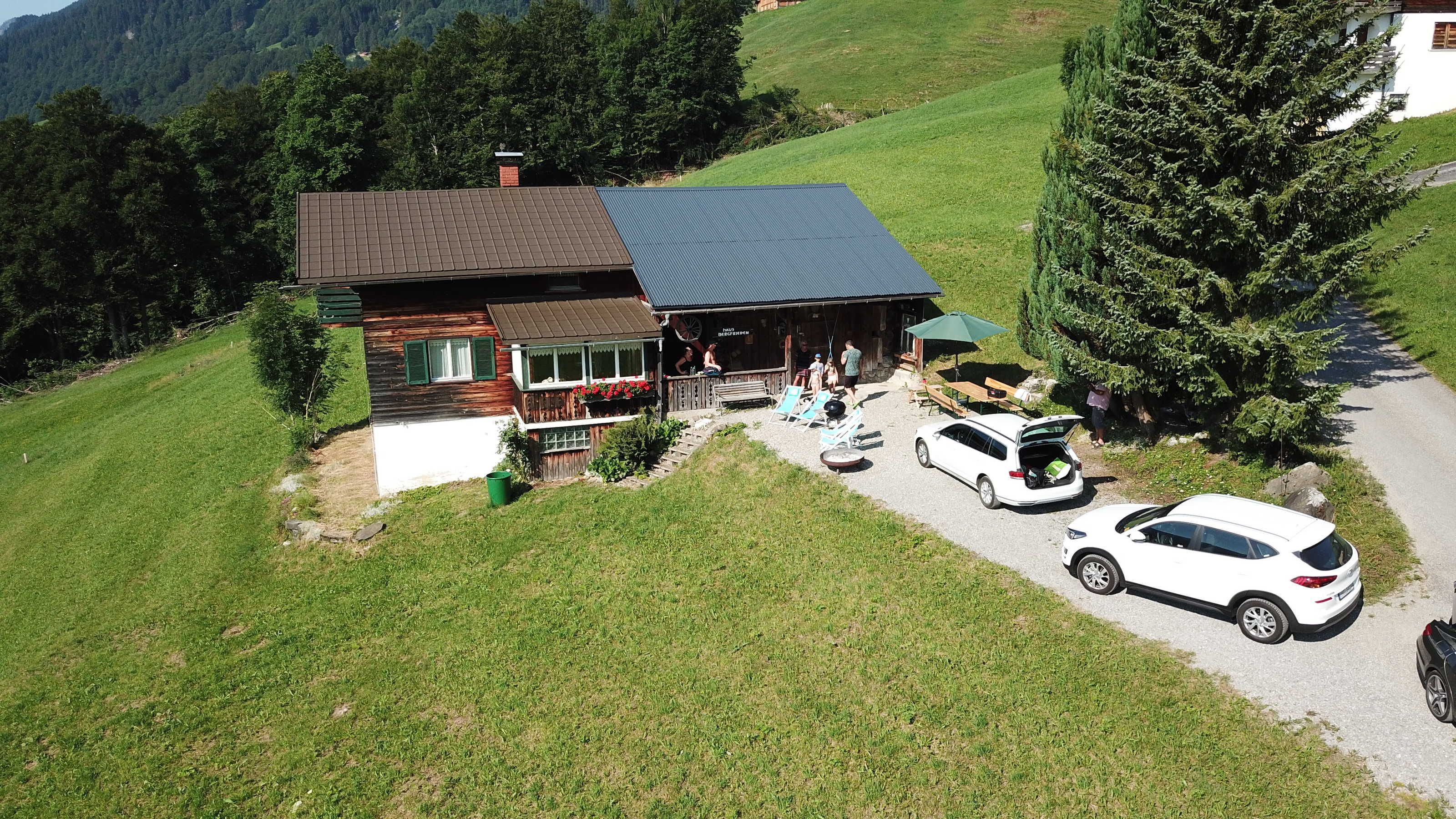 Auf dem Vorplatz der Hütte kann gegrillt werden, bei schönem Wetter mit Frühstück in der Sonne und Blick auf die Berge von Au und Schoppernau startet der Tag, auch 2 Biergarnituren sind vorhanden.