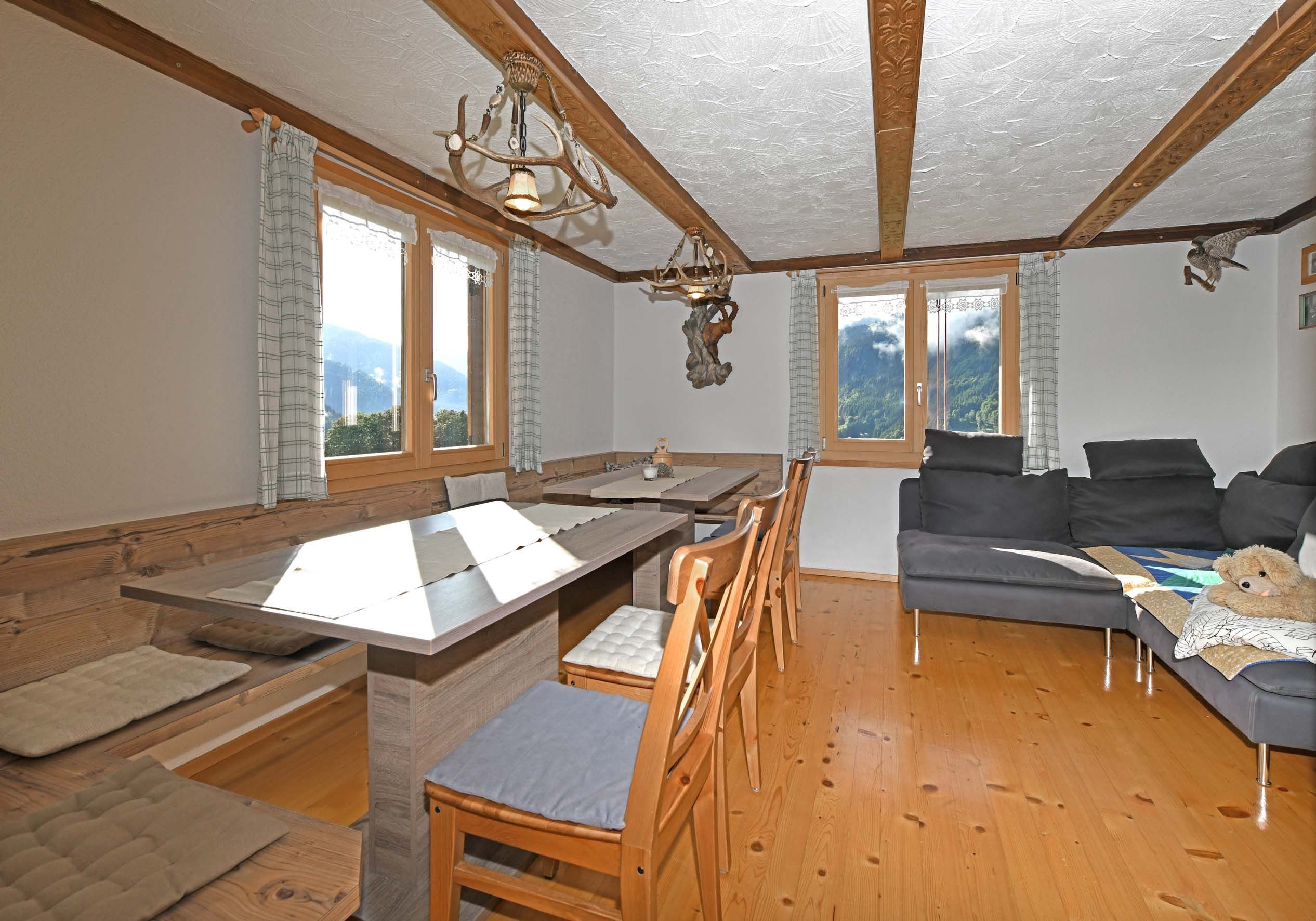 Eine voll ausgestattete Küche mit Spülmaschine, 3 Schlafzimmer für je 2 Personen im Obergeschoss und 1 Schlafzimmer für 3 Personen im Anschluss an die Stube im Erdgeschoss. Die gemütliche Stube mit Schwedenofen und mit Eckbank für 9 Personen lädt zum gemütlichen Beisammensein ein. Das grosse Badezimmer befindet sich im Untergeschoss mit Doppelwaschbecken und XL - Dusche eingerichtet. Bettwäsche und Dusch und Handtücher mitbringen, Leintücher und Küchentücher sind vorhanden.