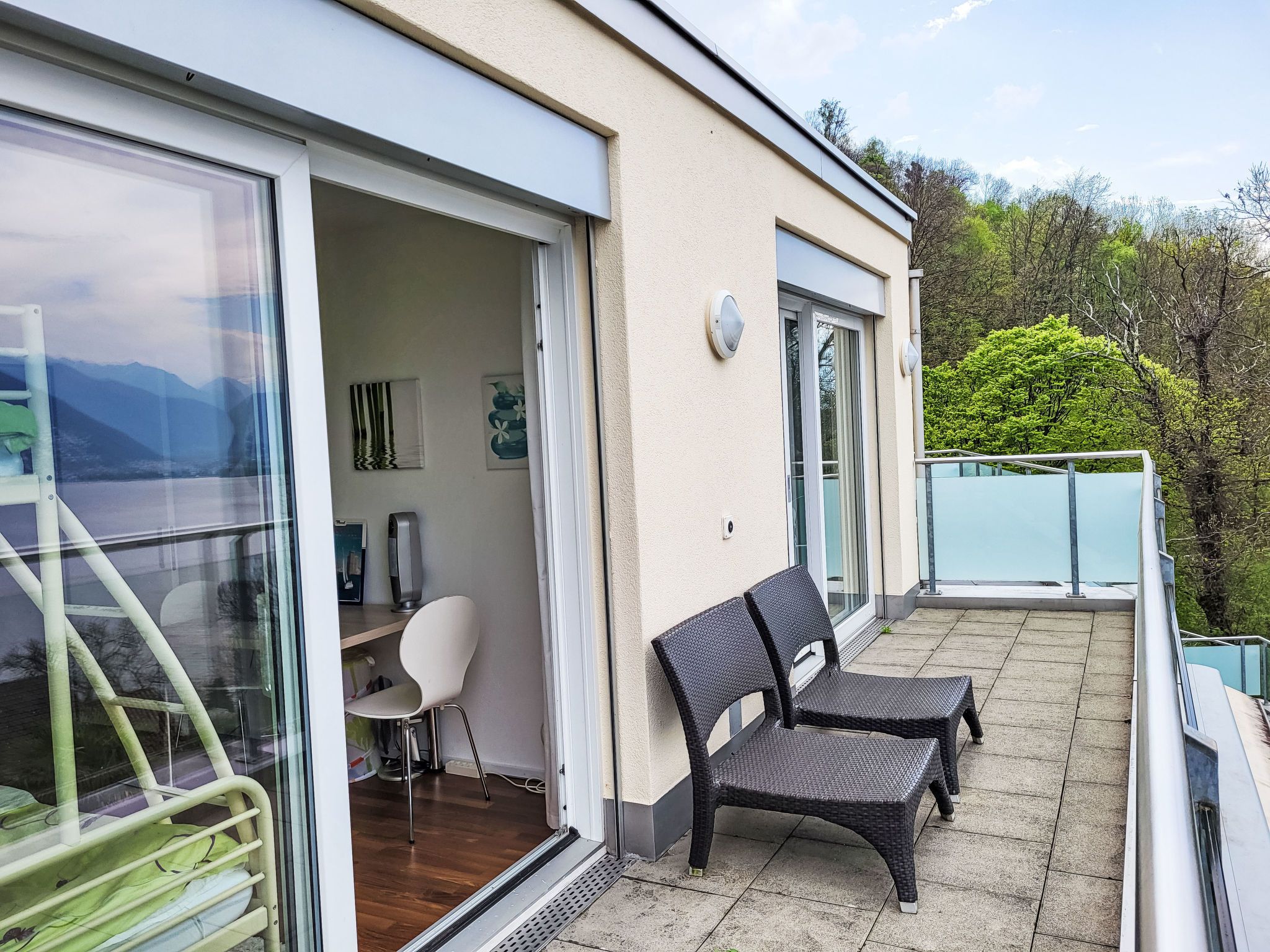 Splendid Maggiore View, 3-Zimmer-Maisonette-Wohnung 120 m2 auf 2 Stockwerken, Nordwestlage. Objekt geeignet für 4 Erwachsene + 1 Kind. Geräumig und hell, komfortabel und modern eingerichtet: offenes grosses Wohn-/Esszimmer mit Panoramafenster mit Esstisch, Küchenblock, TV, Flachbildschirm und DVD. Ausgang zur Terrasse. Offene Küche (Backofen, Geschirrspüler, 4 Glaskeramikplatten, Toaster, Wasserkocher, elektrische Kaffeemaschine, Kapseln für die Kaffeemaschine (Nespresso) extra). Sep. WC. Bodenheizung. Unteres Geschoss: Dusche/WC. Obergeschoss: (Wendeltreppe) 1 Doppelzimmer mit 1 Bett (90 cm, Länge 200 cm), 1 franz. Bett (140 cm, Länge 200 cm). Ausgang zum Balkon. 1 Doppelzimmer mit 1 Doppelbett (160 cm, Länge 200 cm). Ausgang zum Balkon. Bad oder Dusche/WC. Balkon 15 m2, Nordwestlage, grosse Terrasse 32 m2 teilweise überdacht, Nordwestlage. Terrassenmöbel, Gartengrill (mobil), Liegestühle (2). Bitte beachten: Nichtraucher-Unterkunft. Die Wohnung ist geräumig, hell und komfortabel, mit modernen Möbeln ausgestattet. Sie verfügt über einen großzügigen Wohnbereich, der nahtlos in eine große Terrasse übergeht und so einen harmonischen Innen-Außen-Fluss schafft. Die weitläufige Terrasse erweitert den Wohnraum und bietet reichlich Platz zum Entspannen und Unterhalten, während sie einen atemberaubenden Blick auf den See und die Berge bietet. Wenn der Tag zur Nacht wird, wird die Terrasse zu einem perfekten Aussichtspunkt, um den Sonnenuntergang über den Bergen und die schimmernden Lichter, die sich im ruhigen See von den Sternen und den umliegenden Städten und Dörfern spiegeln, zu genießen. Auf dem Dach befindet sich der Pool, der einen atemberaubenden Blick auf den funkelnden See und die majestätischen Berge bietet. Die Wohnung befindet sich in einer ruhigen Sackgasse, neben einem Wasserfall und Wanderwegen. NL-