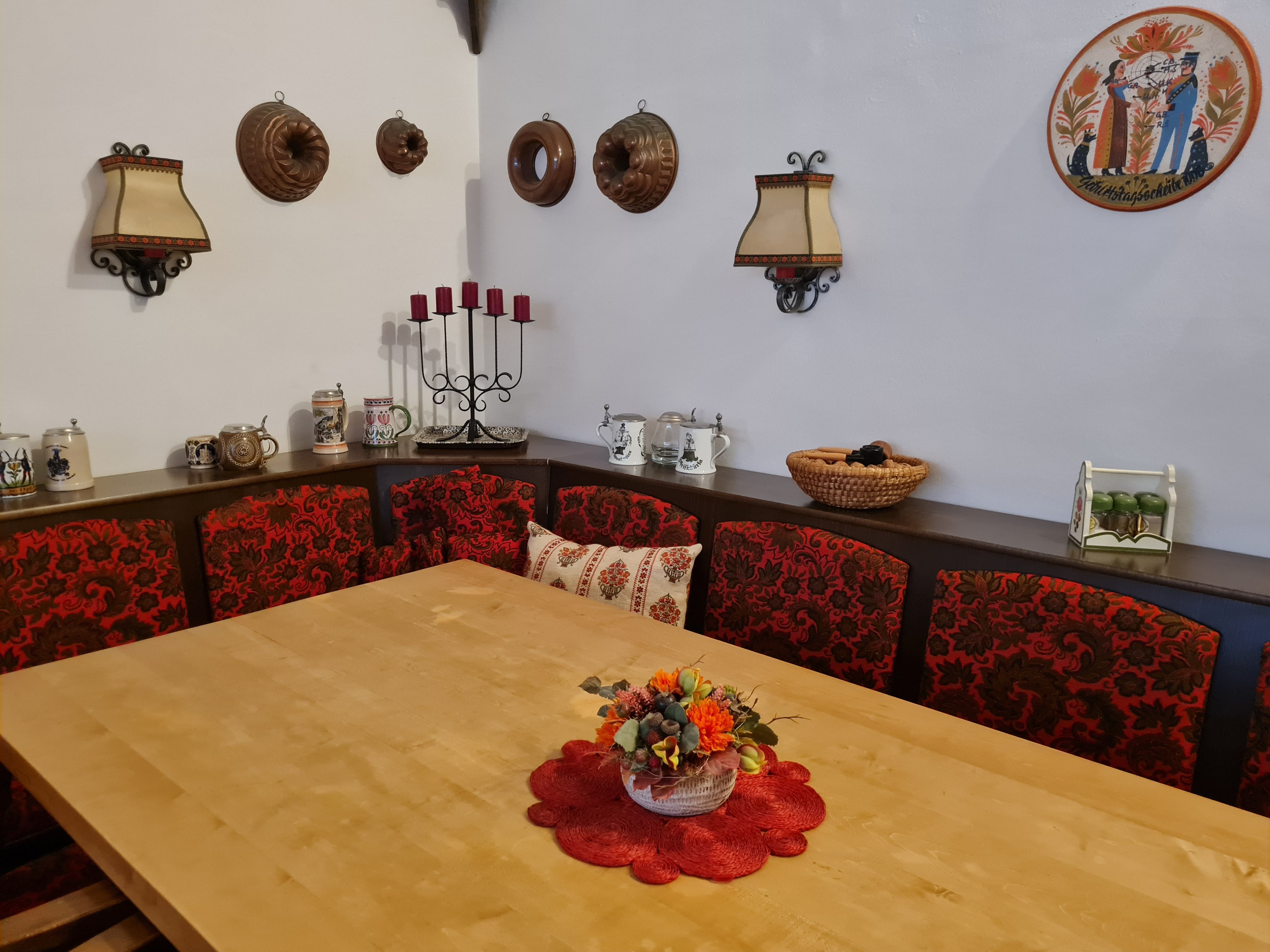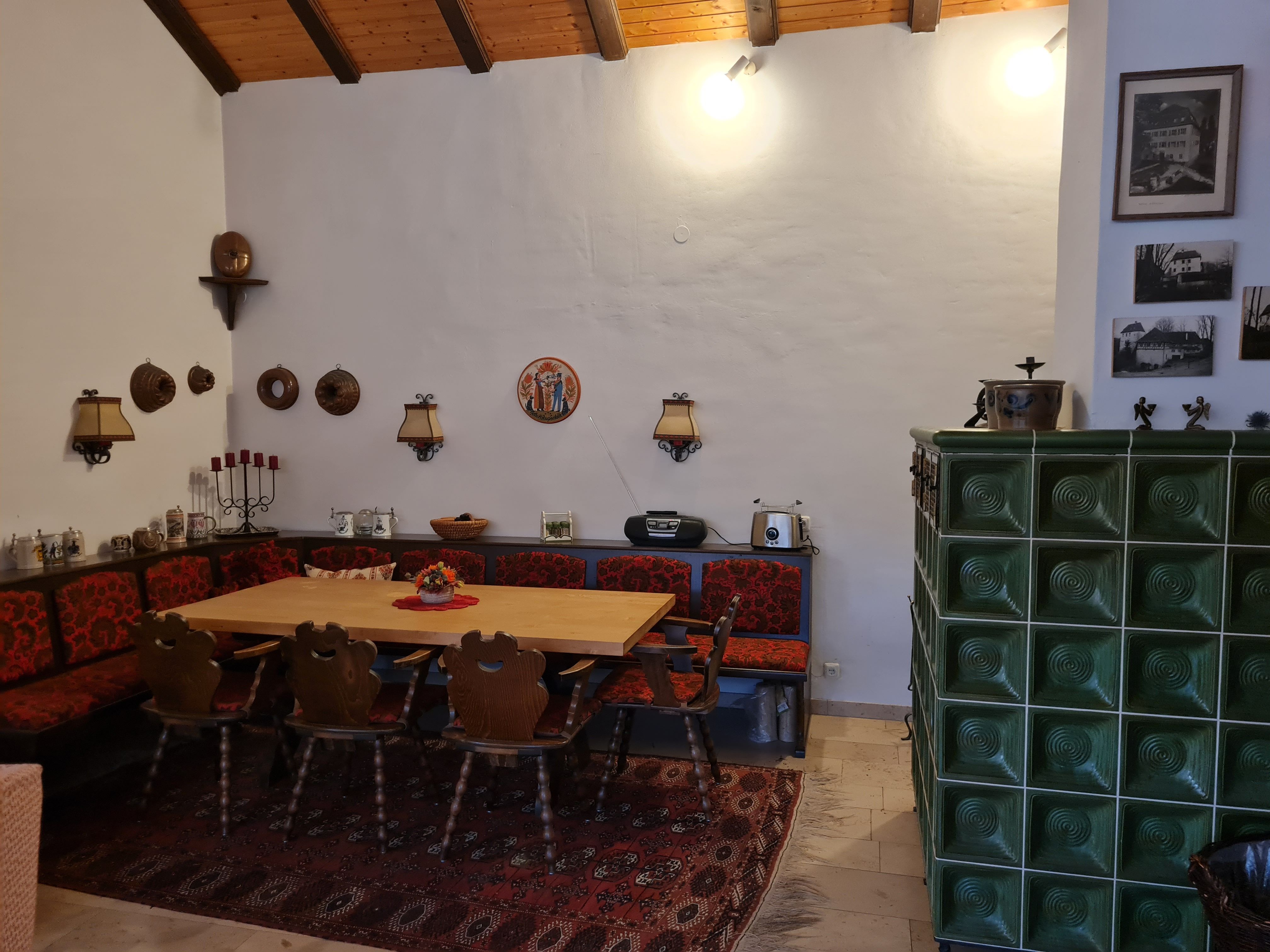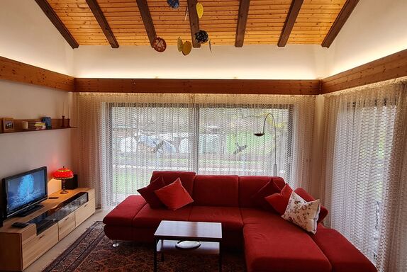 Im offenen, großzügigen Wohnzimmer befindet sich ein großer Esstisch mit Eckbank für 10 bis 12 Personen und ein großes Ecksofa; hier können Sie gemütliche Urlaubstage im Kreise Ihrer Freunde und Familie verbringen, für Wärme sorgt ein Kachelofen sowie ein Kaminofen.