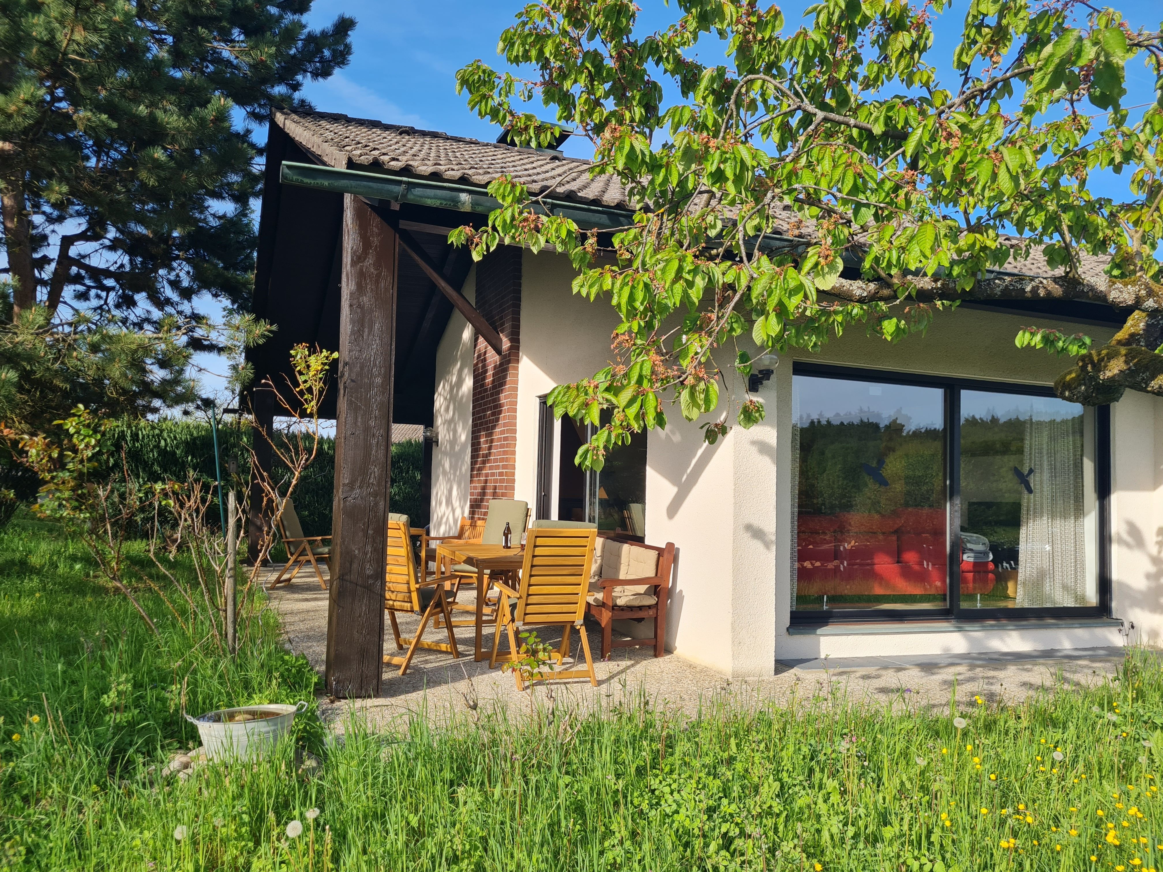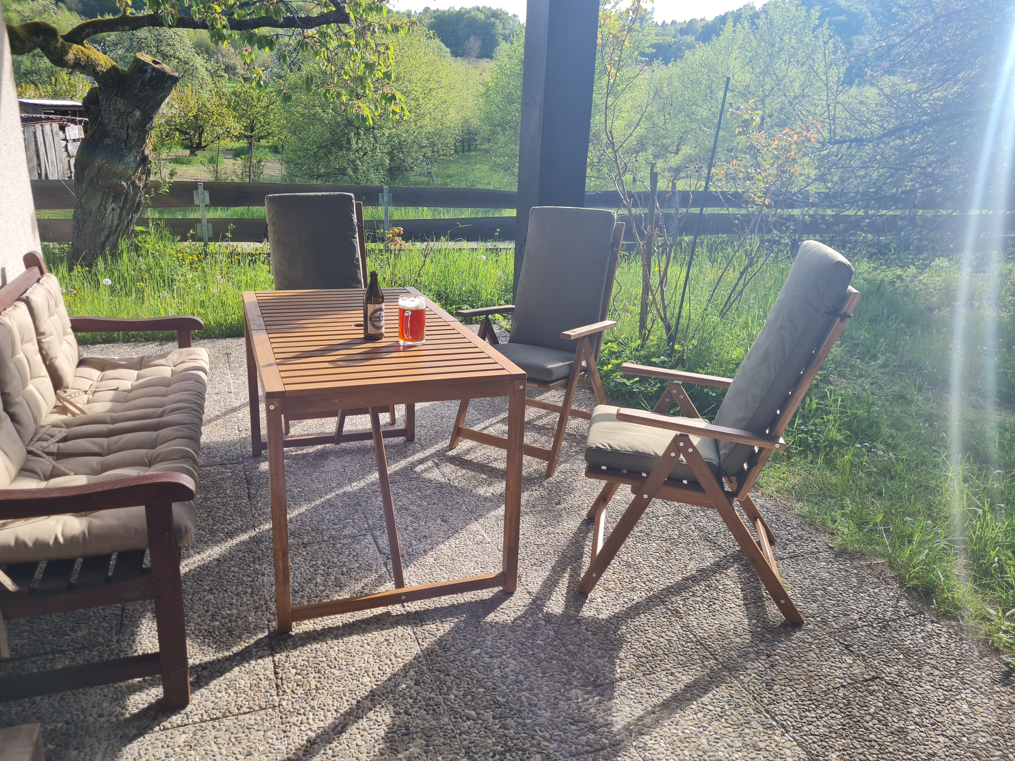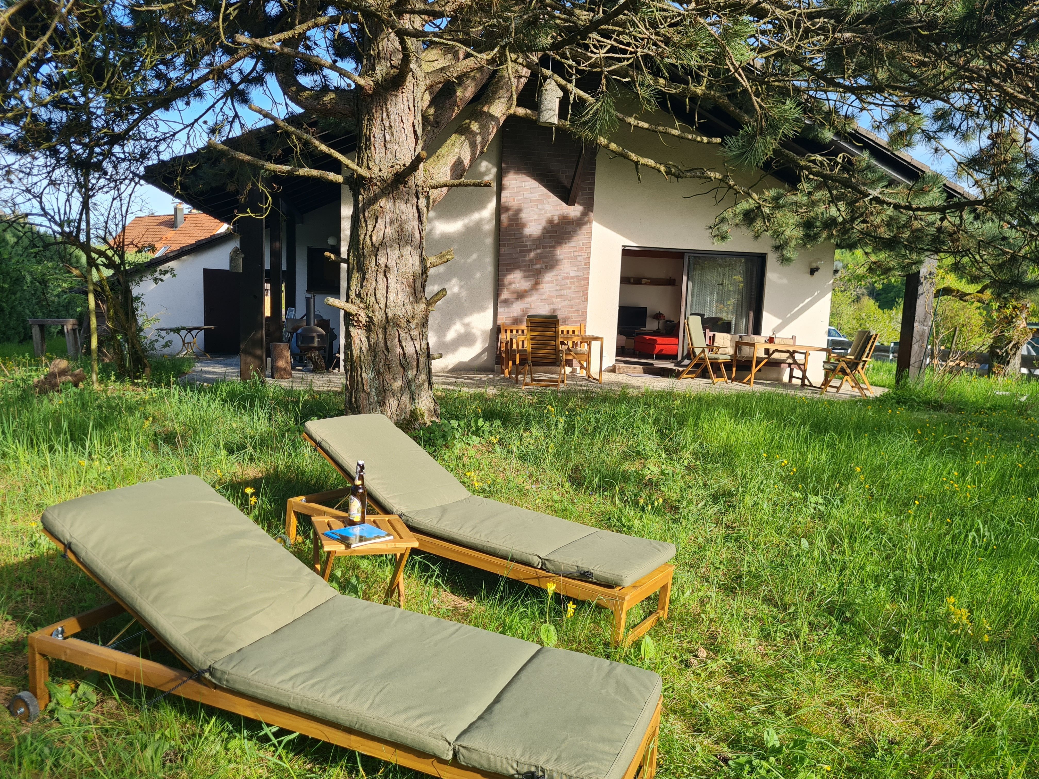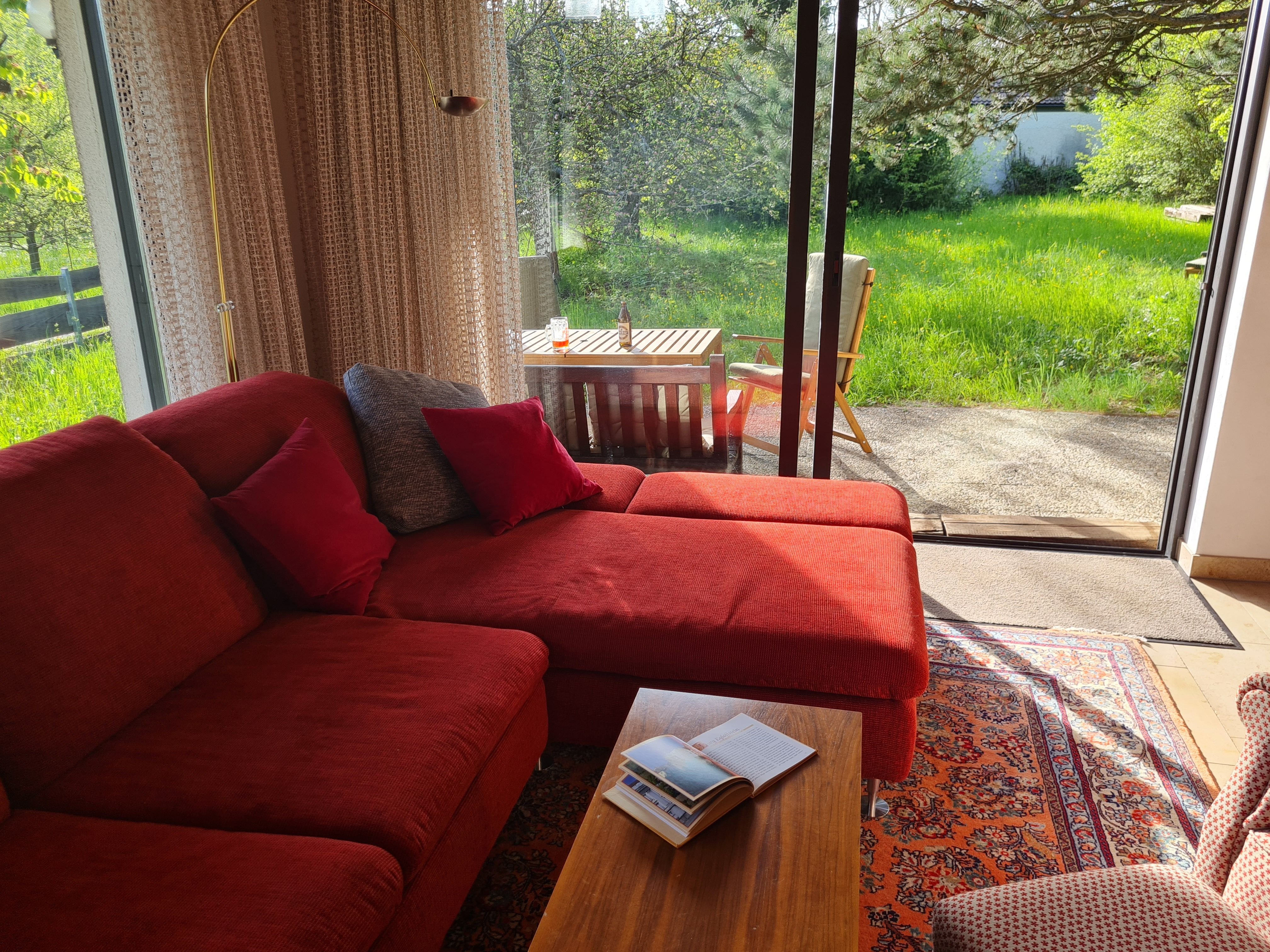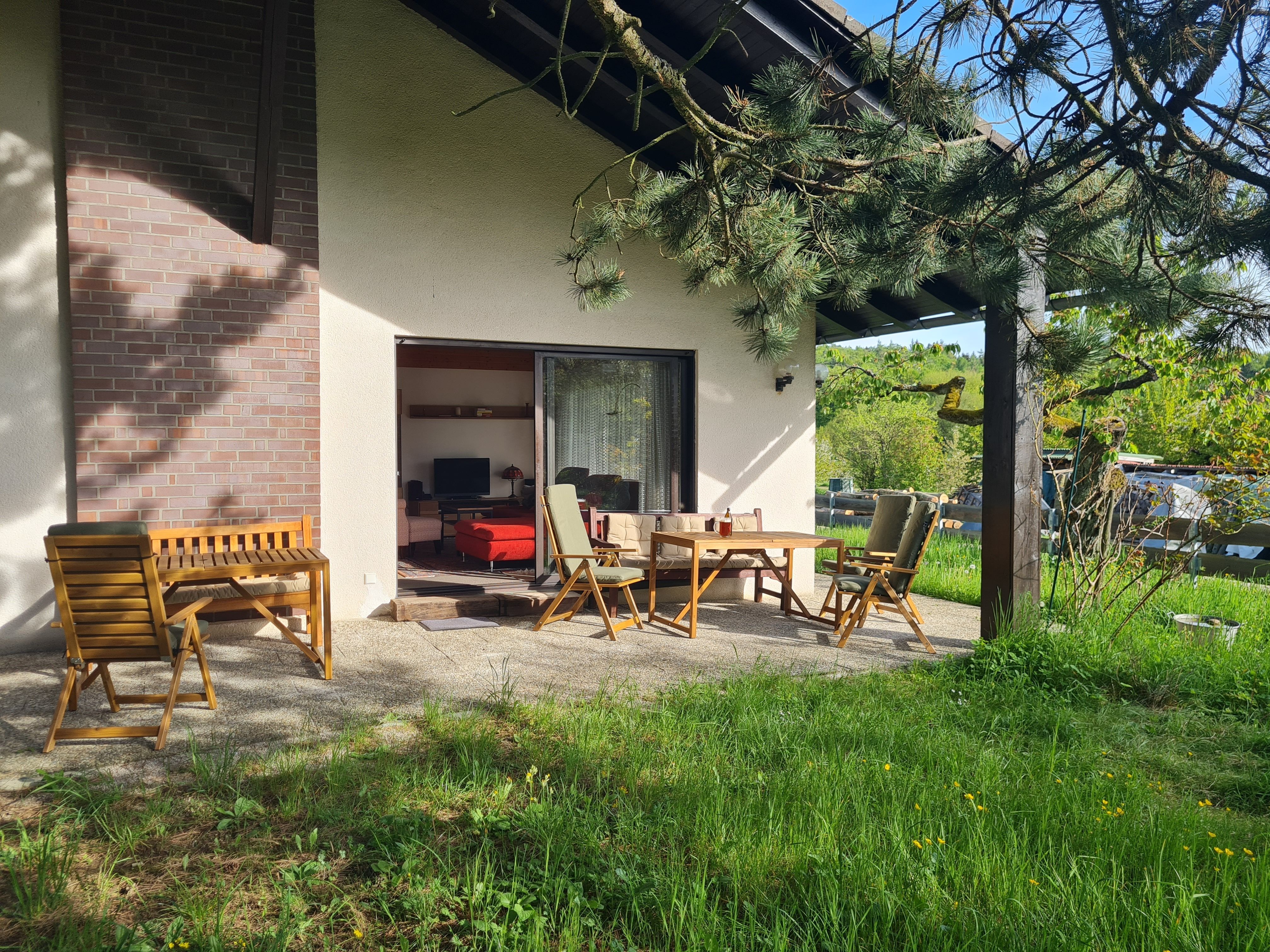 Vom großzügigen Wohnzimmer geht der Blick auf die Streuobstwiesen und Wälder der Fränkischen Schweiz. Auf der großen überdachten West-Terrasse können Sie grillen, gemütlich entspannen und die Natur bei einem fränkischen Seidla Bier genießen. Parkplätze im Einfahrtbereich stehen ausreichend und selbstverständlich kostenlos zur Verfügung, das Grundstück ist komplett umzäunt. Ihre Wanderung kann direkt vor der Haustür beginnen.