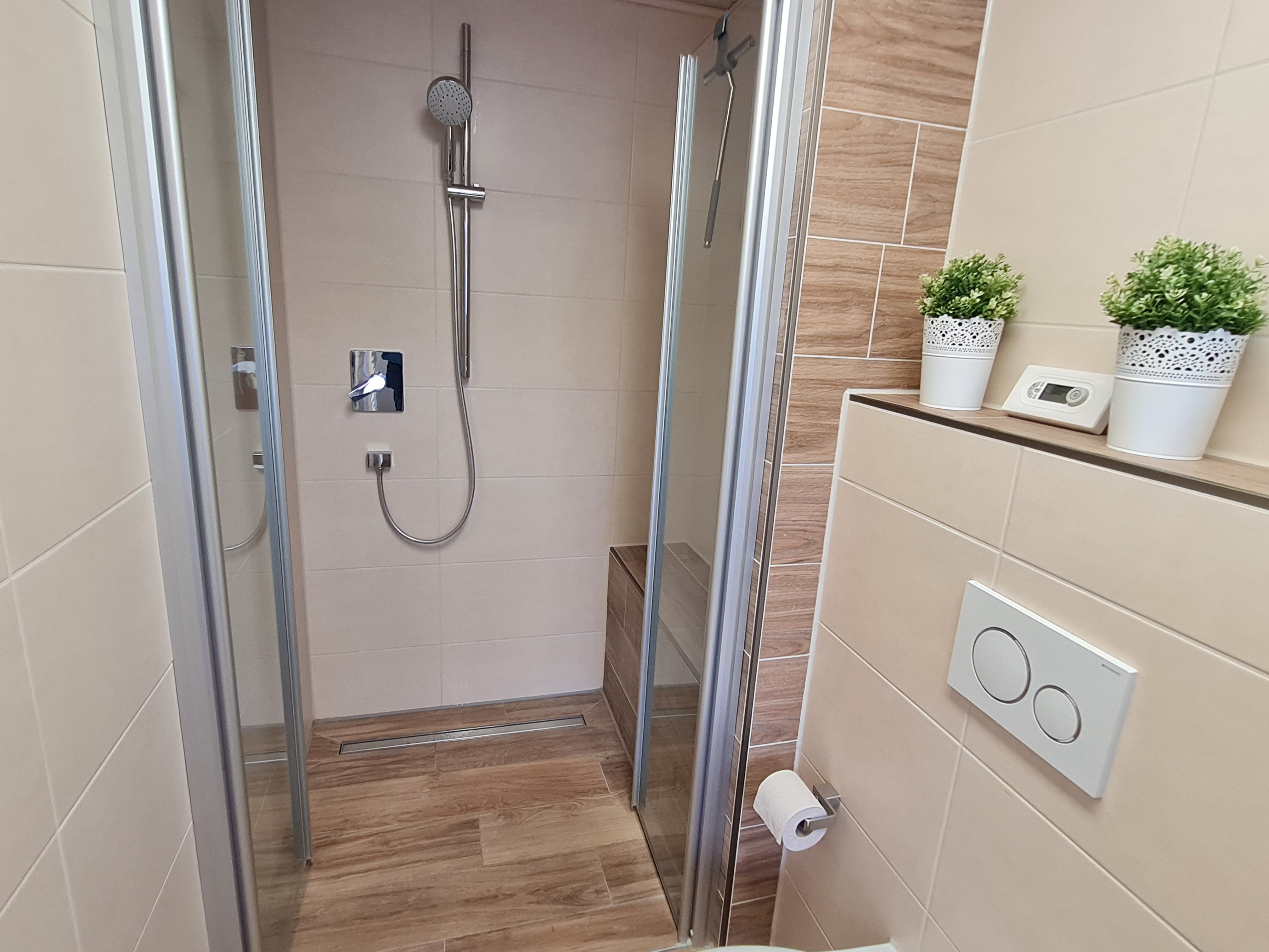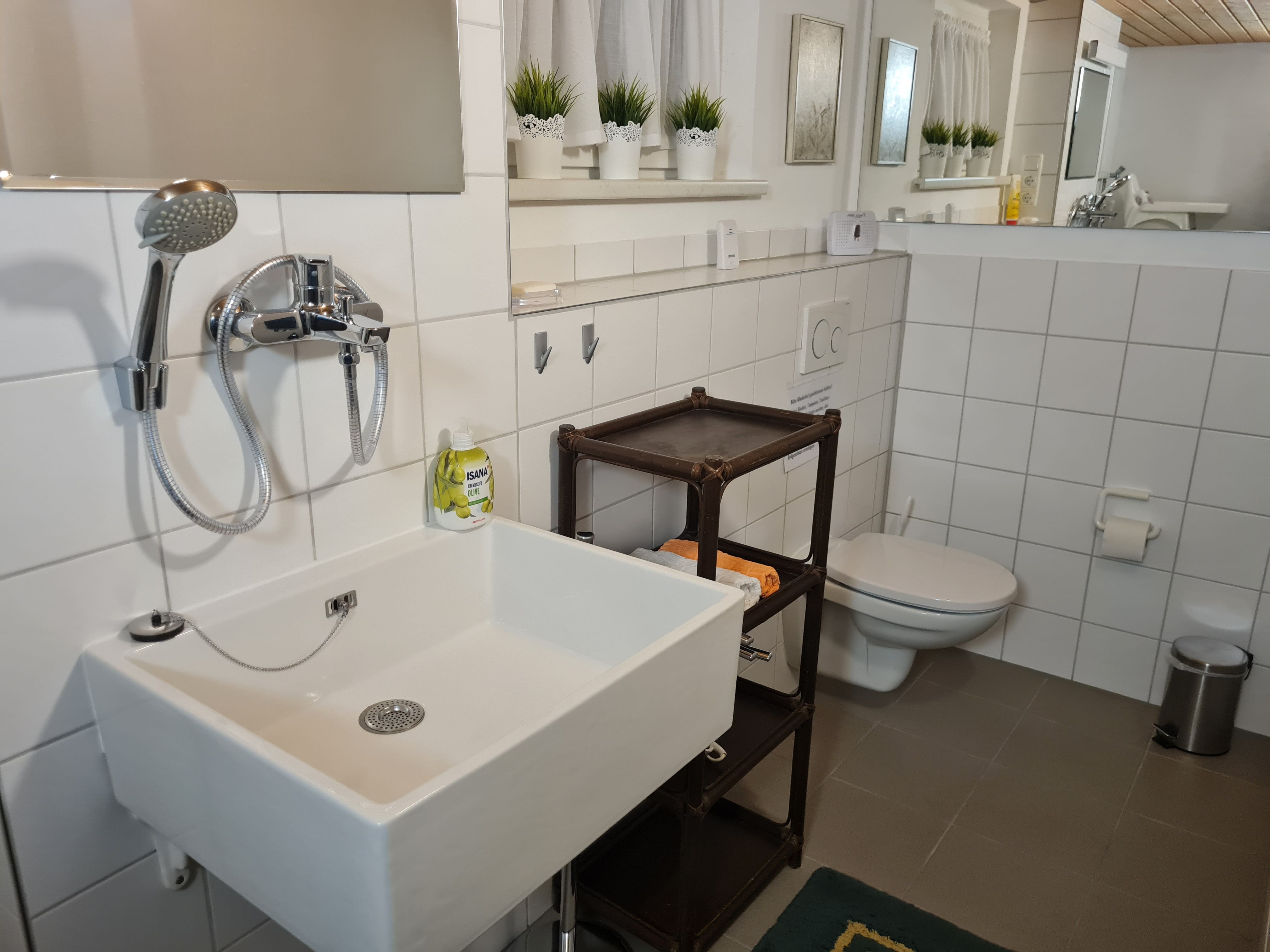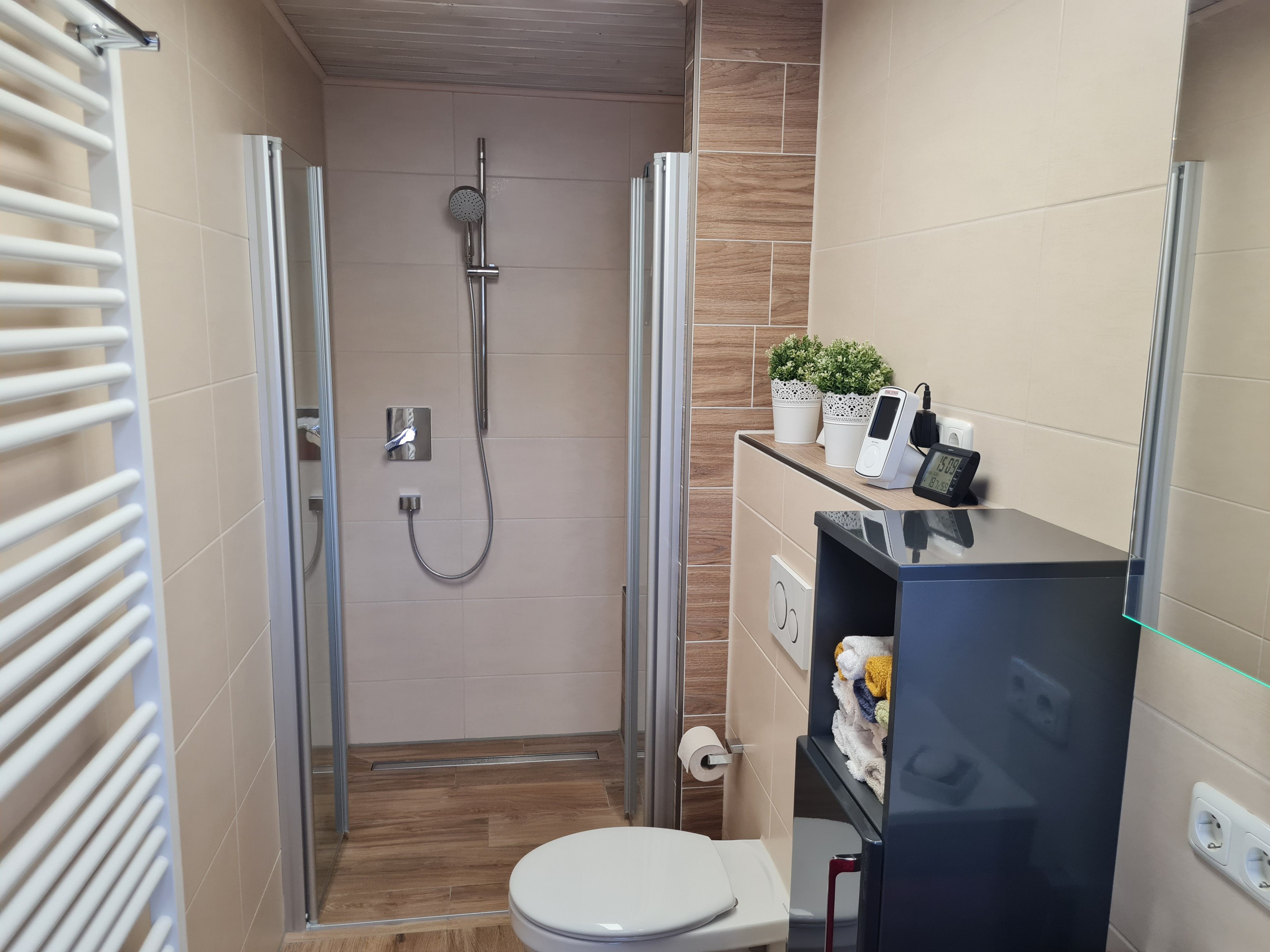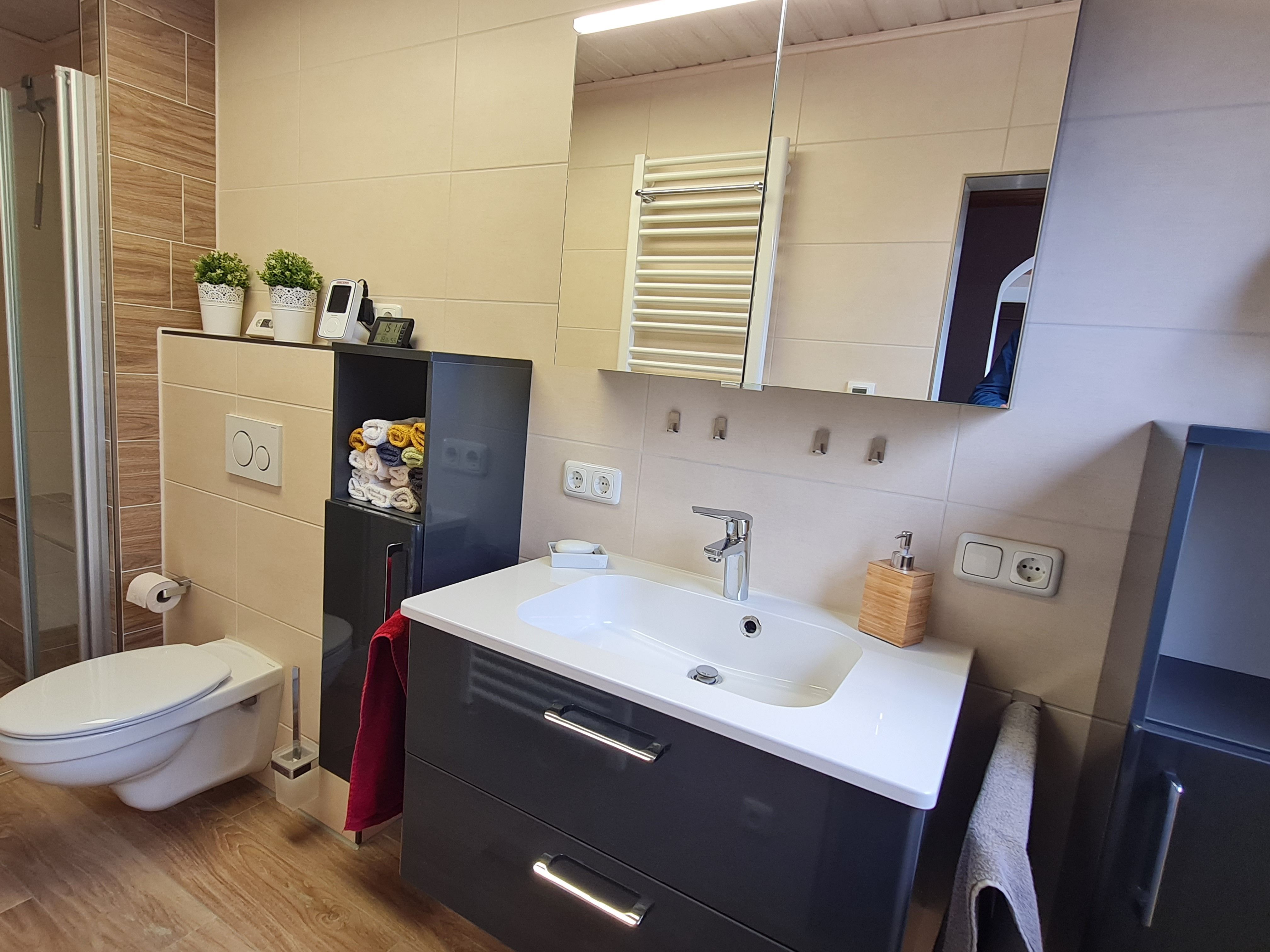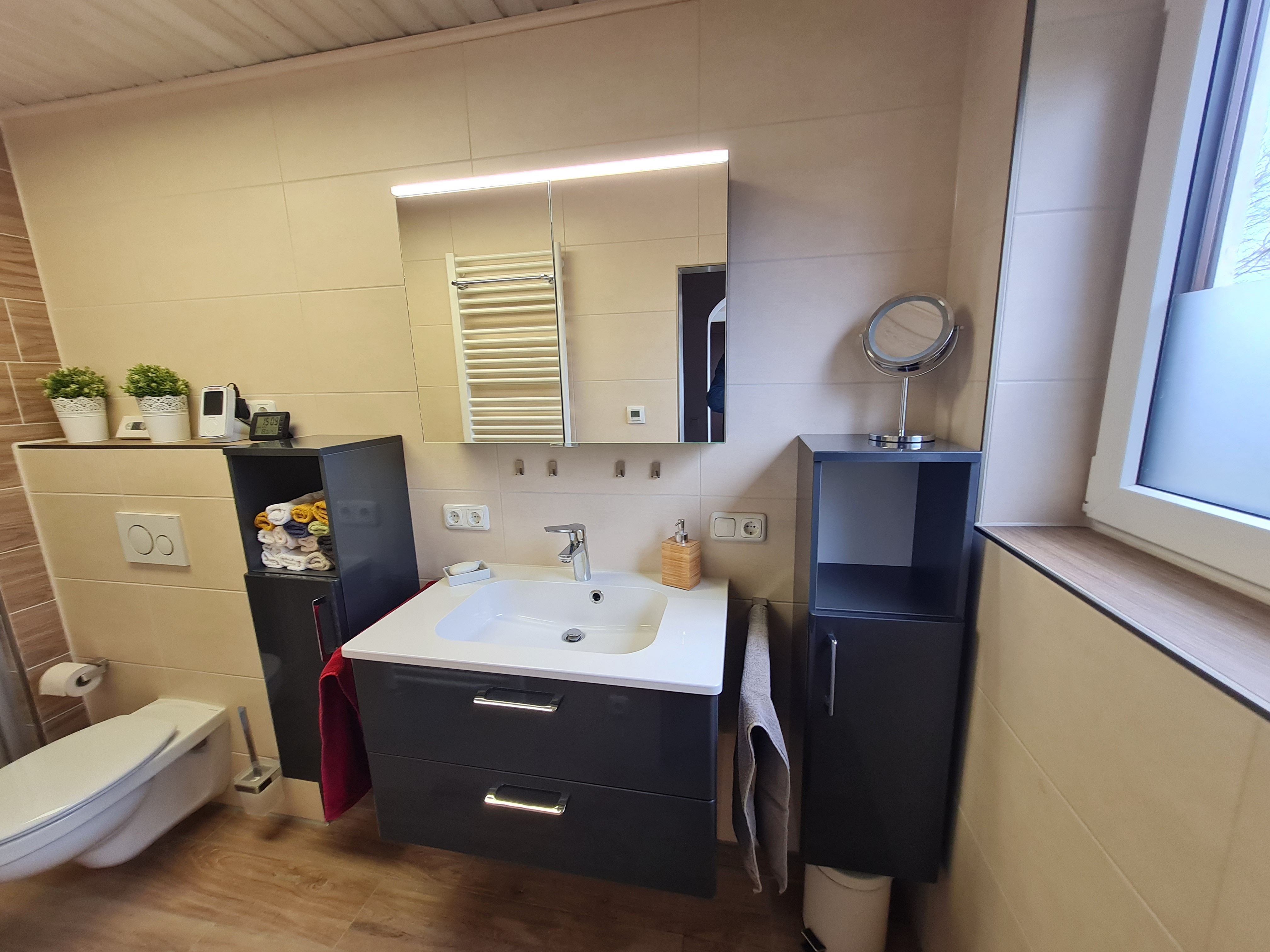 Modernes Badezimmer im Erdgeschoß mit WC, großem Waschbecken incl. Spiegelschrank, bodenebener Dusche, Fußboden- und Handtuchheizung (incl. Haartrockner);