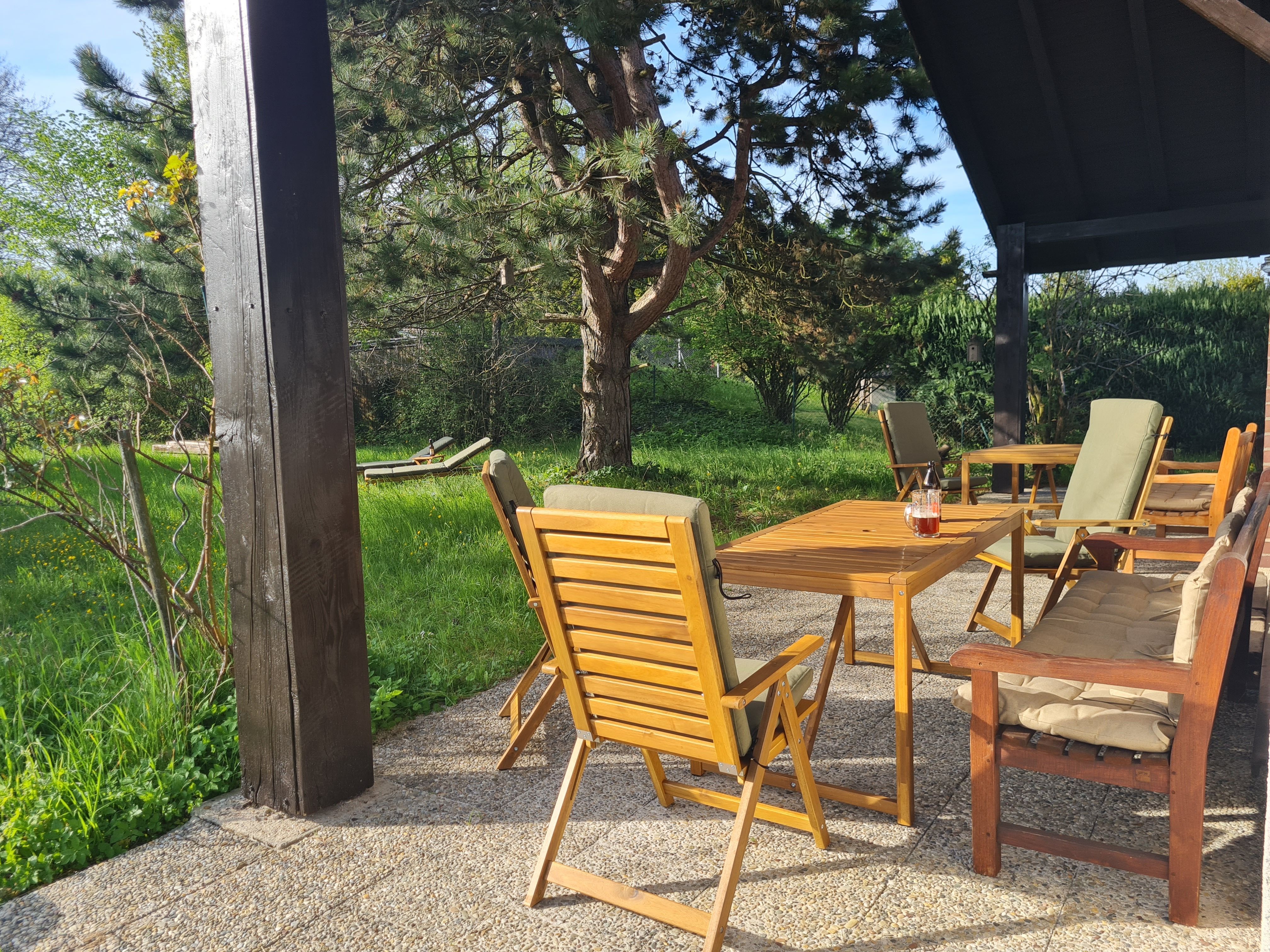Auf der großen überdachten Terrasse finden Sie Tische und ausreichend Sitzmöglichkeiten sowie zwei Sonnenliegen mit Polstern. Zwei Holzkohlegrills sind ebenfalls vorhanden.
