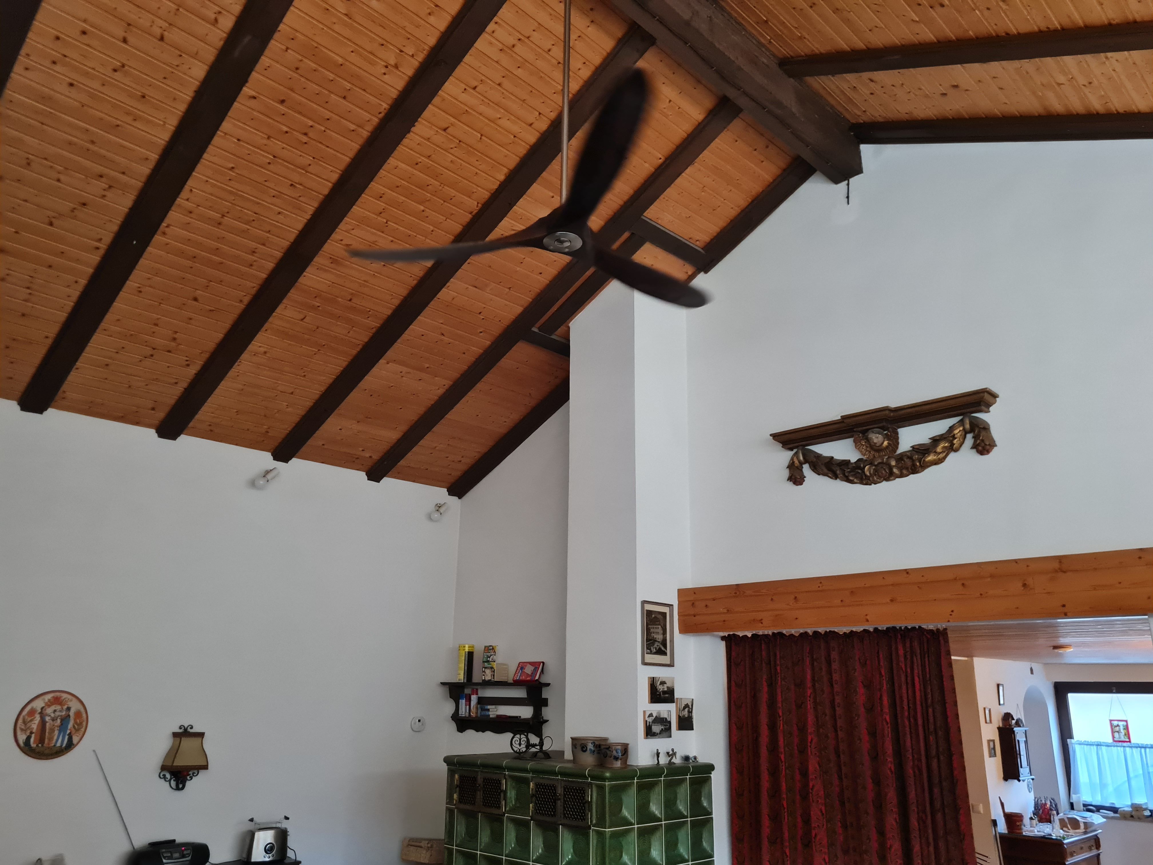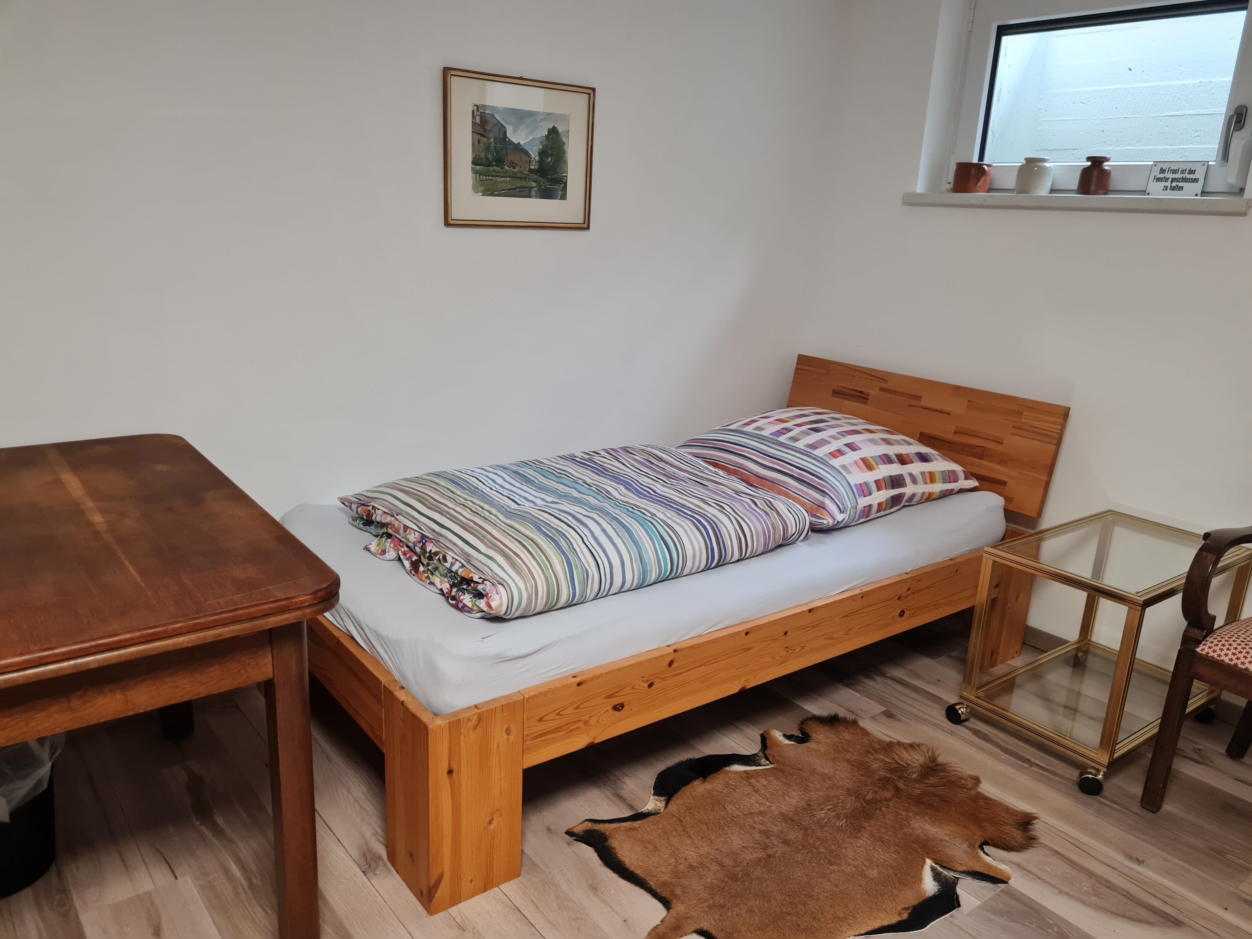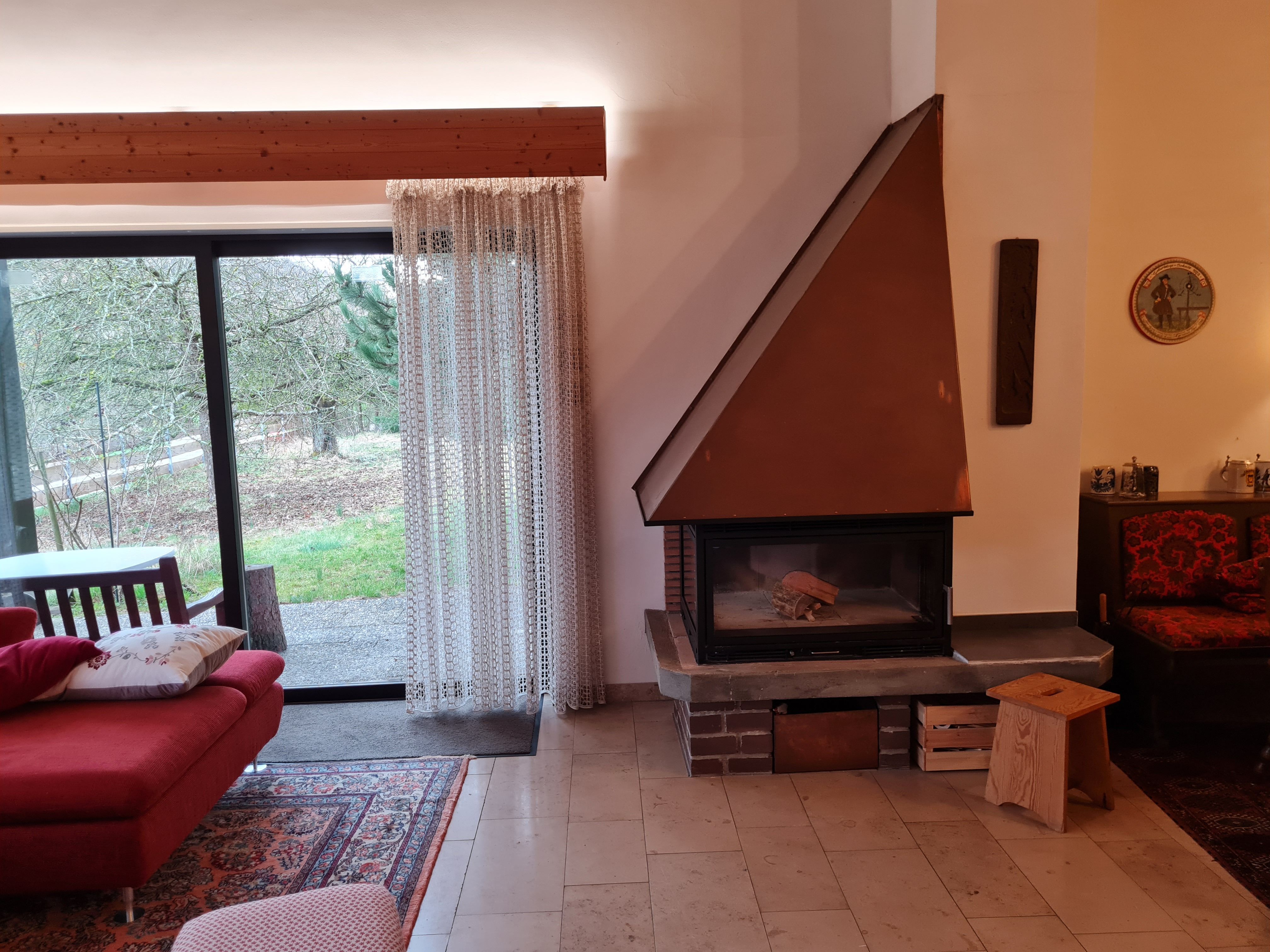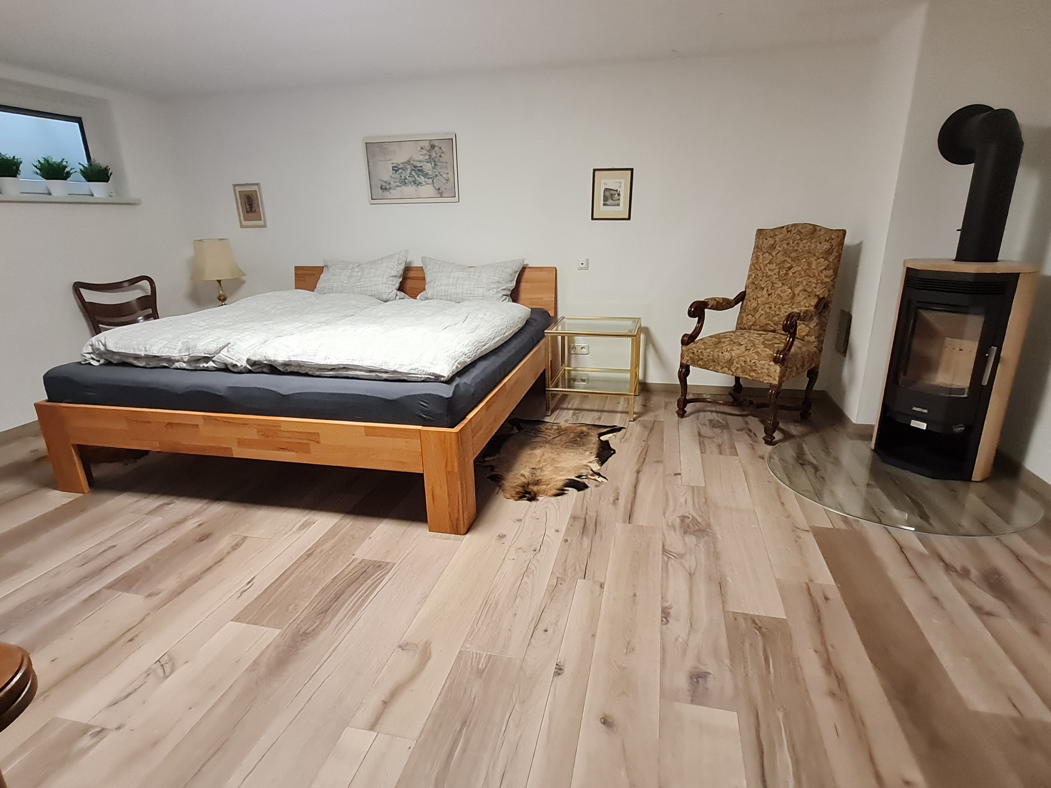 1 Schlafzimmer im Untergeschoss mit Doppelbett (2m x 2m) sowie einem Einzelbett (1m x 2m); in der Übergangszeit sorgt der gemütliche Kaminofen für kuschelige Wärme;