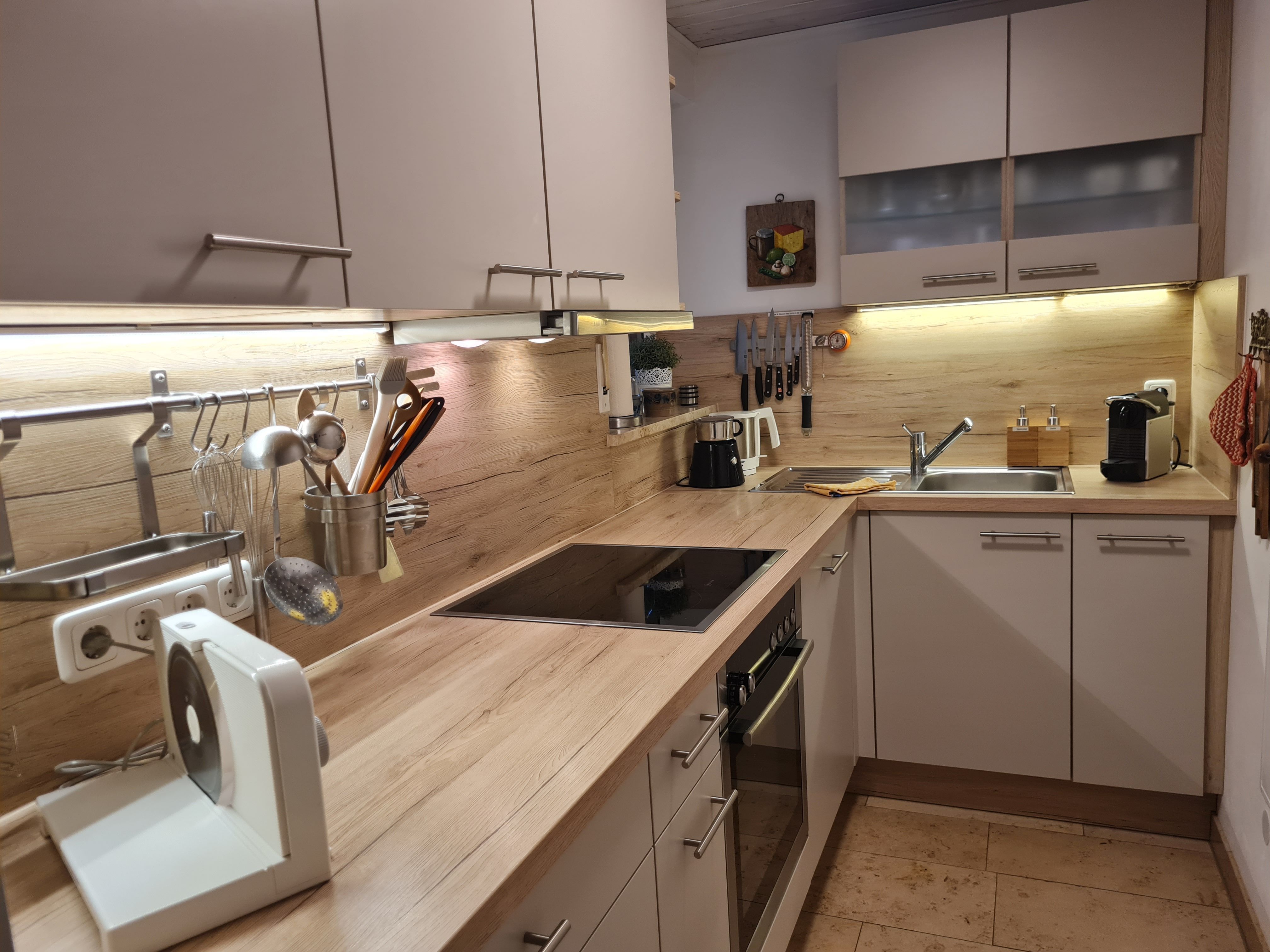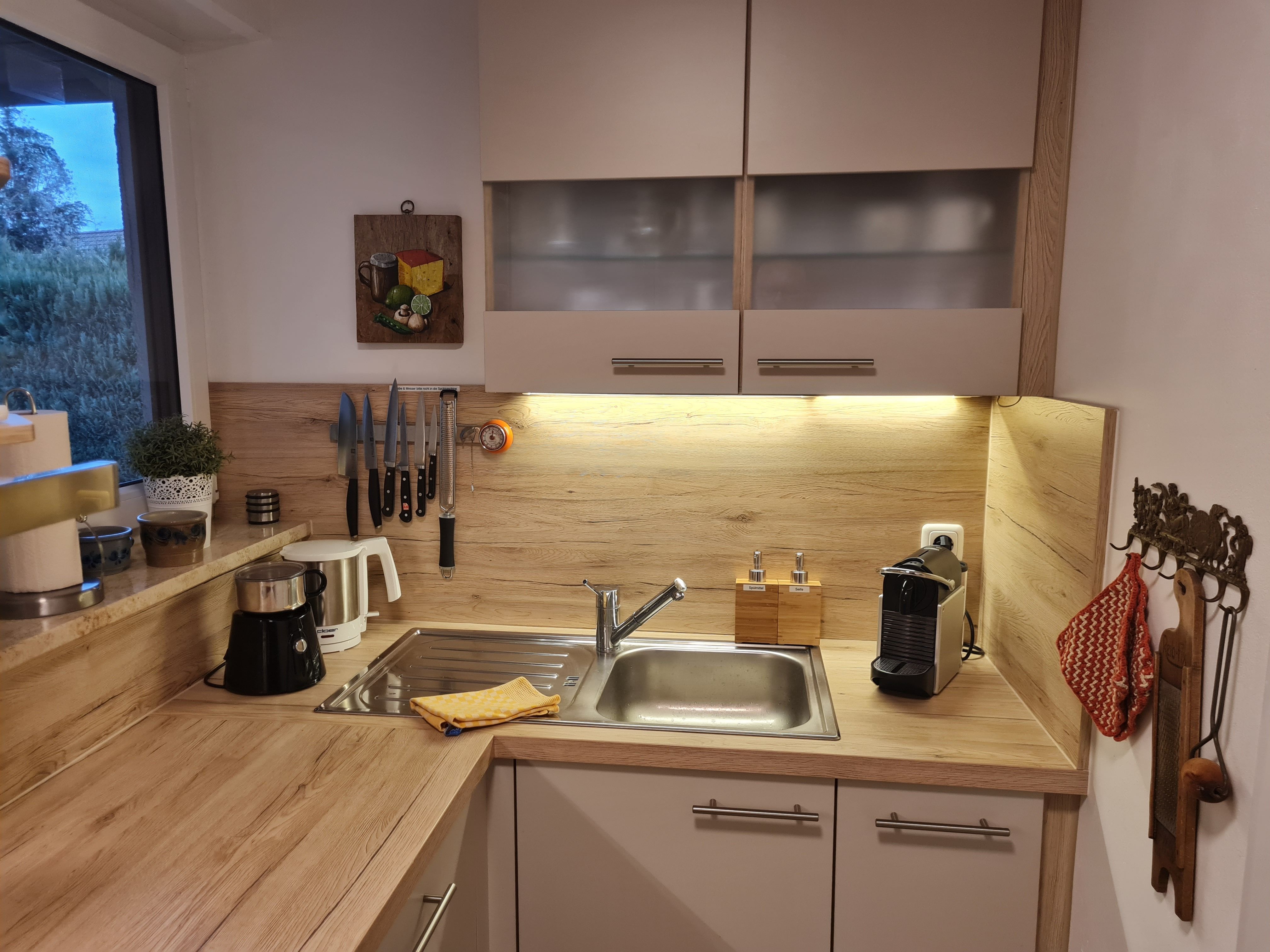 Die separate Küche ist u.a. mit einem Kühlschrank mit großem Gefrierfach, einem Herd mit Backofen sowie einer Spülmaschine komplett ausgestattet. Sie finden hier neben Kaffeemaschine, Nespresso-Maschine, Milchaufschäumer, Toaster, Wasserkocher und Küchenmaschine, auch Zucker, Salz, Mehl, diverse Gewürze, Essig/Öl, Kaffeefilter, diverse Tees, Küchenrolle, Spülmittel, Spülmaschinentabs.