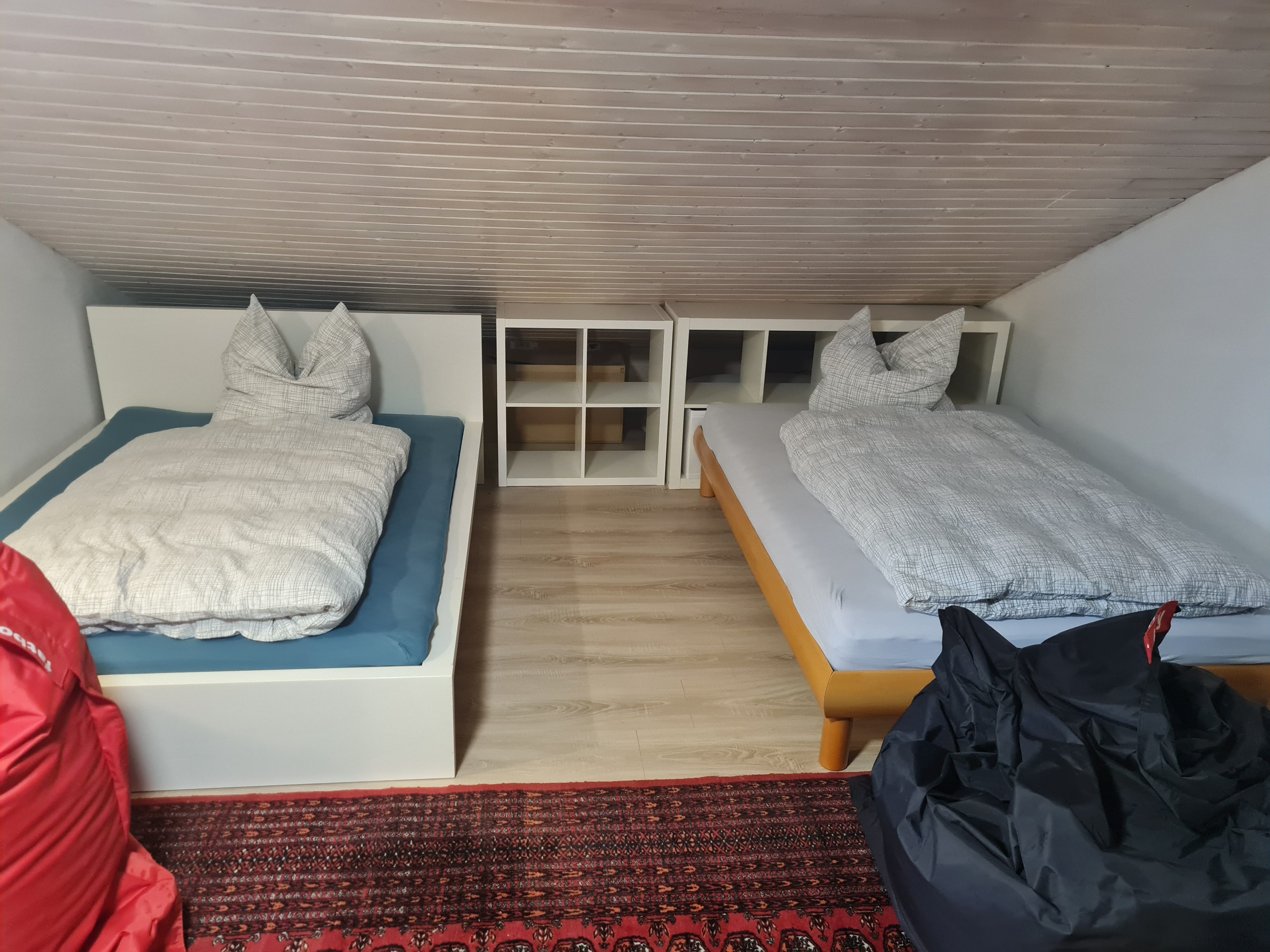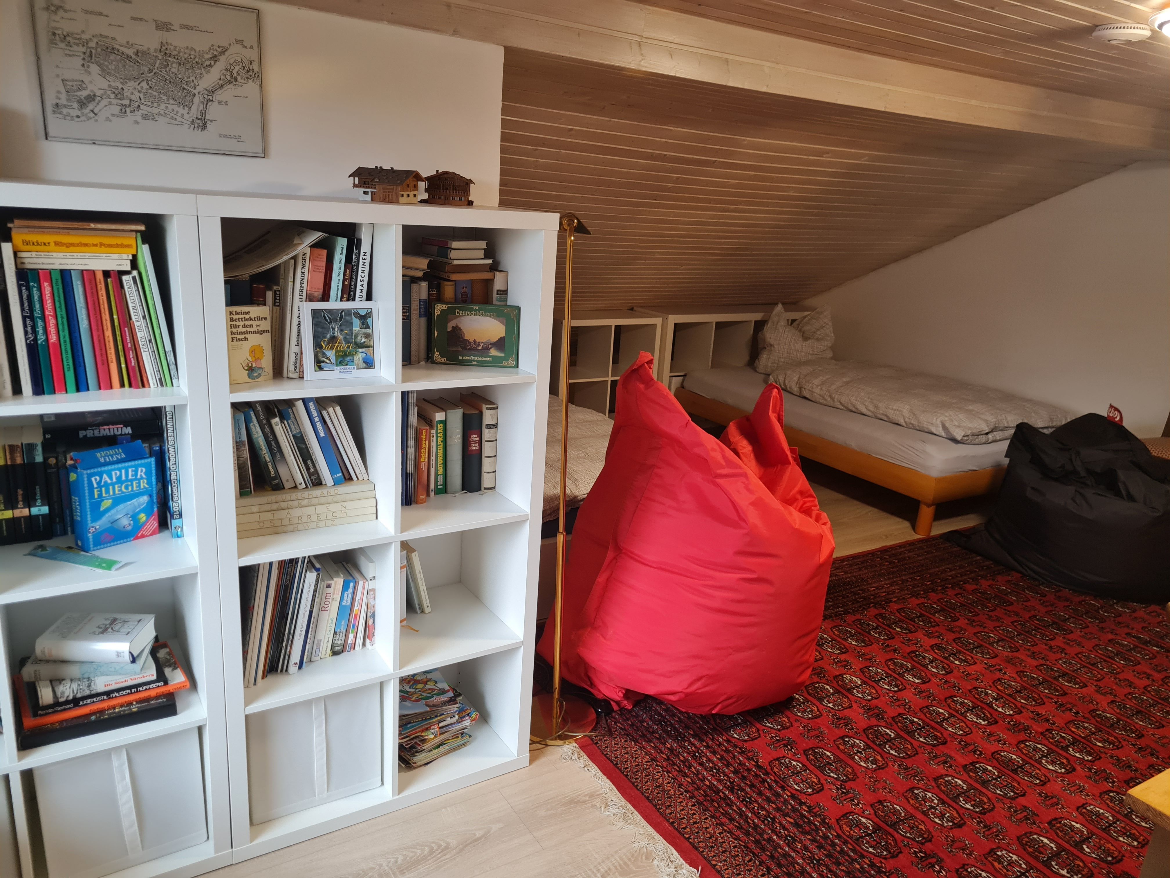 1 Schlafzimmer im Dachgeschoss mit drei französischen Betten (jeweils 1,40m x 2m), einem kleinen Schreibtisch und Platz zum Spielen / Lesen;