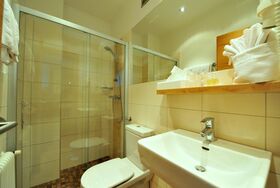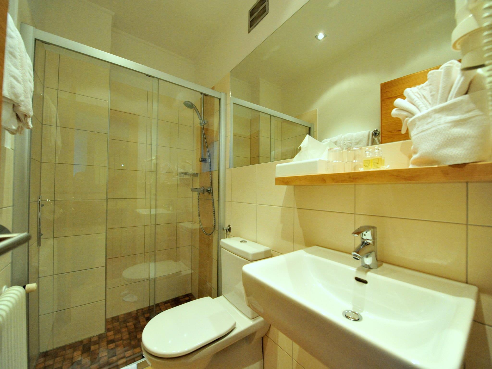 Familienzimmer(mit Verbindungstür) mit Dusche, WC und Balkon. Kabel-TV,Haarföhn,Zimmersafe und Radiowecker. Bademantel u. Badepantoffel