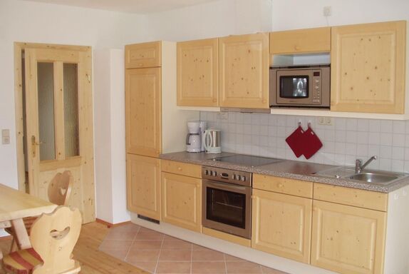 Wenig Jahre alte geräumige - bäuerlich eingerichtete - Ferienwohnung. Eine große Wohnküche, drei Schlafzimmer, WC u. Bad getrennt. Großer Vorraum (ideal auch für Schifahrer - Trockenmöglichkeit); Highlight: überdachter Außenbereich mit Sitzecke und Tisch (Laube)