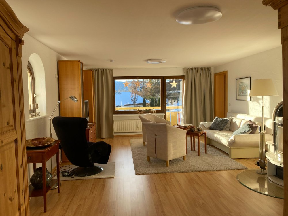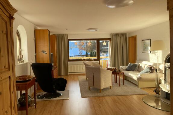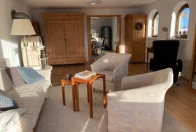 In dem großen, nach Süden ausgerichteten Wohnzimmer befinden sich die Sitzgarnitur mit Schlafsofa (150cmX200cm), Smart-TV mit Soundbar,