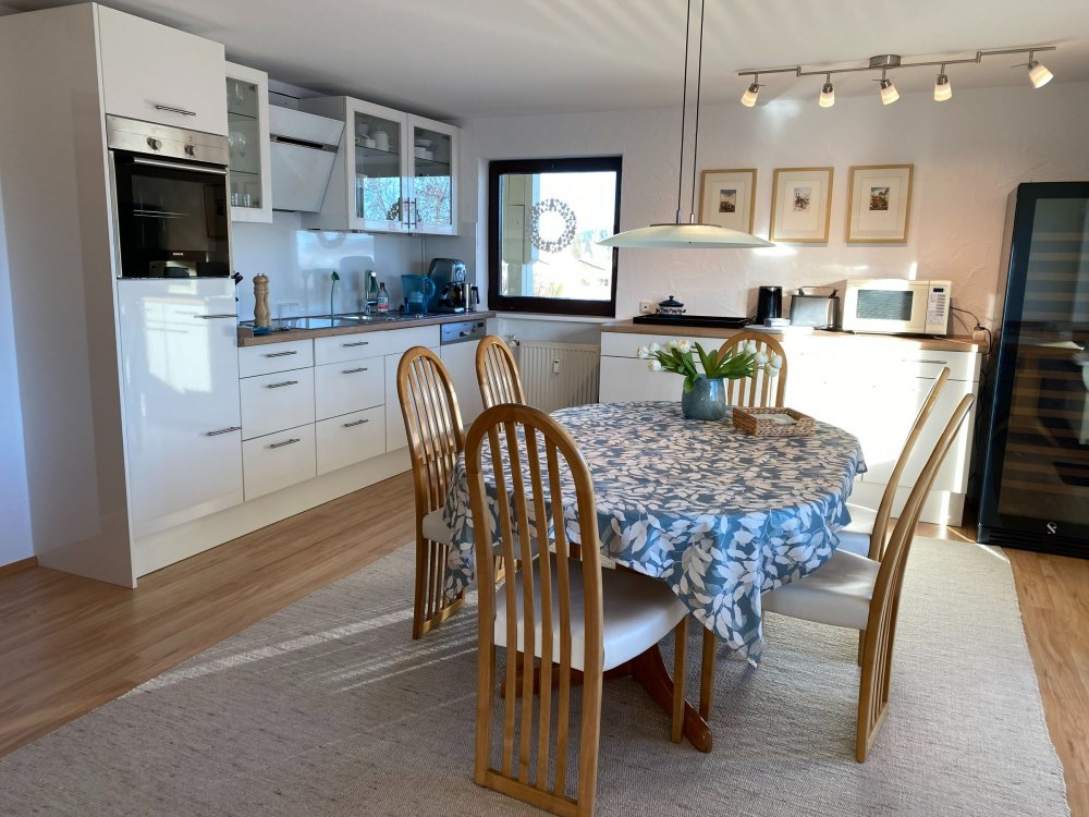 Auch die geräumige, moderne Küche erlaubt den weiten Blick ins Westallgäu.