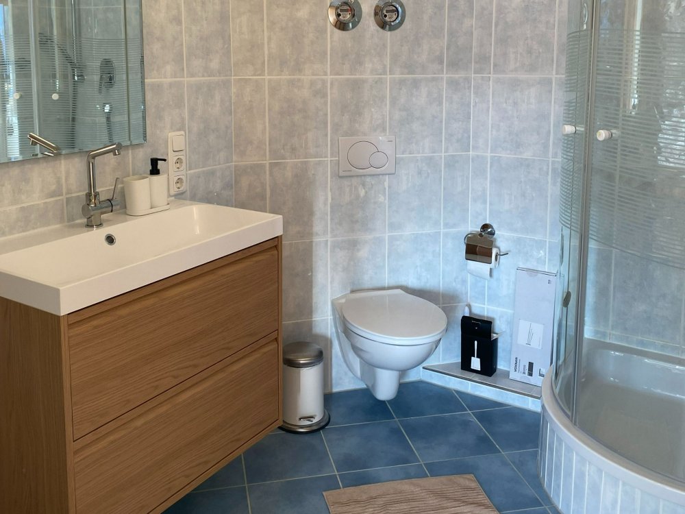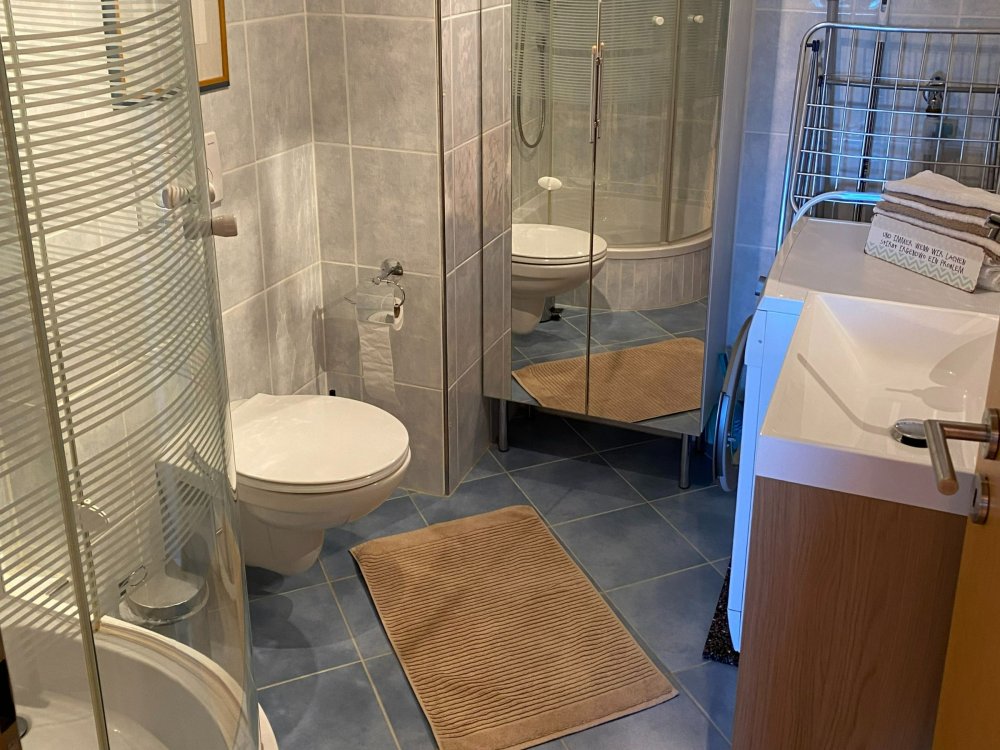 In den beiden zugehörigen Badezimmern befinden sich Dusche, WC und Waschbecken sowie eine Waschmaschine.