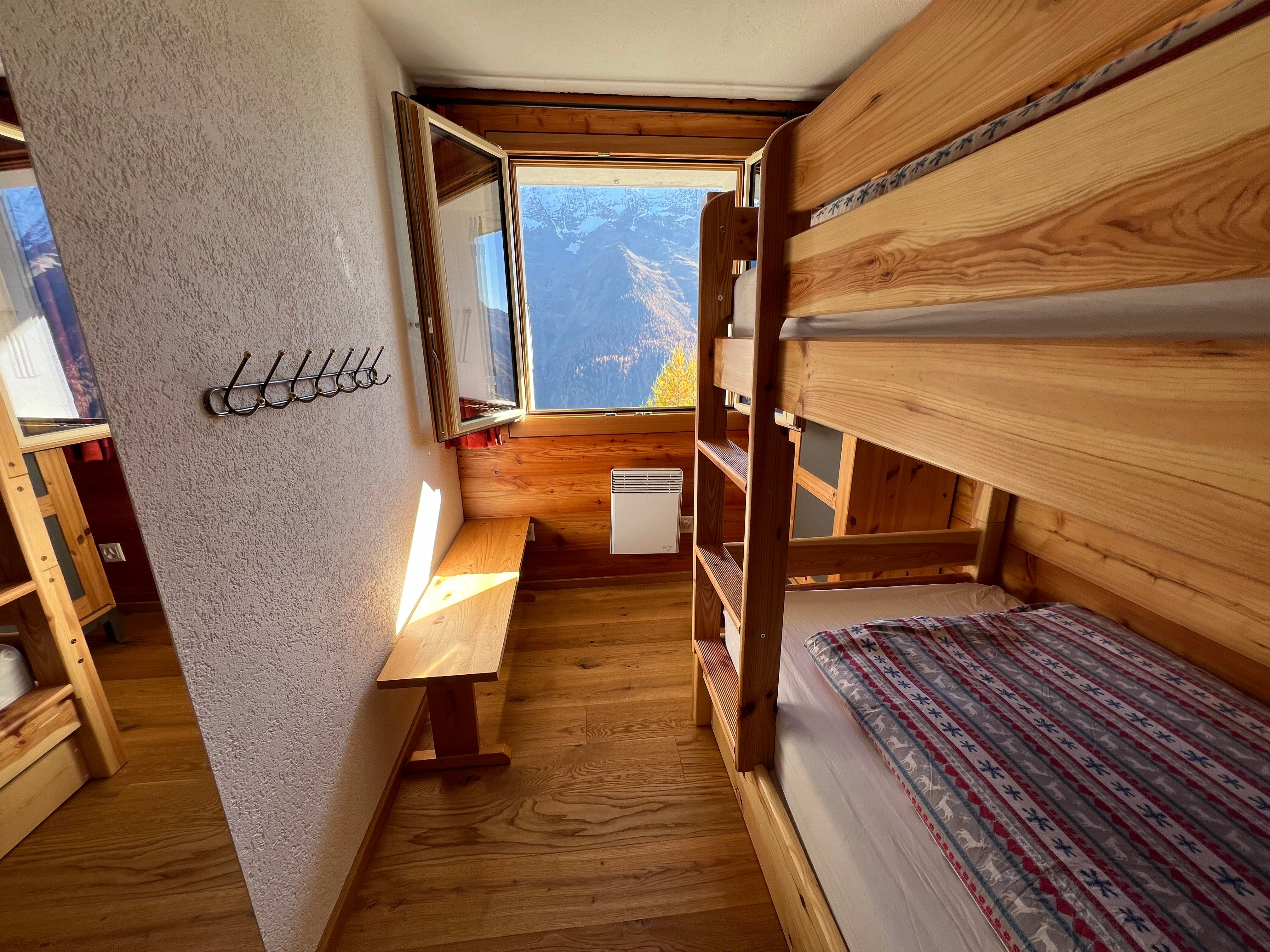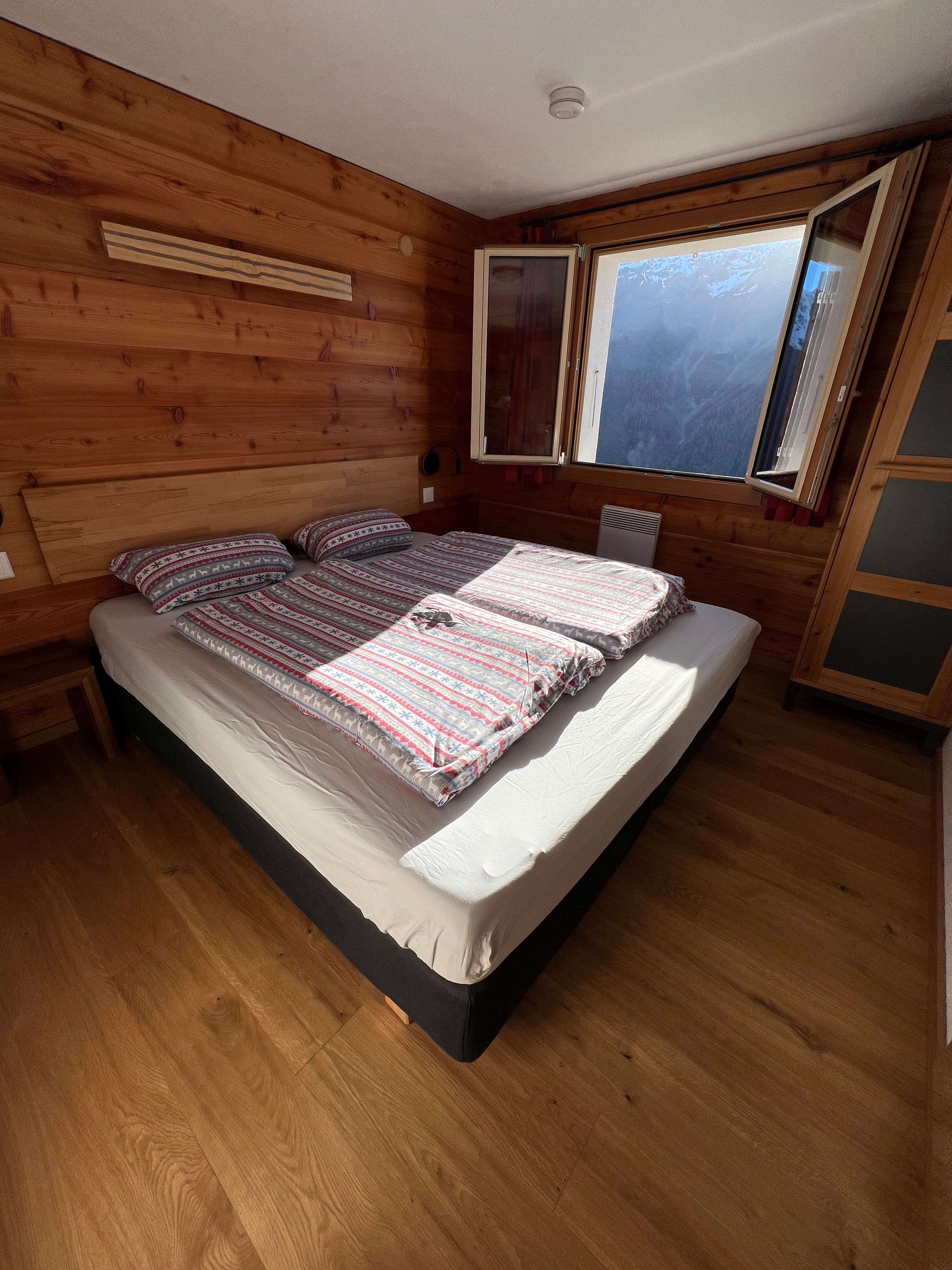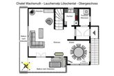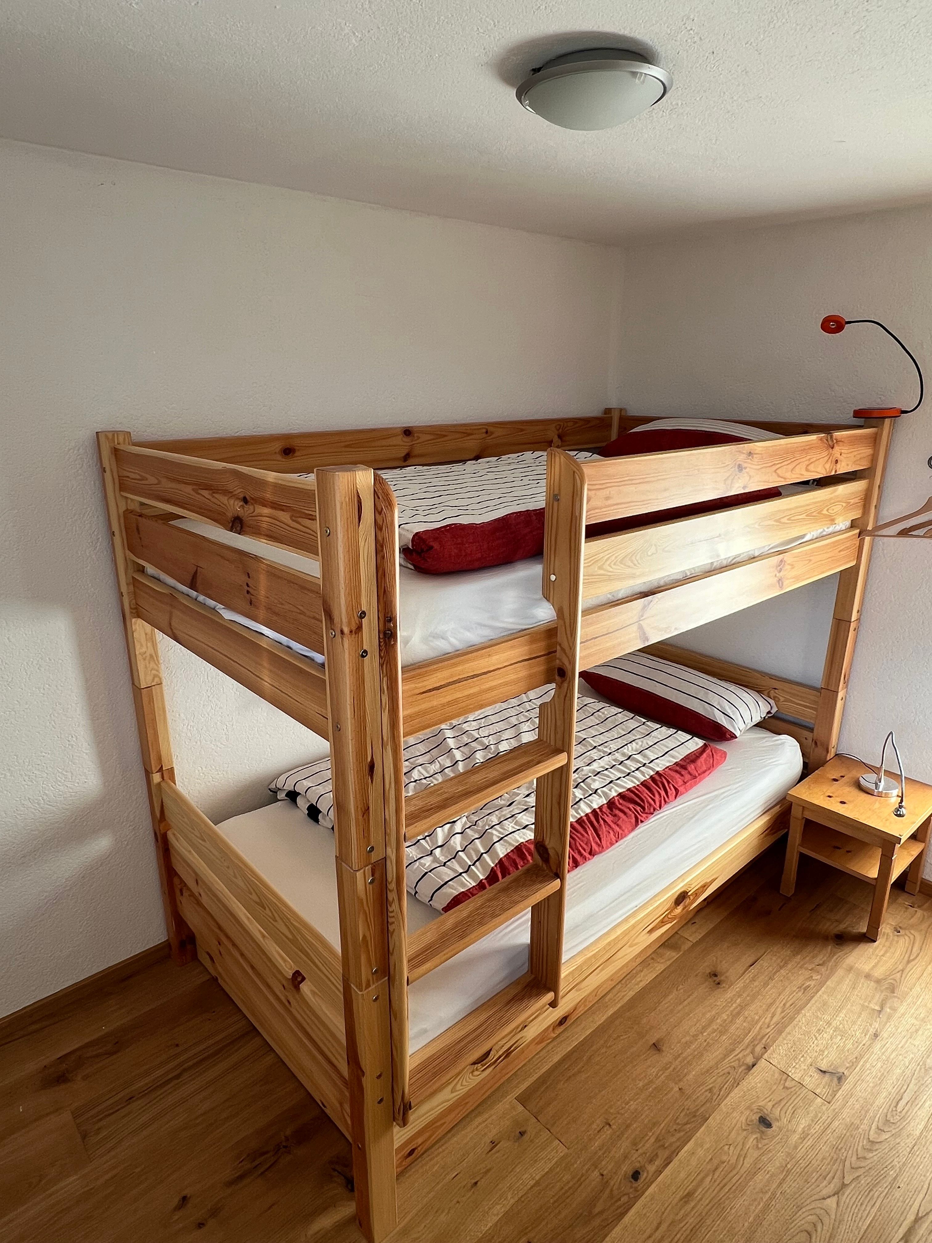 Die innere Ausstattung des Chalets lässt keine Wünsche offen. Im Obergeschoss erwartet Sie ein gemütlicher Wohnbereich, ausgestattet mit Küche, die über einen Backofen, Spülmaschine und Herd verfügt, sowie einer Essecke, die einen unvergleichlichen Panoramablick bietet. Der angrenzende Wohnbereich wird durch einen wärmespendenden Schwedenofen an kühleren Abenden und im Winter ergänzt. Im Erdgeschoss befinden sich vier einladend gestaltete Schlafzimmer – zwei mit Doppelbetten und zwei mit Etagenbetten. Eines der Schlafzimmer gewährt direkten Zugang zur Terrasse. Zusätzlich stehen Ihnen zwei moderne Badezimmer mit Dusche, Waschbecken und WC zur Verfügung.