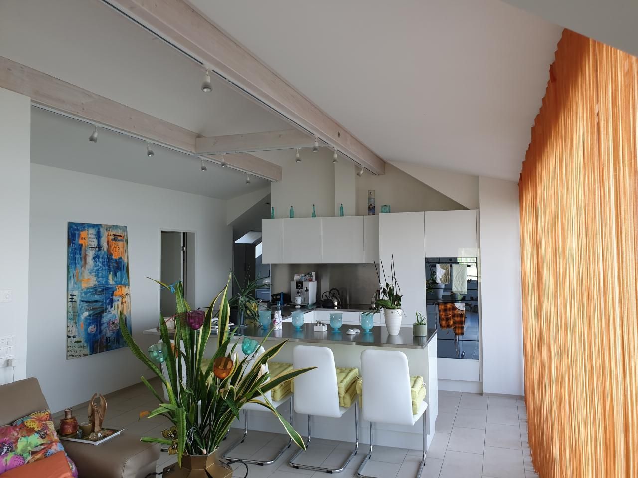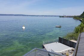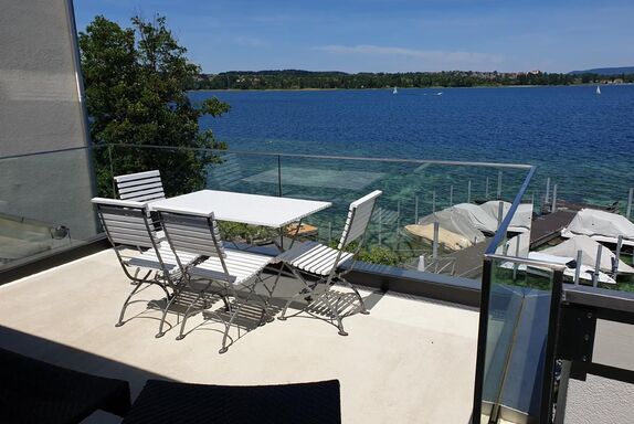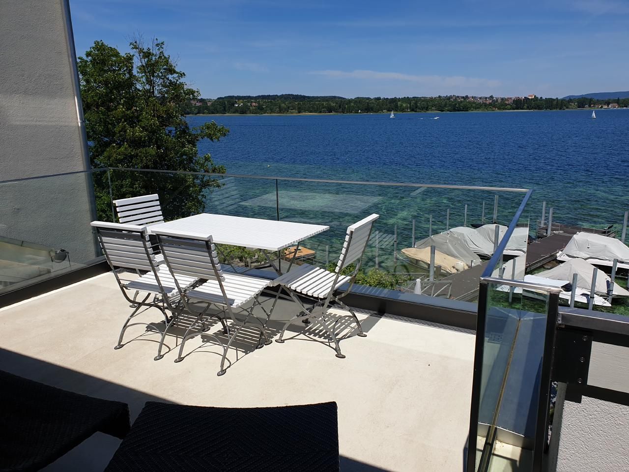 3,5 Zimmer 100 m2 ***** Attika-Wohnung mit Bootsliegeplatz in privater Marina für 4 Personen ist einzigartig dank Lage, Aussicht, Komfort, Design, Ruhe und Privatsphäre. Grosszügige Terrasse mit ausladendem Sonnenstoren lädt zum Geniessen der traumhaften Seesicht mit Privatsphäre und parkähnliche Marina zum Eintauchen in vielfältige Wasseraktivitäten und zum Aufenthalt in entspannter Sommeratmosphäre mit direktem Seeanstoss ein. Das lichtdurchflutete Penthouse ist bequem von allen Ebenen mit Lift erreichbar und mutet mit der Design Einrichtung und Komfort Ausstattung mit sandfarbenem Eichenparkett-, Fliessen- und Terrassenboden sowie hellem Ambiente mit fröhlichen Farbtupfern an das unbeschwerte Leben am Wasser mit seinen variantenreichen Lichtspielen zu jeder Tages-, Nacht- und Jahreszeit an mit Opportunität zur Langzeitmiete.