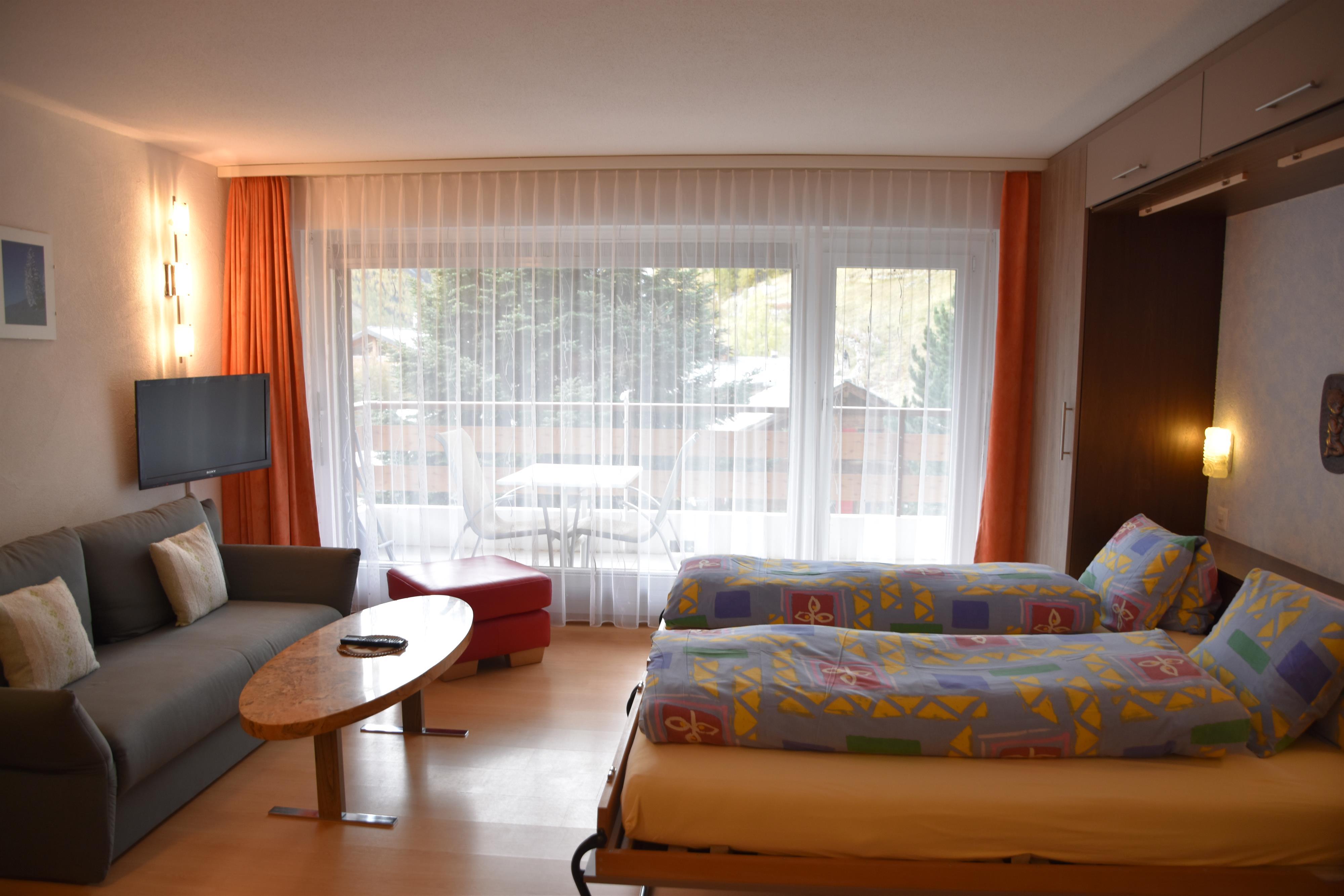 Das helle Appartement (36 m2) befindet sich in der 3. Etage. Es verfügt über 2 Wandschrankbetten und ein Couch Bett im Wohnbereich. Dusche/WC. Bett- und Frotteewäsche sind vorhanden und im Preis inbegriffen.