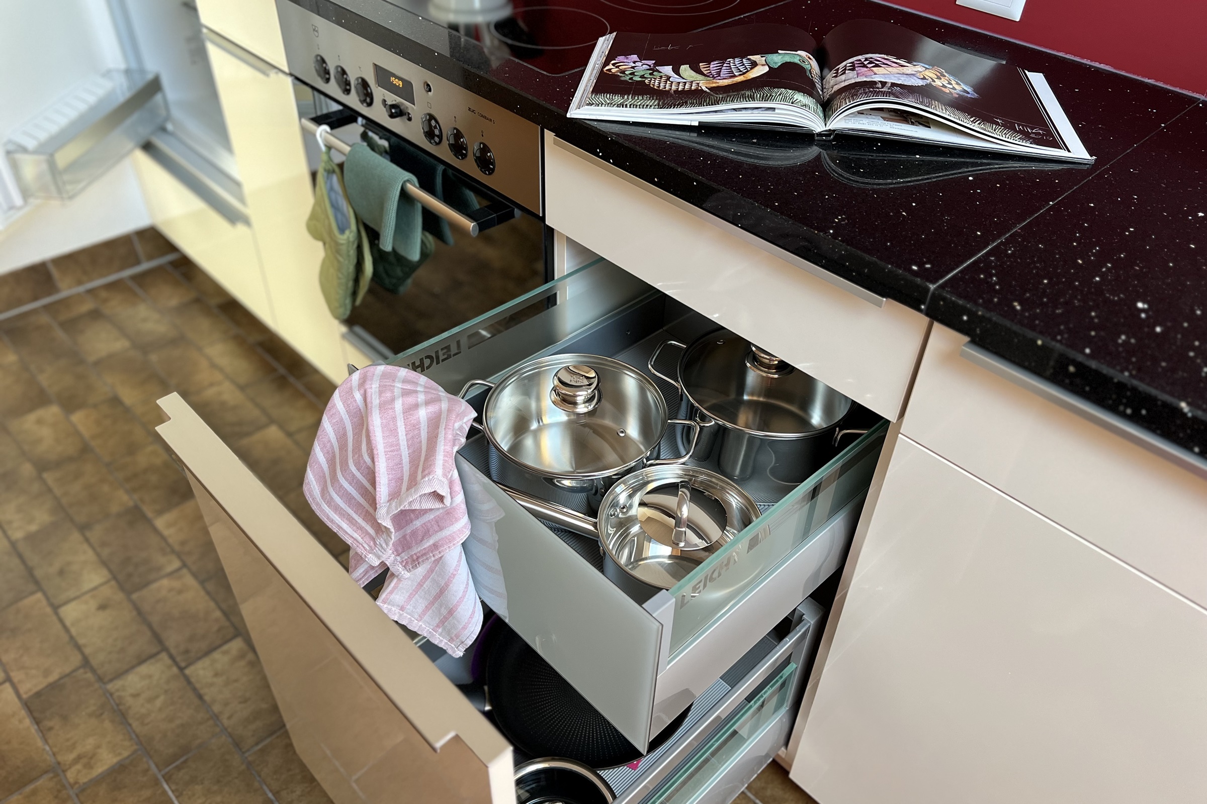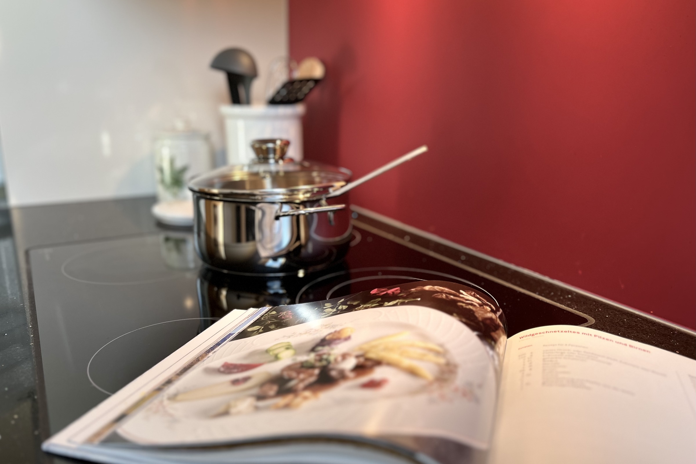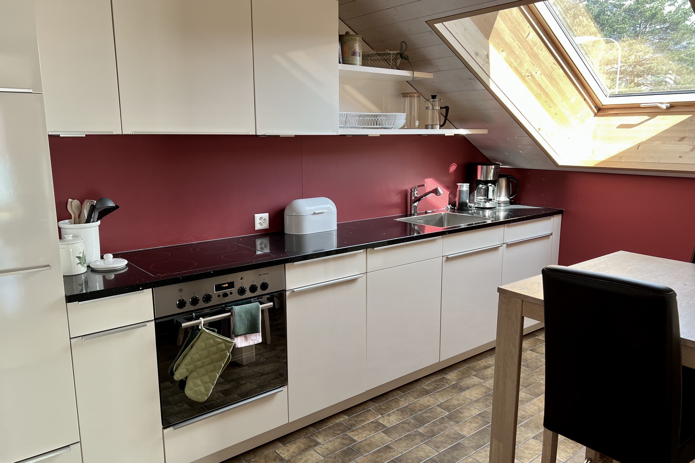 Eine offene und moderne Küche mit Kühlschrank, Glaskeramikherd, Backofen, Spülmaschine, Kaffeemaschine und Wasserkocher. Inneneinrichtung