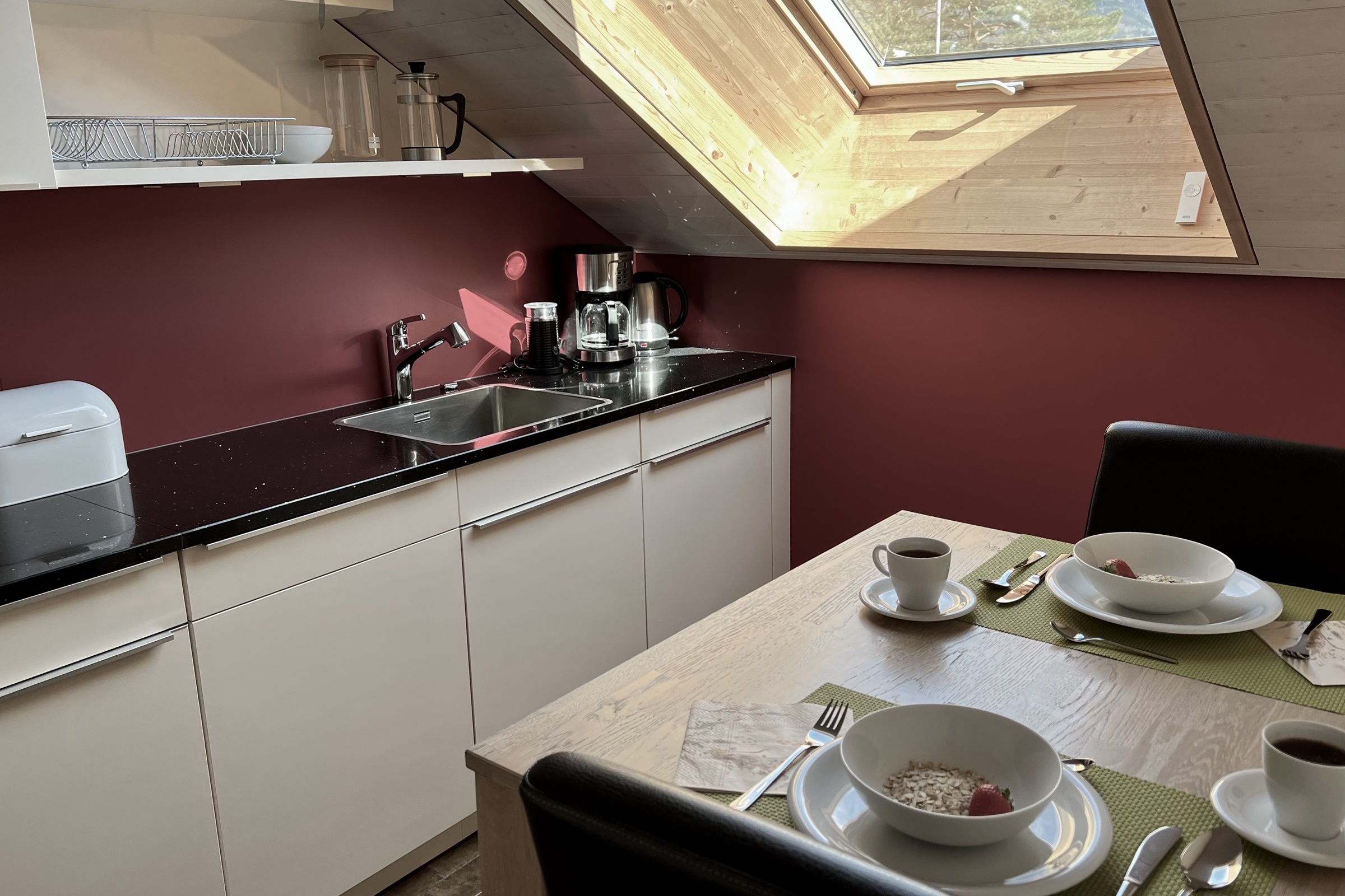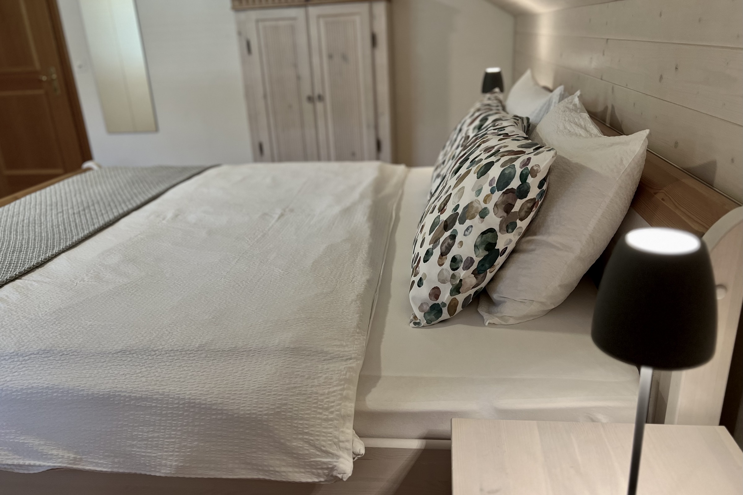 Die Ferienwohnung verfügt überzwei Schlafzimmer mit je einem grossen Doppelbett ein Badezimmer mit Dusche, Doppelwaschbecken und einem Closomatein offenes Wohn- & Esszimmereine moderne und vollausgestattete KücheInneneinrichtung & Technik