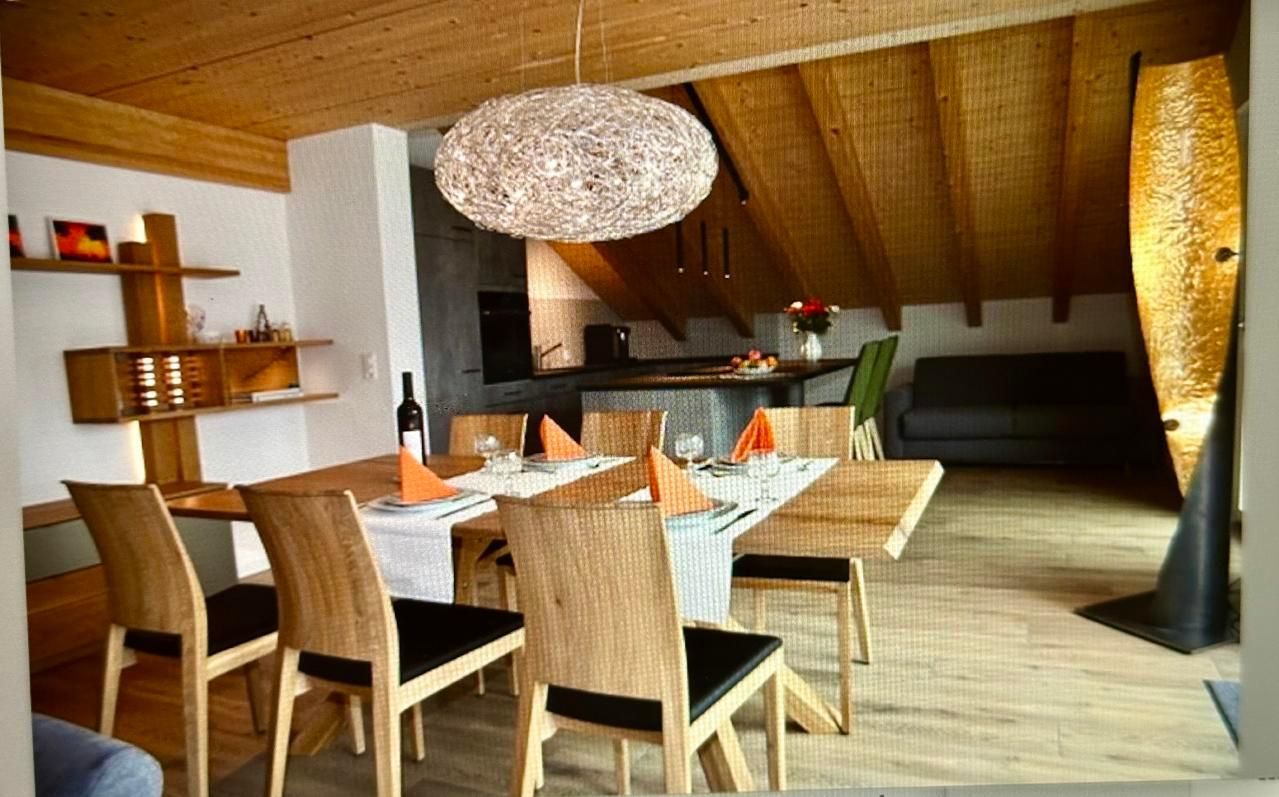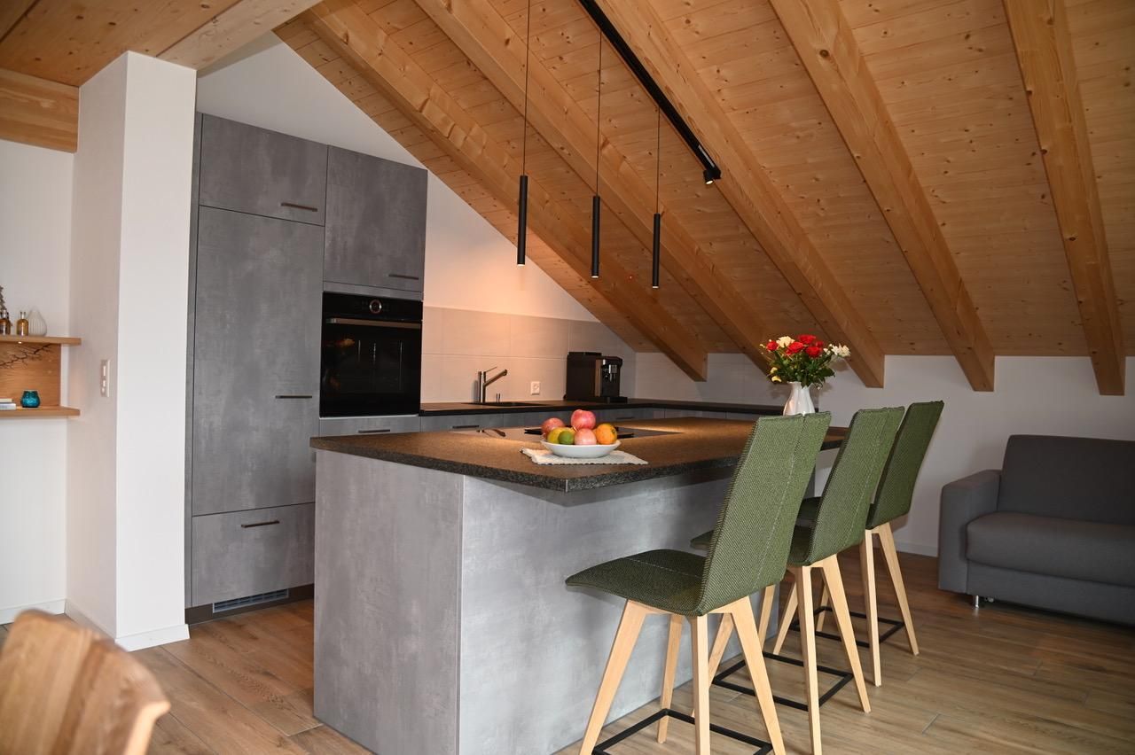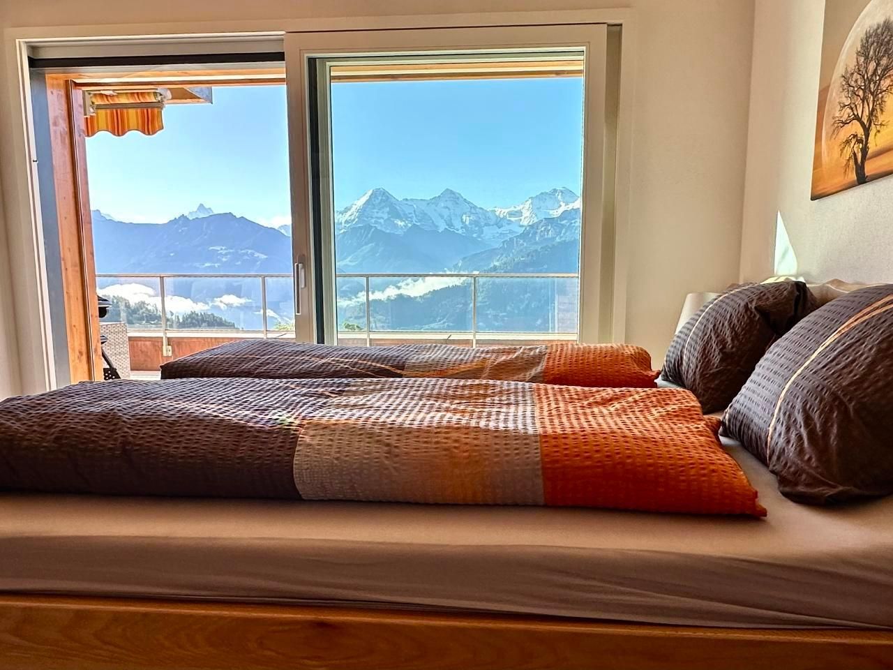 Moderne und stilvoll eingerichtete 3.5 Zimmer Wohnung (ca. 100 m2) mit zwei grossen Balkons, erbaut im Jahre 2019. Luxuriöse, offene Wohn-Küche mit Granitabdeckung, Backofen, Kochinsel mit Glaskeramik Kochfeld (Induction) , Dunstabzug, Geschirrspüler, Kühlschrank mit Gefrierfach, Toaster, Kaffeemaschine, Fondue Set, Raclette Grill usw. Wohnzimmer mit Polstergruppe, Salontisch, Kabel-TV, Flachbildschirm 107cm, Internetanschluss (gratis W-LAN), und massivem Esstisch. 2 Schlafzimmer mit Doppelbetten, 2 Badezimmer, eines davon mit Dusche/Lavabo/Aquaclean WC, Spiegelschrank; das andere mit Dusche/Badewanne, Lavabo, WC, Spiegelschrank Waschmaschine und Wäsche Trockner. Entree, Küche, Bad und Wohnbereich mit Keramik-Plattenboden und Bodenheizung. Die Unterkunft verfügt über alles Erdenkliche, damit Gäste die Ferien in vollen Zügen geniessen können. Die wunderschöne und unverbaubare Berg- und Seesicht auf das UNESCO Weltnaturerbe mit Eiger, Mönch und Jungfrau bewundern Sie vom grossen Südbalkon aus (44m2) wo die bequemen Balkonmöbel zum Verweilen einladen. Die Abendsonne scheint auf den zweiten Balkon (105 m2) im Westen und bietet herrliche Aussicht auf den Thuner See, Richtung Niesen und den Eingang zum Kandertal. Für Kleinkinder nicht geeignet. Nichtraucher Wohnung; Keine Haustiere. Zur Wohnung gehört eine Garage (4.75 x 3.86 m), welche kostenlos benützt werden kann. Die Bushaltestelle (bei den Kirchen) ist nur ca. 100 m von der Wohnung entfernt und mit der Gästekarte kann der Bus kostenlos benützt werden. In knapp 20 Minuten ist man in Interlaken und am Thuner- oder Brienzersee.