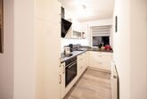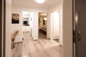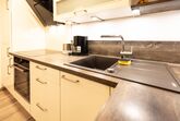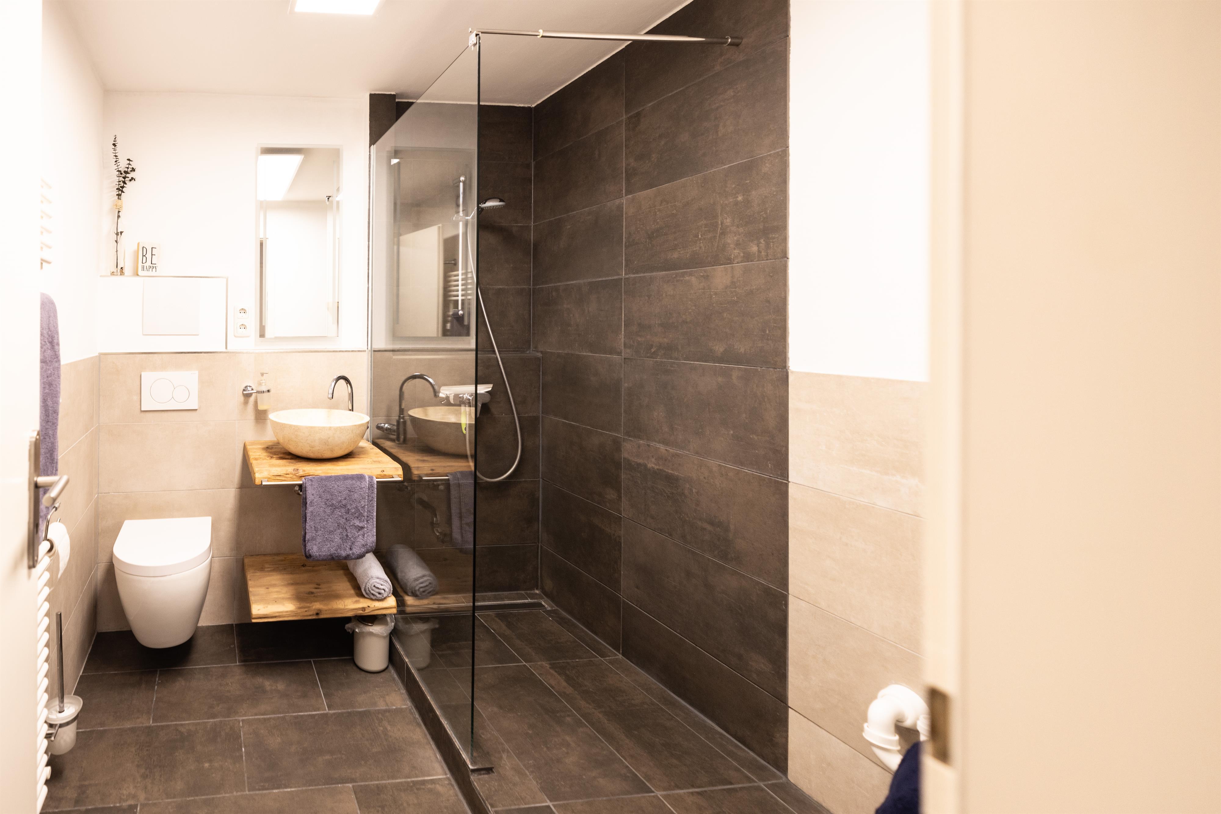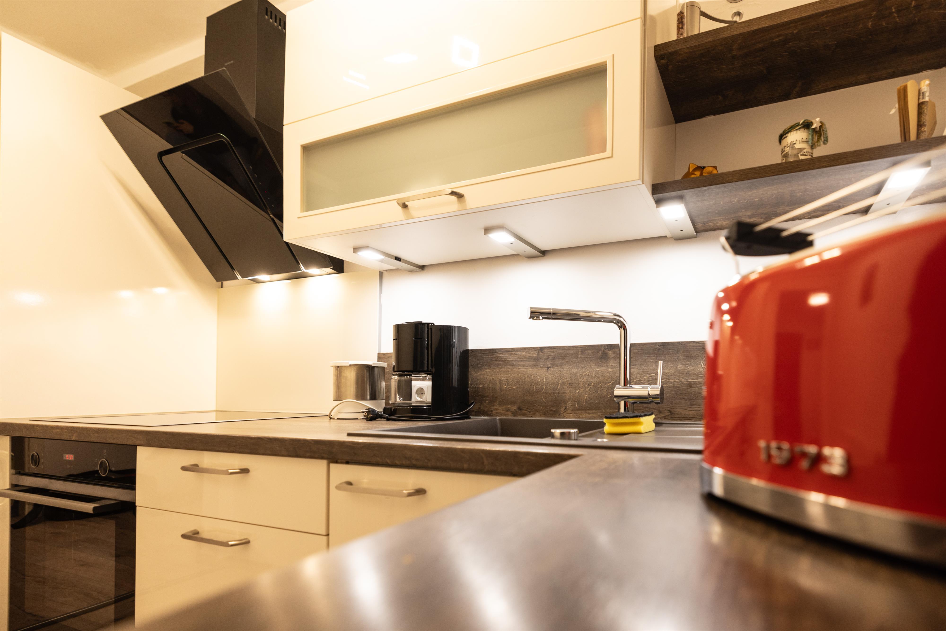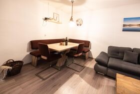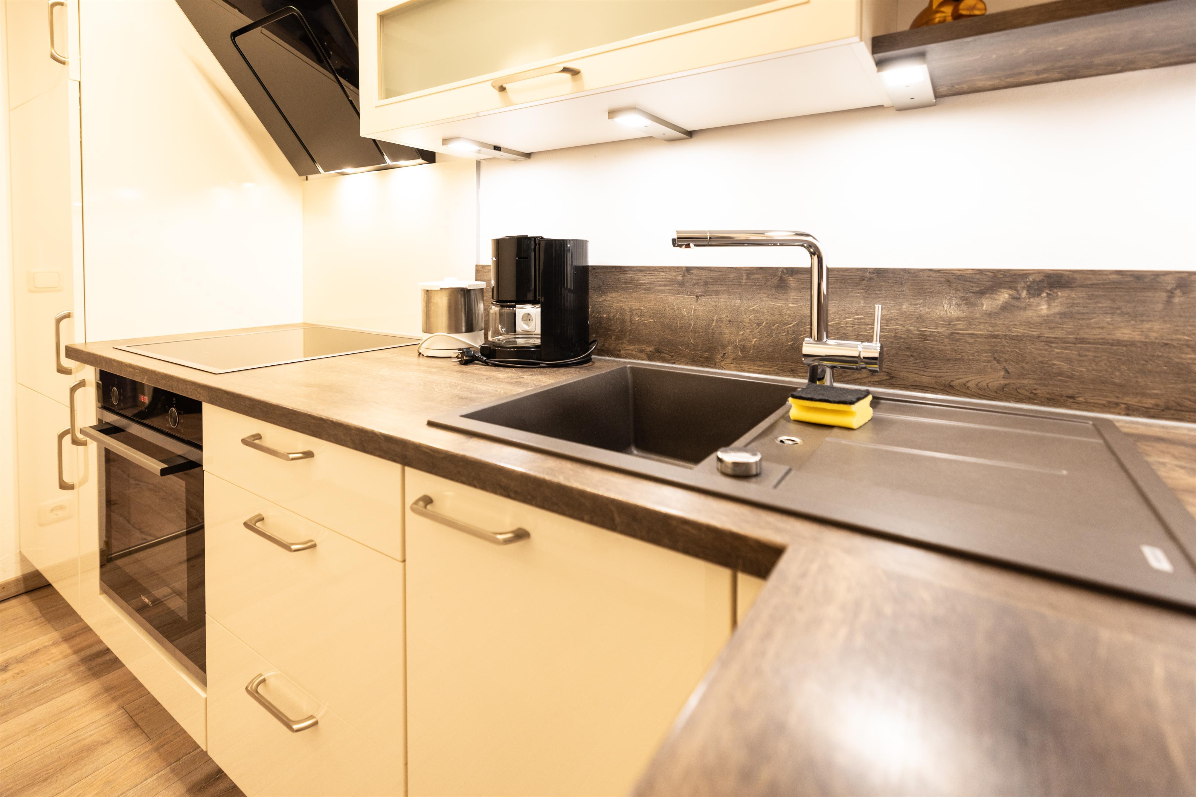 Moderne Küche mit allen üblichen Geräten, wie Kühl- und Gefrierschrank, Backofen, Toaster, Filter-Kaffeemaschine, Induktionskochfeld. Alpenländisch eingerichtetes separates Schlafzimmer und zwei zusätzliche Schlafplätze auf der Couch im Wohnbereich. Modernes Badezimmer mit bodenebener Dusche, WC und LED-Spiegel.
