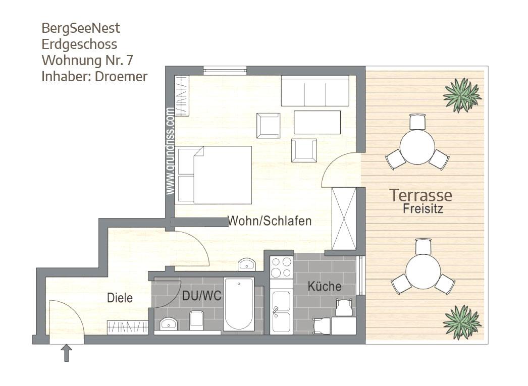 Die Räume: Wohnen und Schlafen in einem großen Raum. Küche extra. Bad extra. Flur mit Ankleide. Großzügige Terrasse. Der Garten ist für alle Hausgäste. Der See ist 4 Minuten zu Fuß entfernt. Die Lage ist sensationell ruhig und idyllisch.