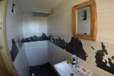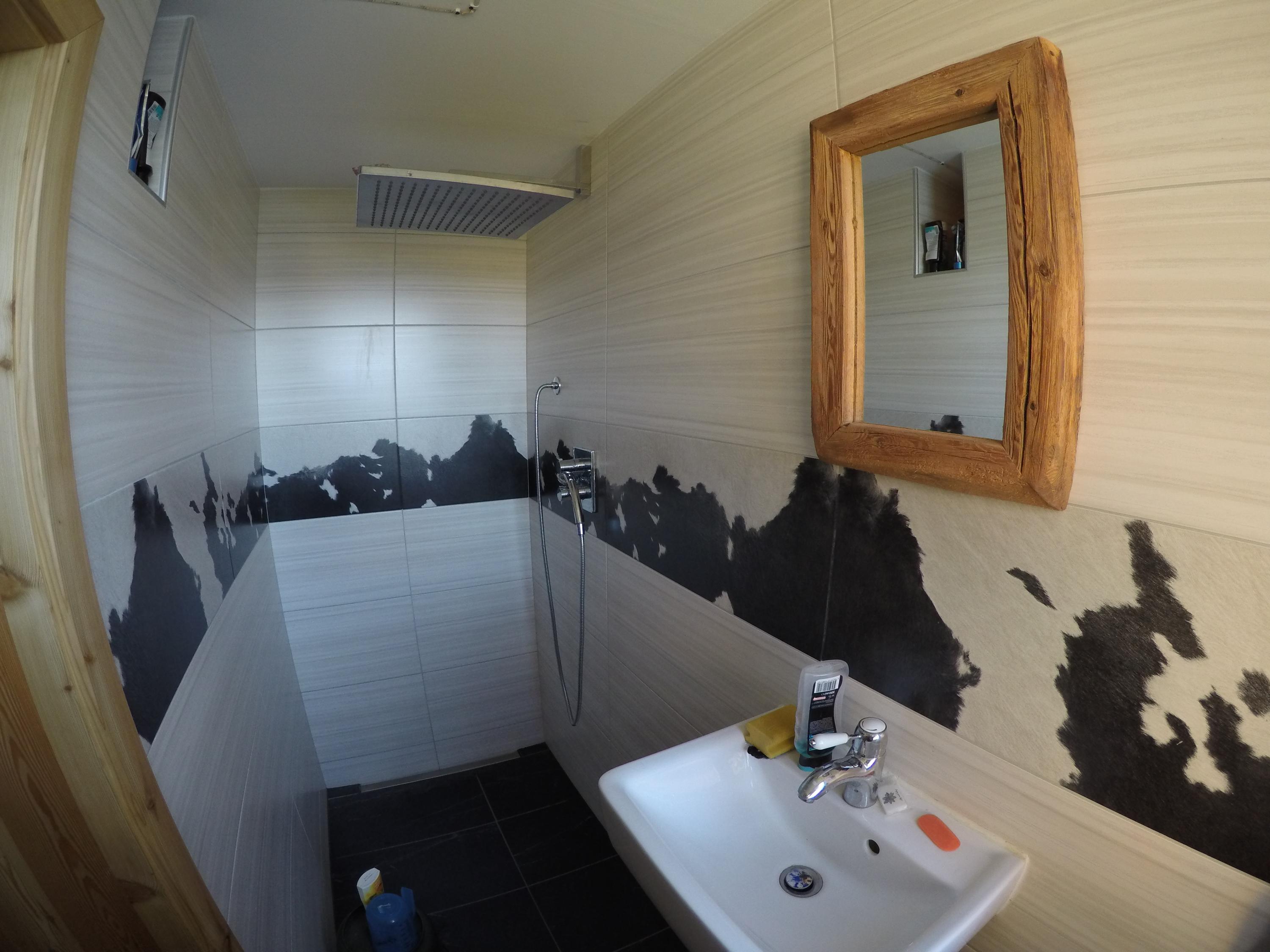 Darüber hinaus gibt es eine Delux Design Aussichtsdusche mit Kuhfellfliesen, Rainbow und Handbrause. Warmwasser selbst Holzbeheizt.
