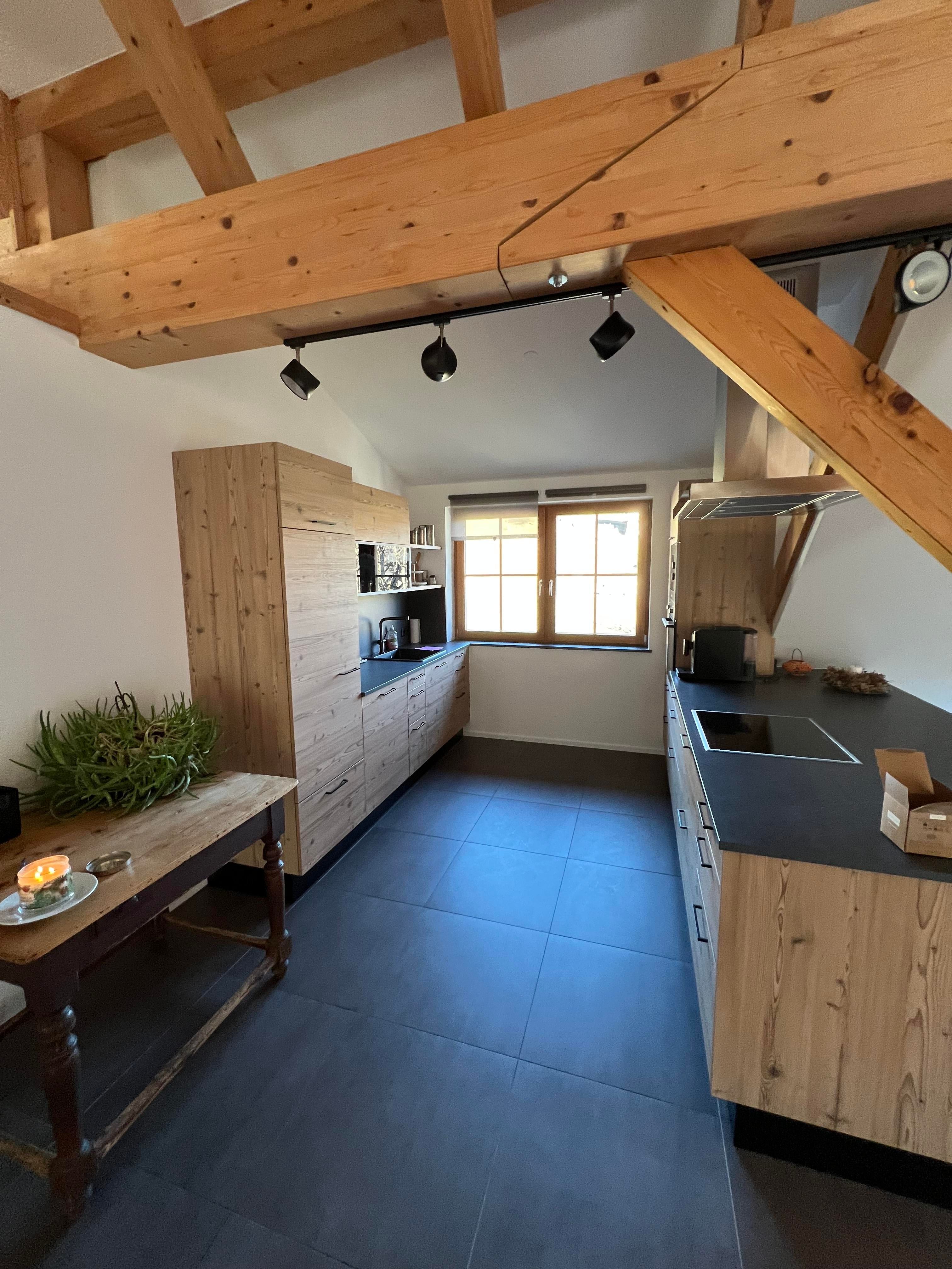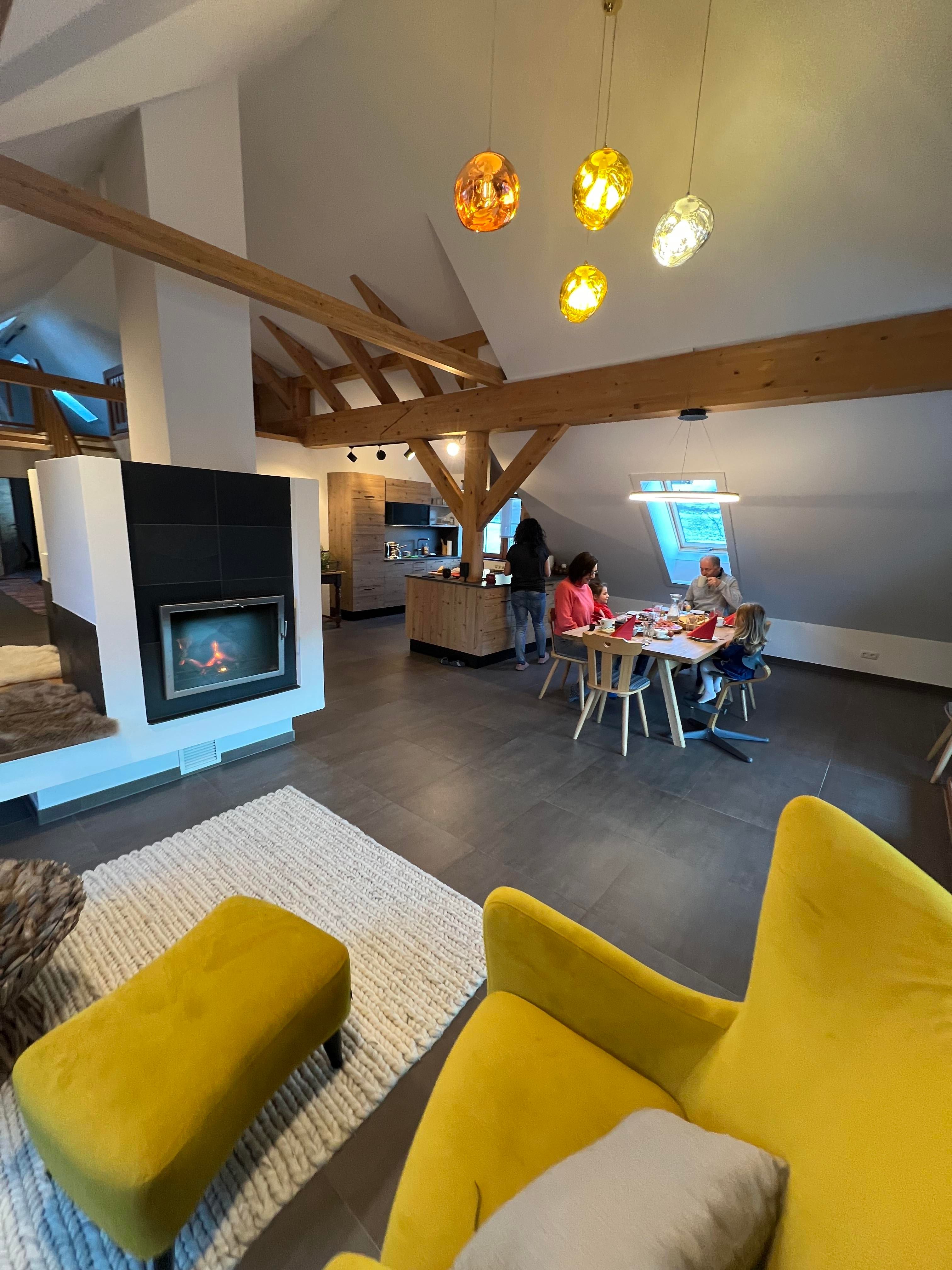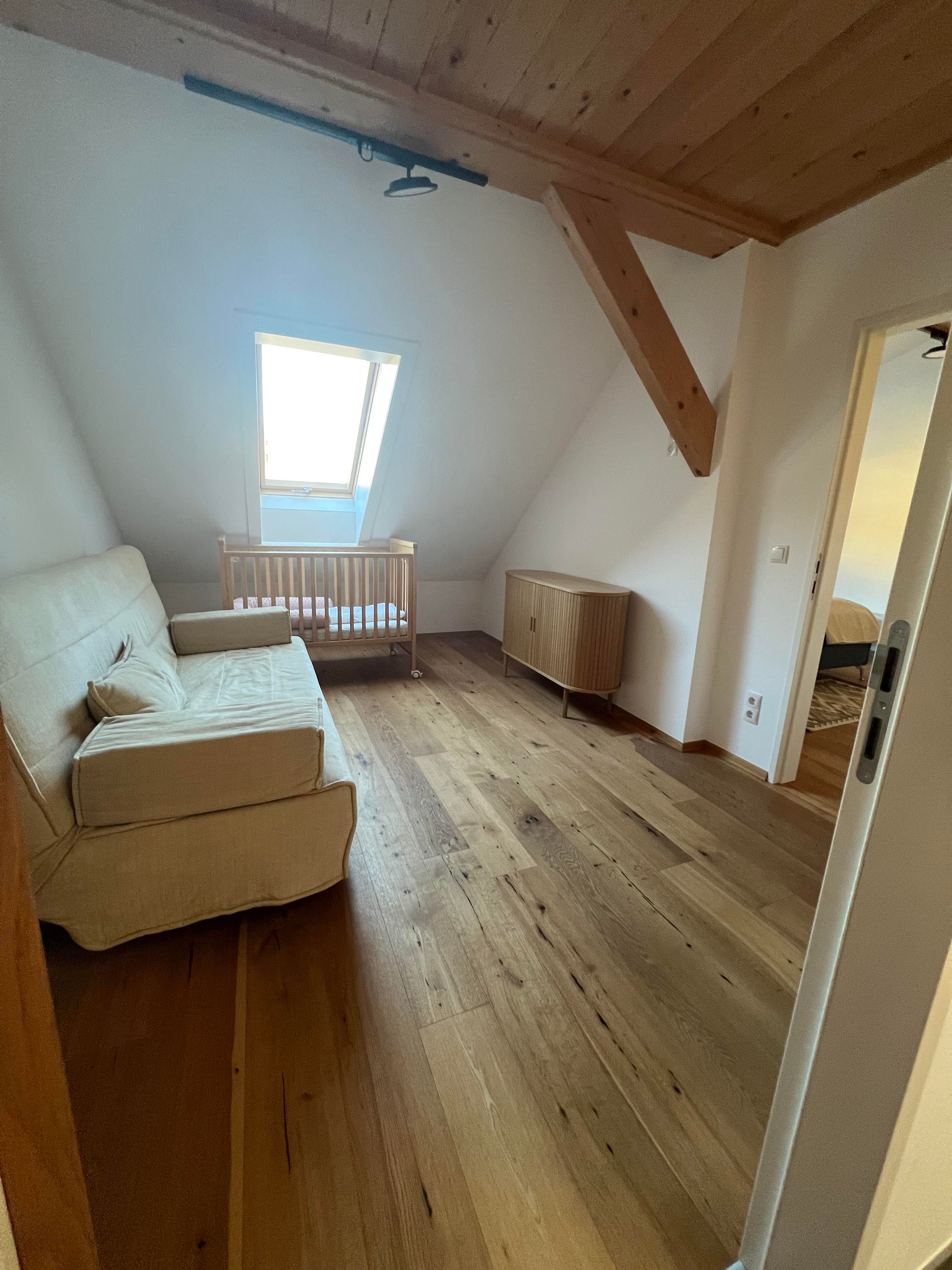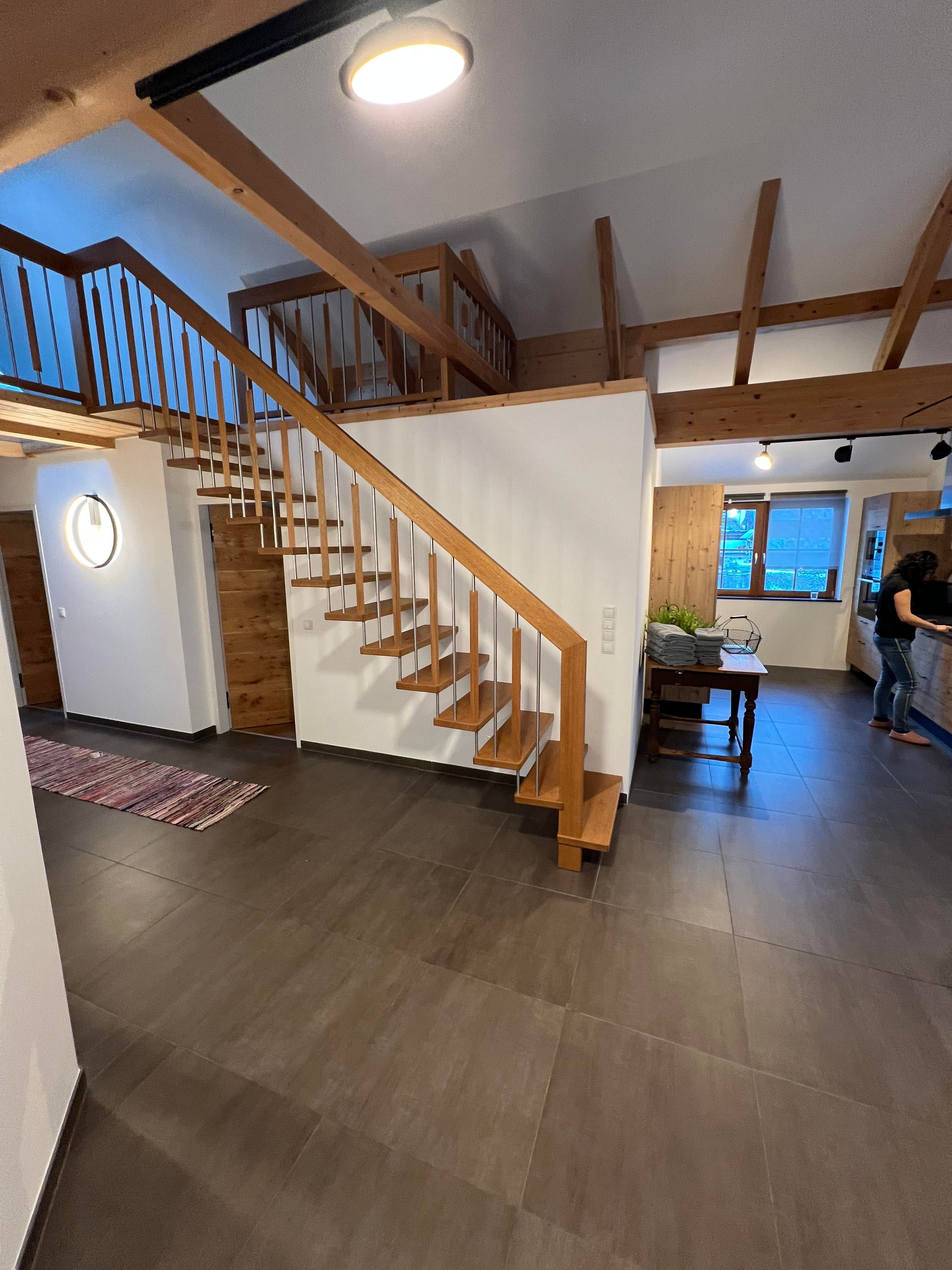 Deine Wohnung im Überblick – dein Kraftort zum Sein, Atmen & Auftanken Geräumigkeit & Ausstattung: Diese großzügige, lichtdurchflutete Dachgeschosswohnung befindet sich in einem über 300 Jahre alten, liebevoll restaurierten Haus. Sie bietet Platz für bis zu 6 Personen – mit vier Schlafzimmern (drei Doppelbetten, einer Doppel-Schlafcouch und einem Gitterbett), einer voll ausgestatteten Küche, Wohnzimmer, zwei Toiletten, Loggia und einer offenen Galerie. Das Bad verfügt über Dusche, Badewanne und Doppelwaschtisch.