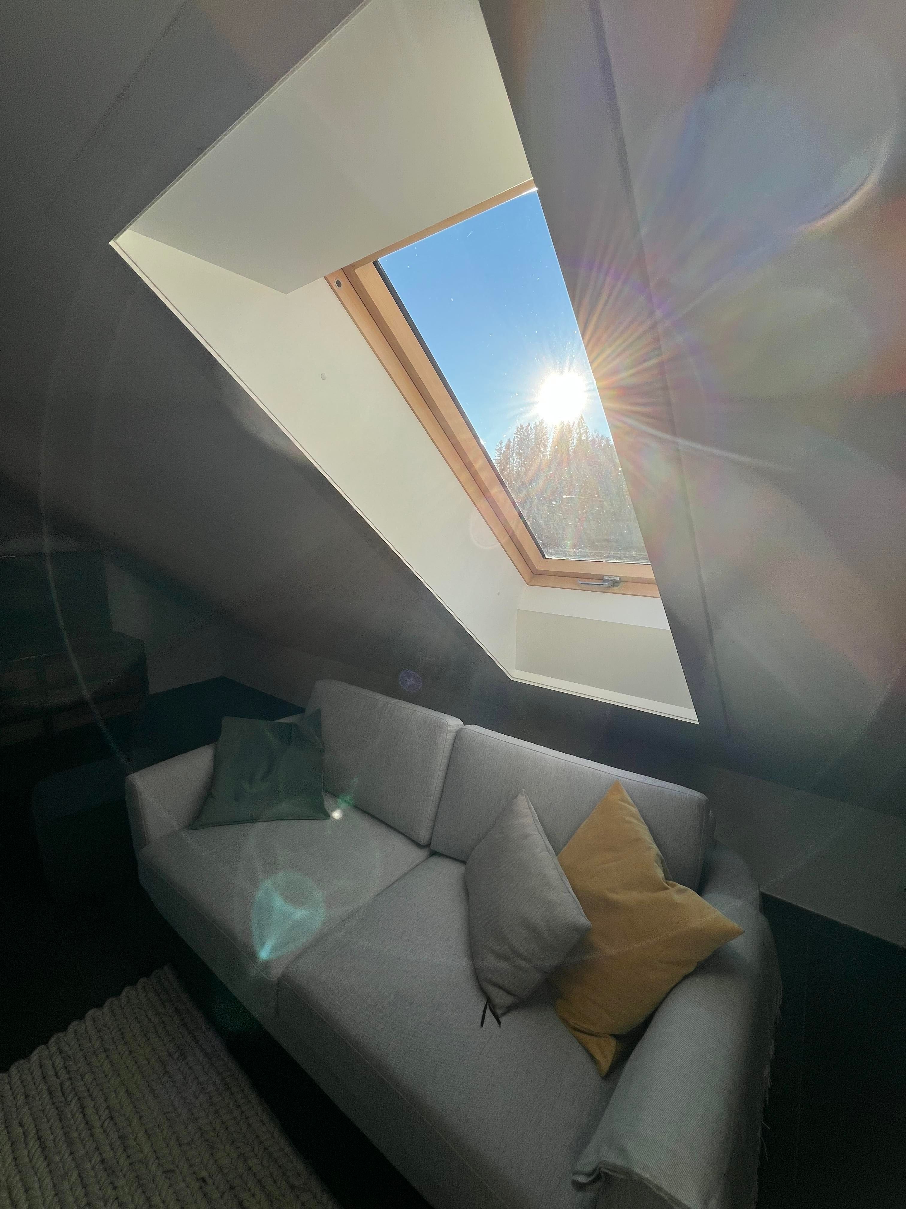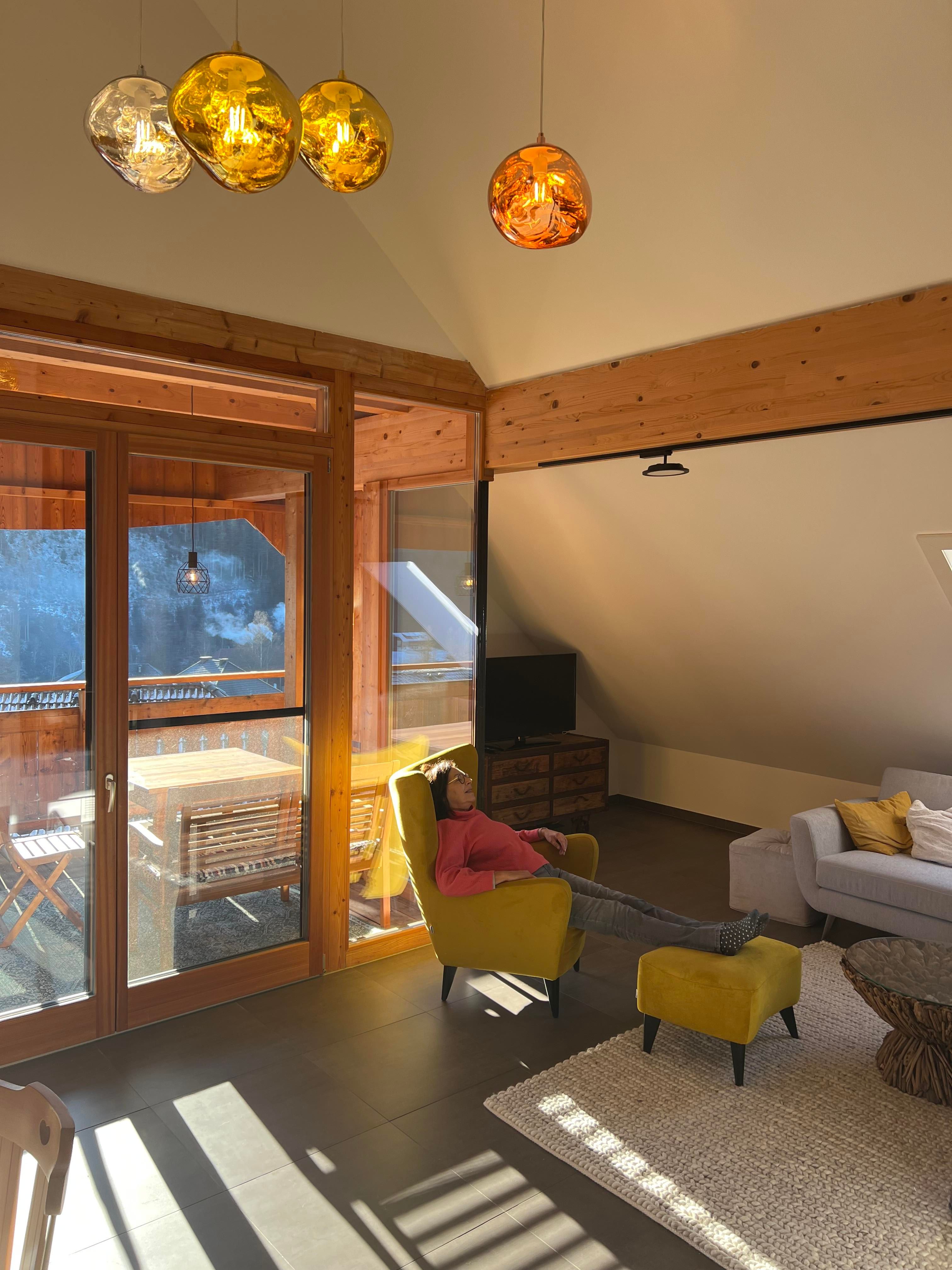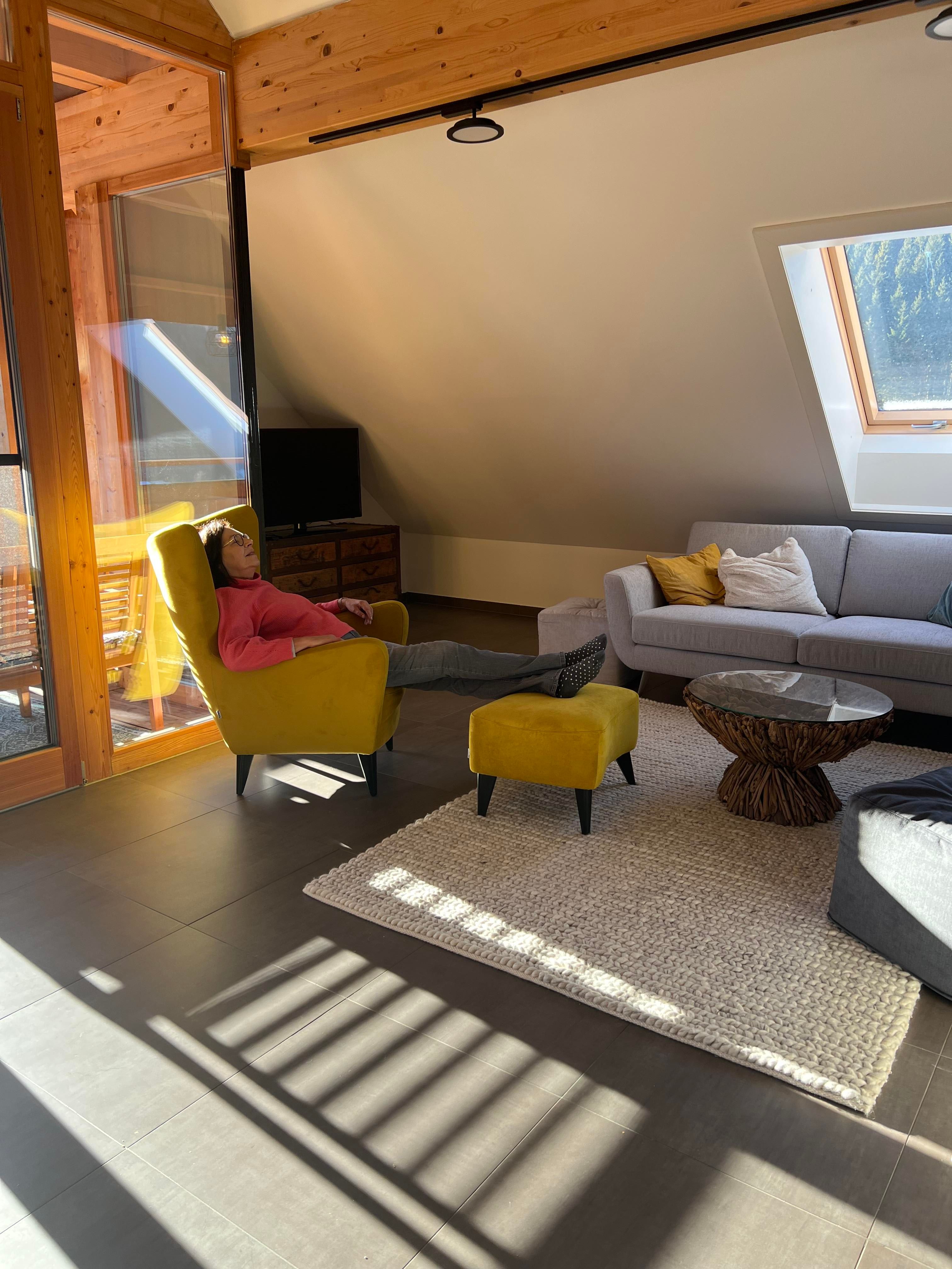 Die große Fensterfront der Wohnung öffnet den Blick ins satte Grün – oder auf die winterliche Stille schneebedeckter Bäume. Ein Ort, der das Hier & Jetzt fühlbar macht.
