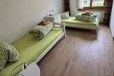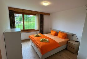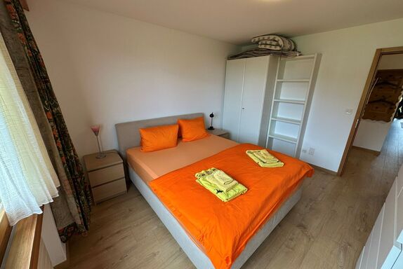 Ein Schlafzimmer mit Doppelbett und ein Schlafzimmer mit zwei Einzelbetten. Babybett auf Anfrage. Bettwäsche vorhanden.