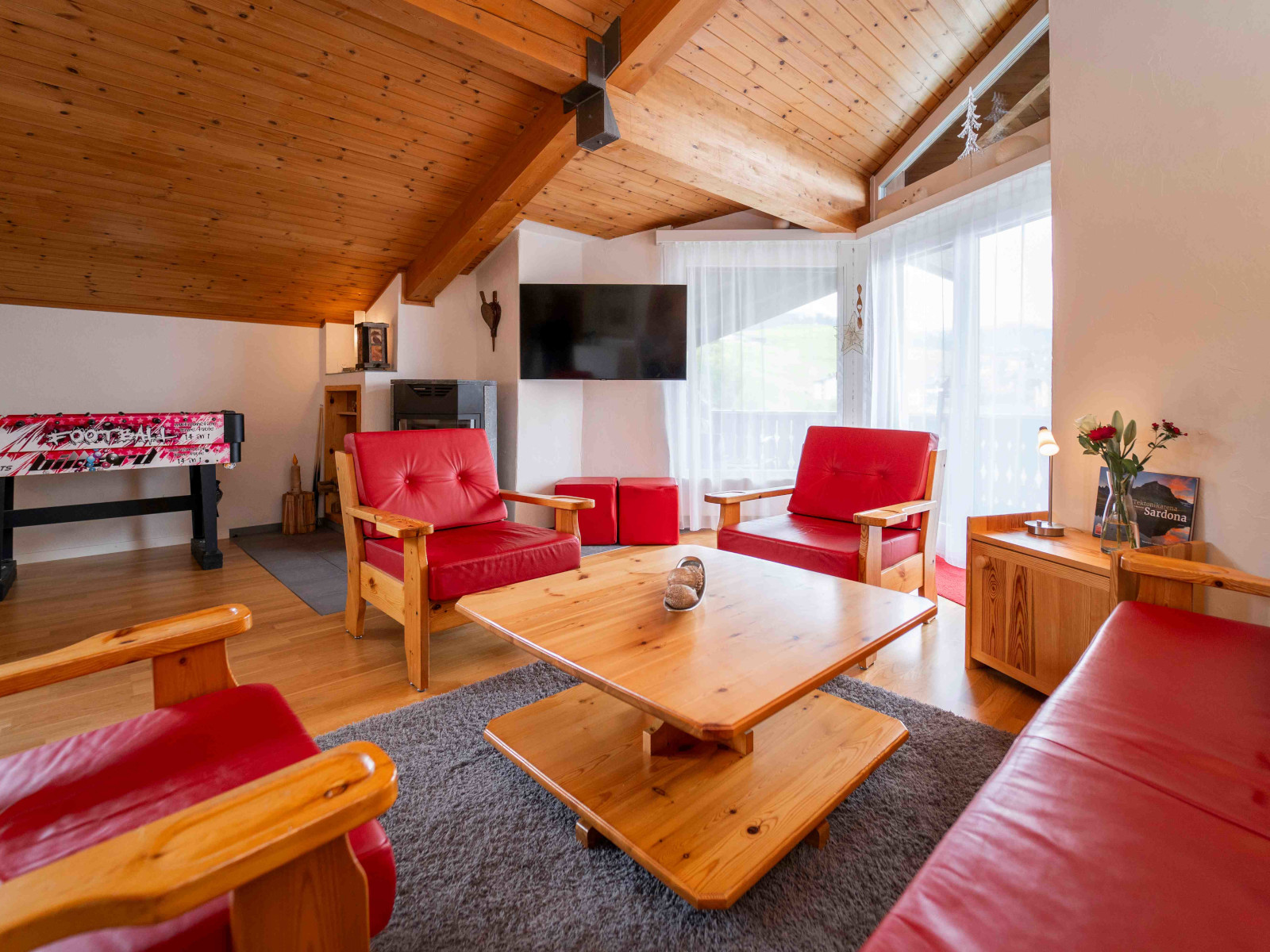 Offenes Wohnzimmer: Sofagruppe, grosser LED-TV, Gesellschaftsspiele, Tischfussball. Zugang zum Balkon.