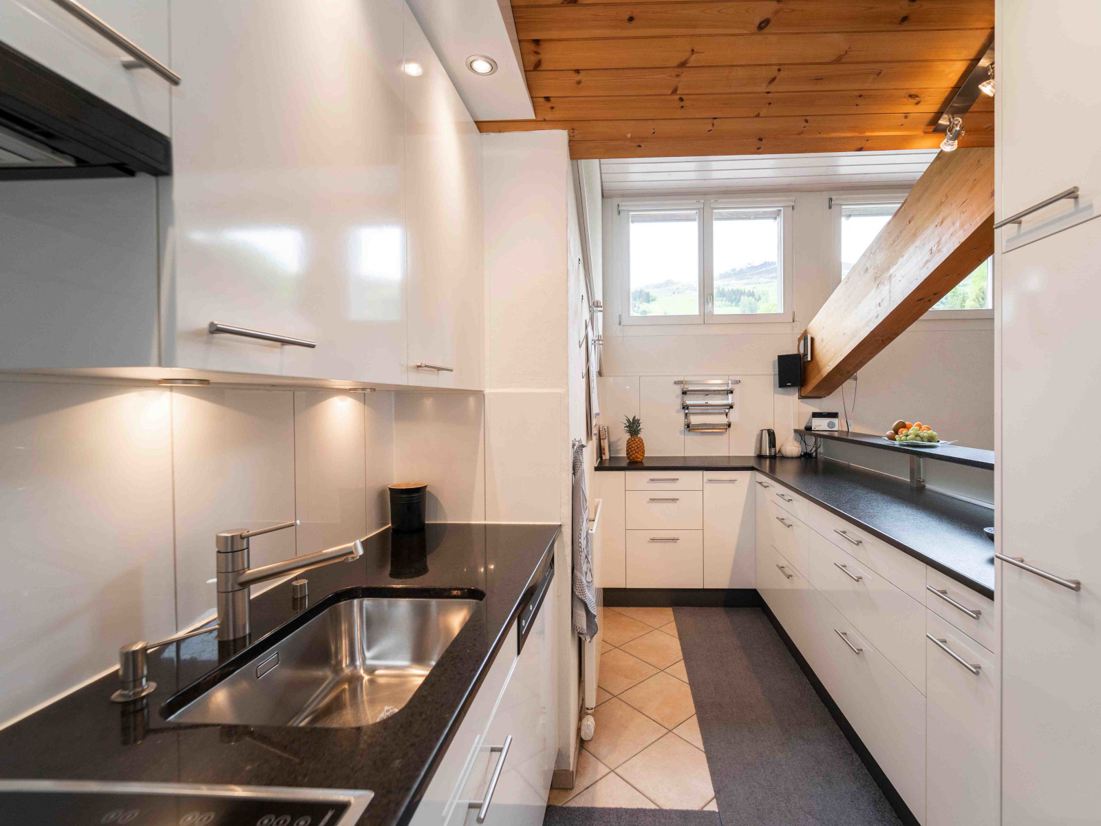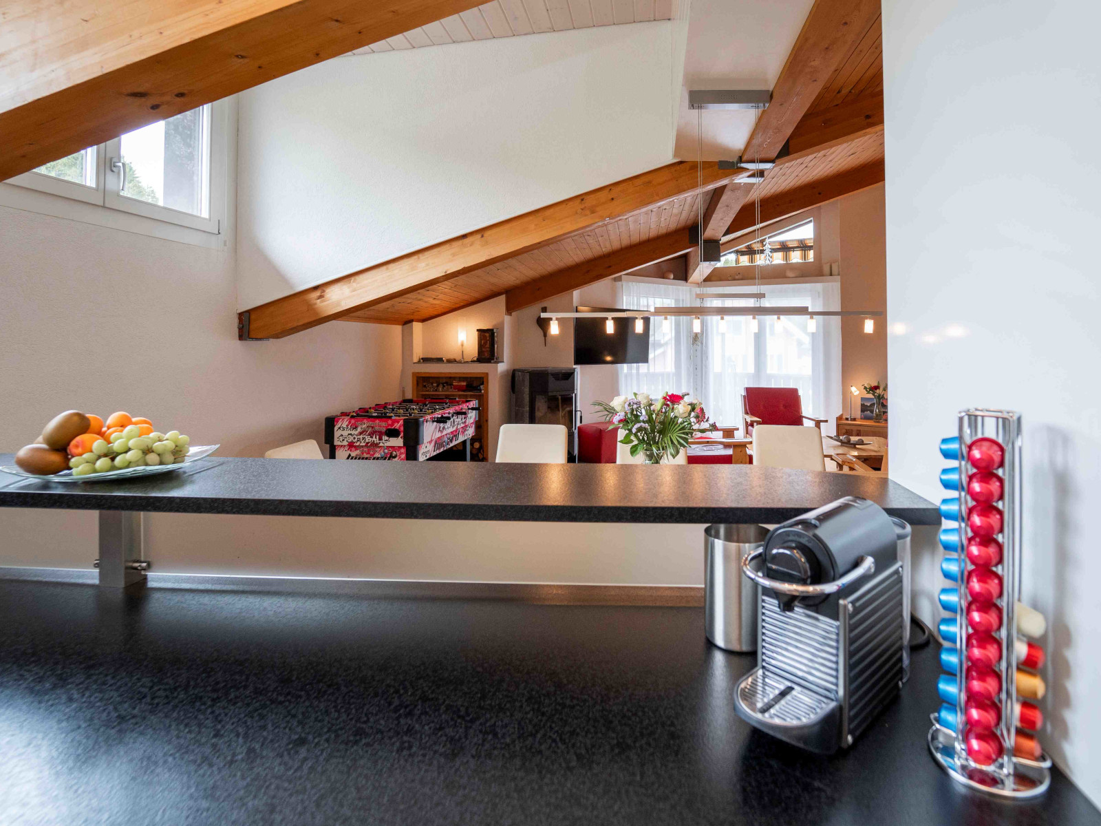 Moderne offene Küche: ausgestattet mit Geschirrspüler, Glaskermaikherd, Steamer&Backofen, Kaffeemaschine (Nespresso), Raclette & Fondueset, Toaster, Wasserkocher, Tiefkühlfach, Mikrowelle