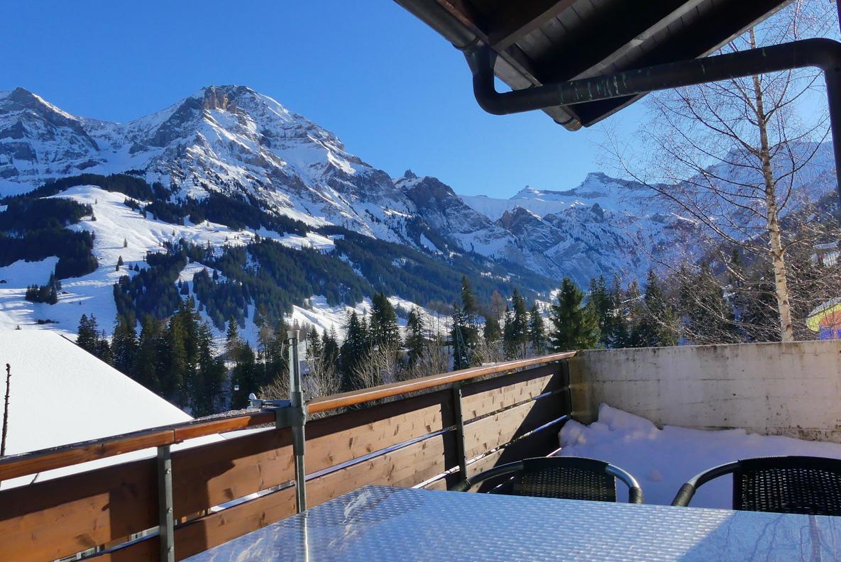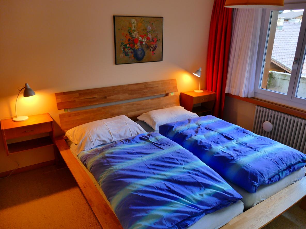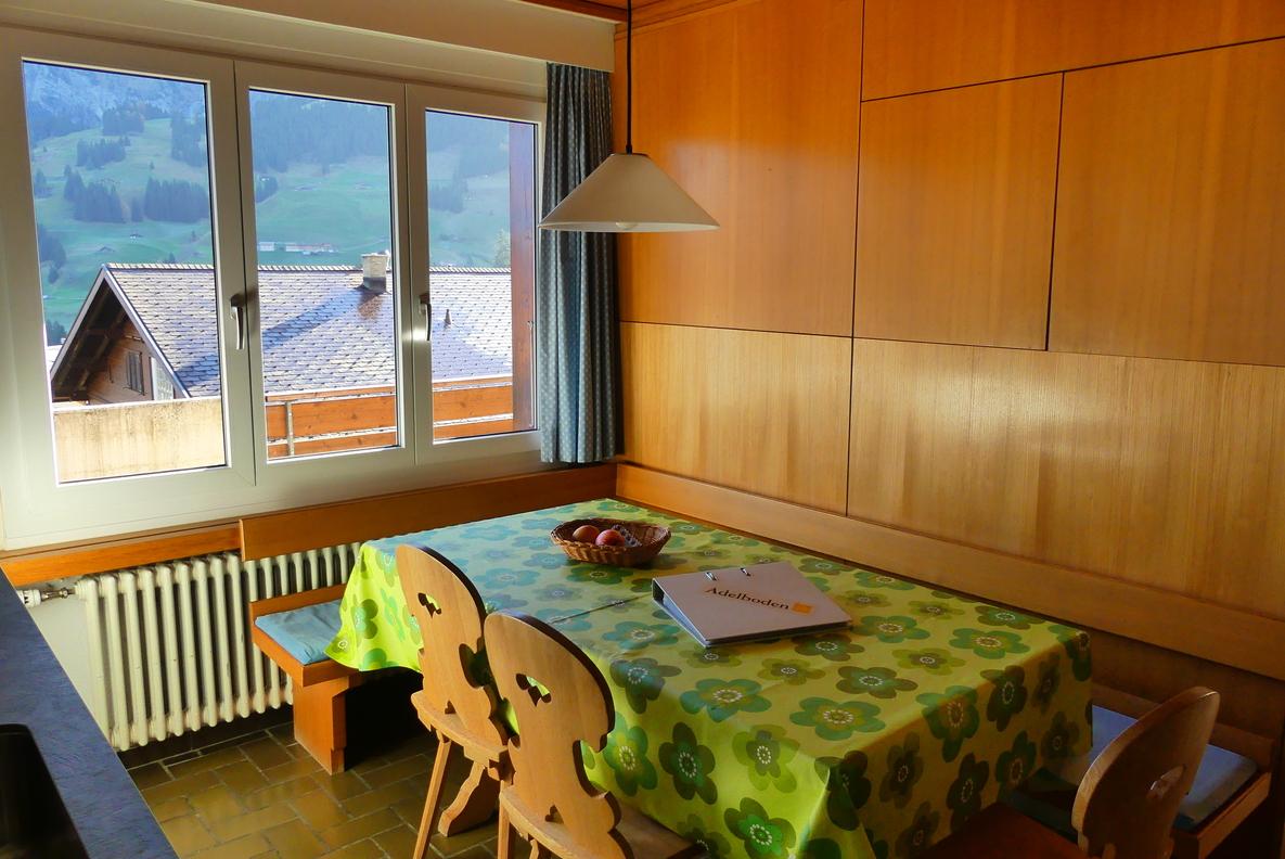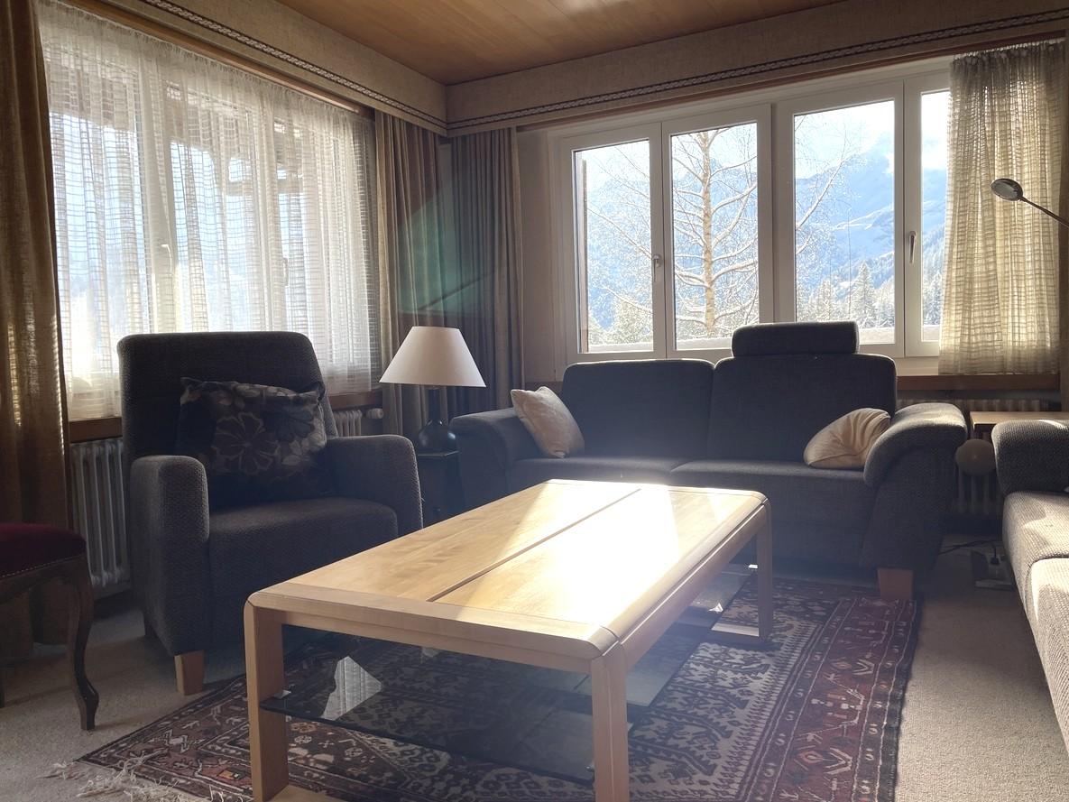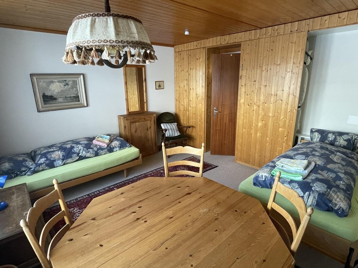 Ideal für Familien oder eine kleine Gruppe. Zwei Schlafzimmer (ein Doppelbett, 3 Einzelbetten). Gemütliches Wohnzimmer mit TV und WLAN, voll ausgestattete Küche, Bad mit Dusche. Geniessen Sie den Balkon mit schöner Aussicht, auch die Ski-Weltcuppiste Chuenisbärgli ist zu sehen.
