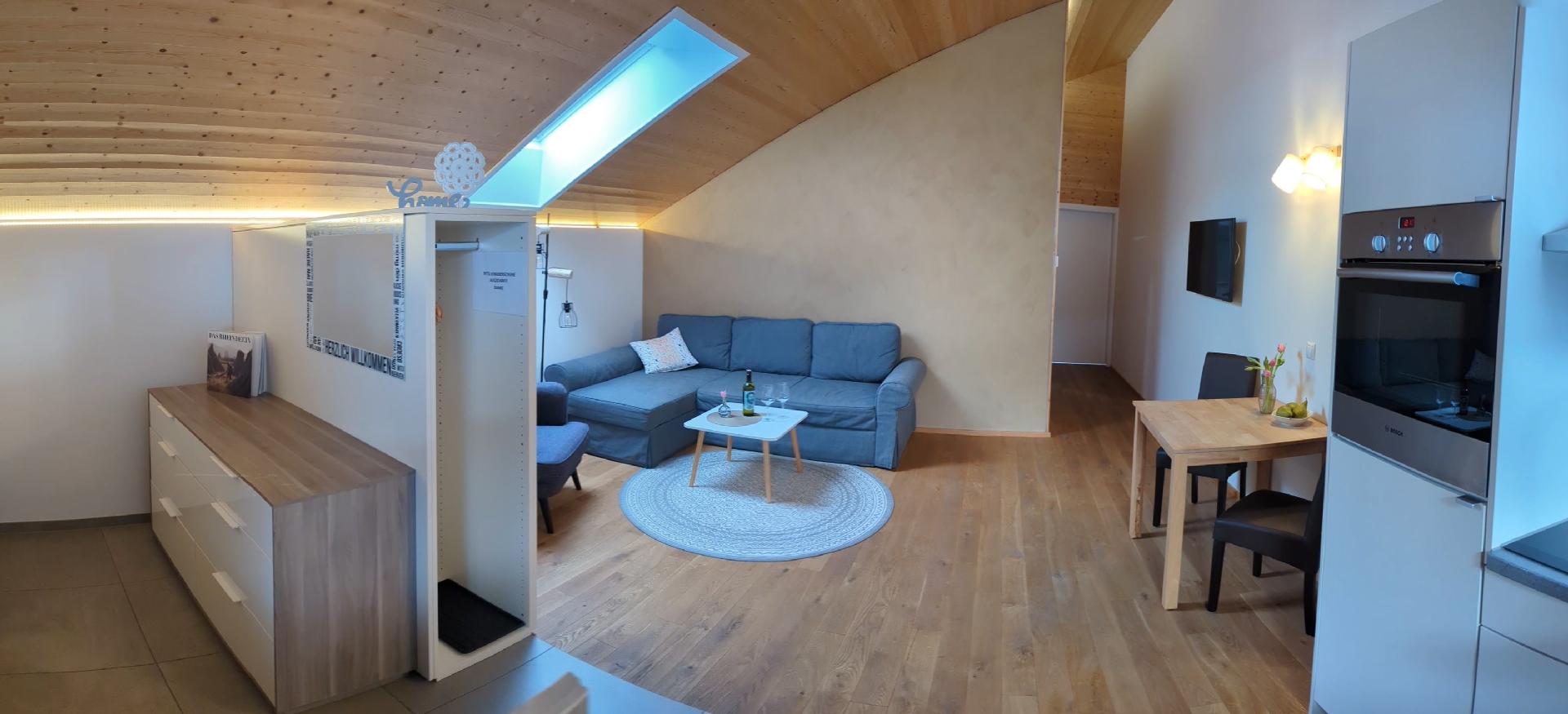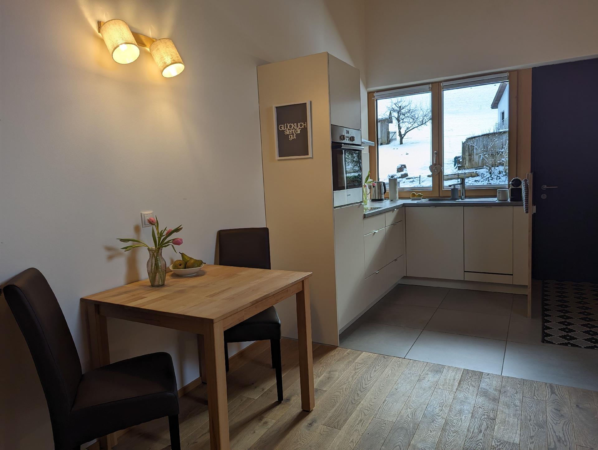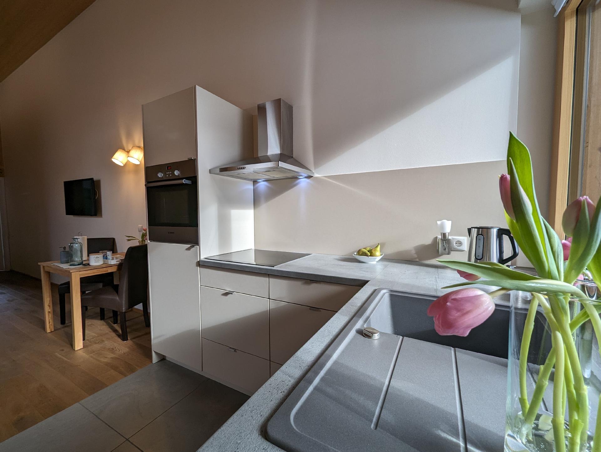 Das Interieur der Wohnung Auszeit ist darauf ausgerichtet, Ihren Aufenthalt so komfortabel wie möglich zu gestalten. Die Fußbodenheizung sorgt in jeder Ecke für wohlige Wärme, während der bereitgestellte Ventilator an wärmeren Tagen für eine angenehme Brise sorgt. Zur Ausstattung gehören zudem ein Cerankochfeld, eine Kapsel-Kaffeemaschine sowie eine Spülmaschine, die Ihnen den Alltag erleichtern. Obwohl Küche und Badezimmer als Herzen der Wohnung dienen, sind es die vielen kleinen Annehmlichkeiten, die Ihren Aufenthalt besonders machen.
