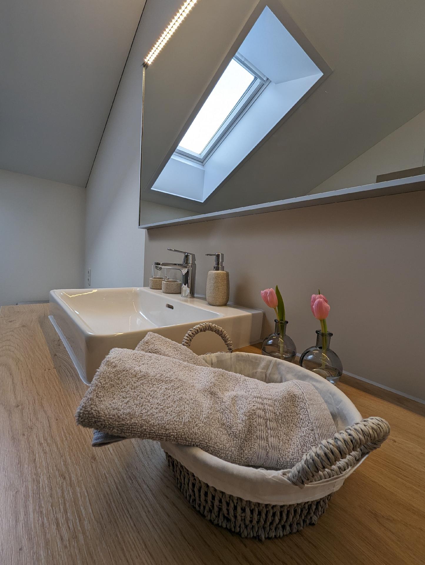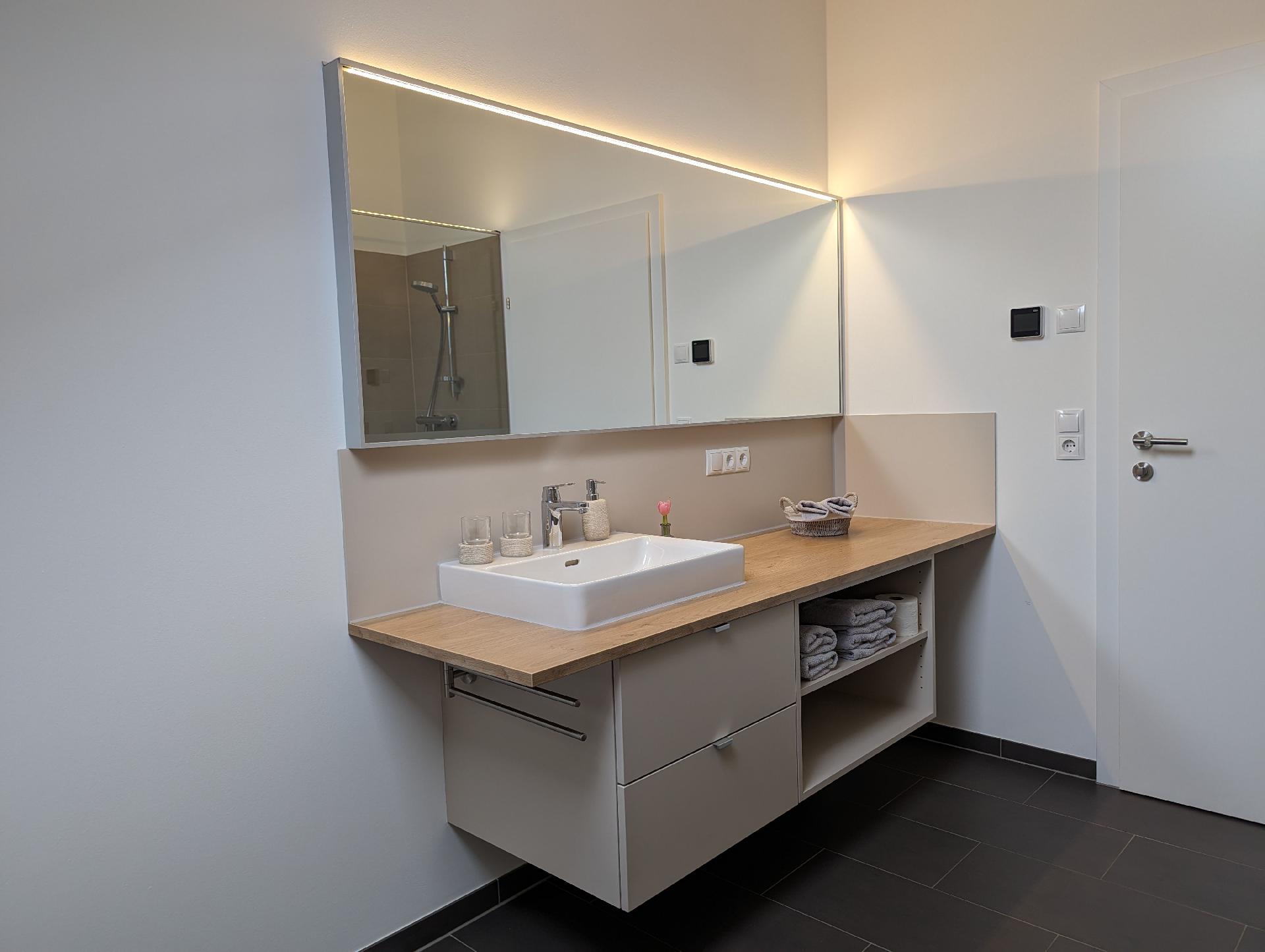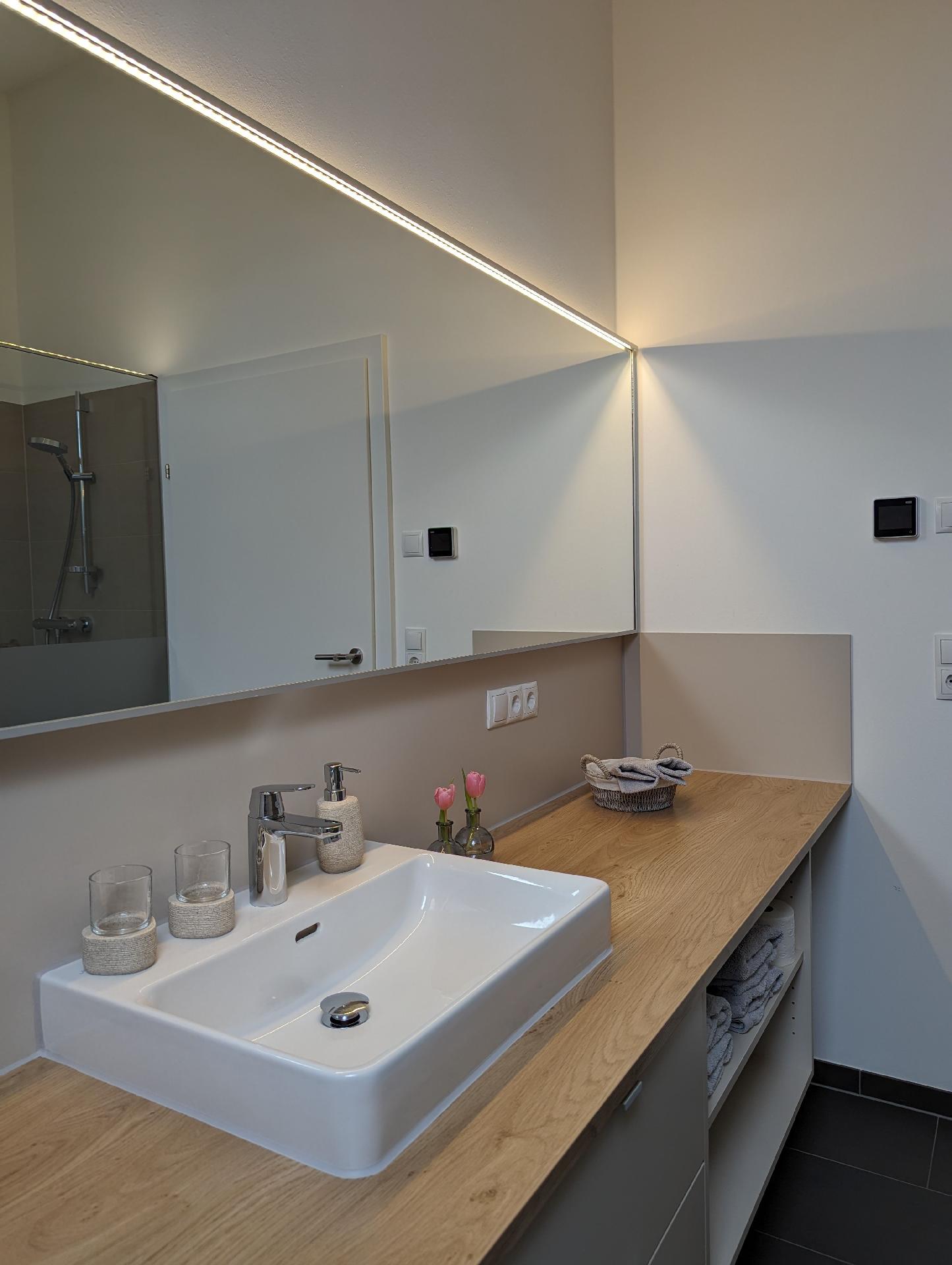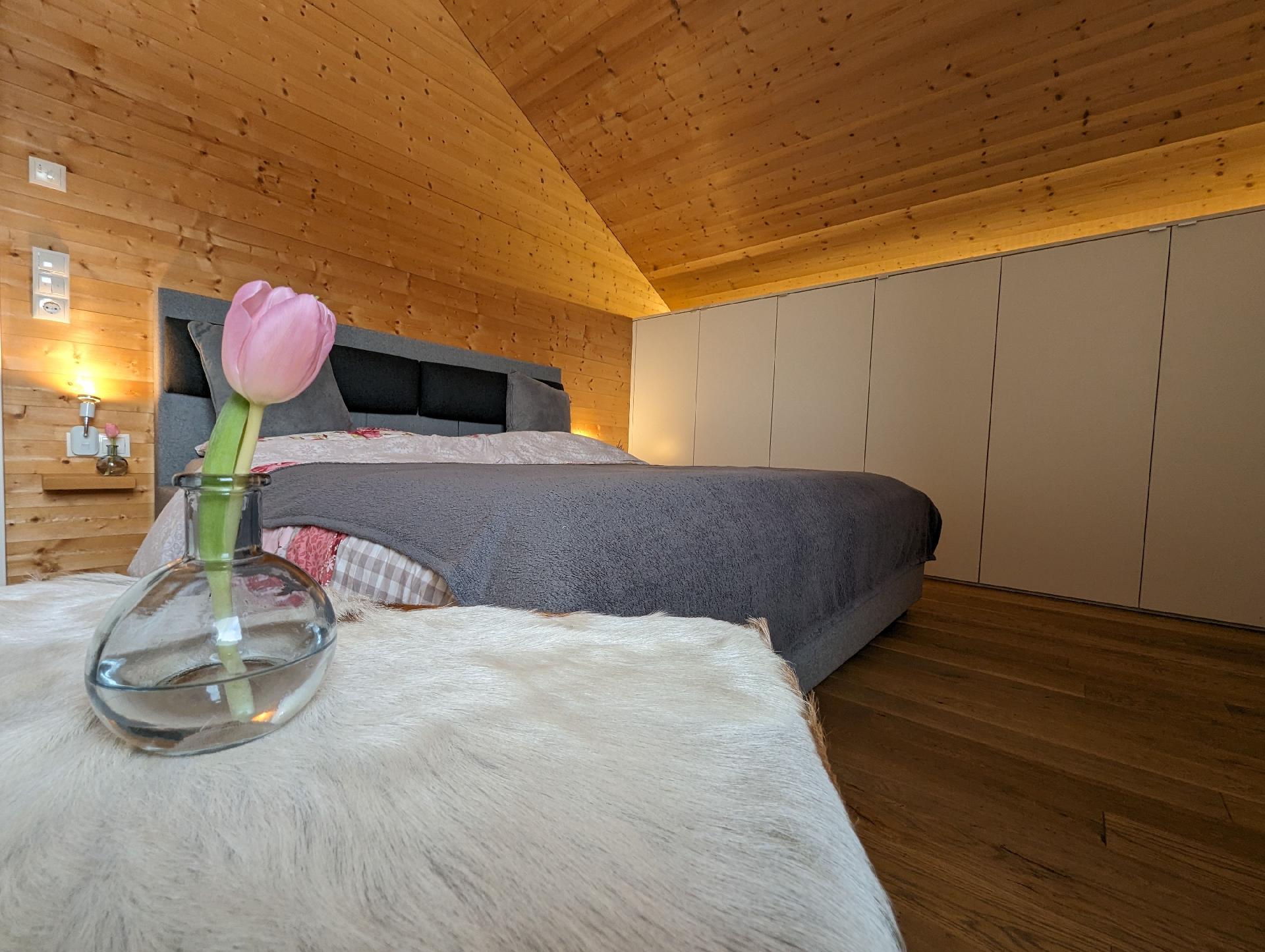 Das Interieur der Wohnung Auszeit ist darauf ausgerichtet, Ihren Aufenthalt so komfortabel wie möglich zu gestalten. Die Fußbodenheizung sorgt in jeder Ecke für wohlige Wärme, während der bereitgestellte Ventilator an wärmeren Tagen für eine angenehme Brise sorgt. Zur Ausstattung gehören zudem ein Cerankochfeld, eine Kapsel-Kaffeemaschine sowie eine Spülmaschine, die Ihnen den Alltag erleichtern. Obwohl Küche und Badezimmer als Herzen der Wohnung dienen, sind es die vielen kleinen Annehmlichkeiten, die Ihren Aufenthalt besonders machen.