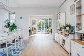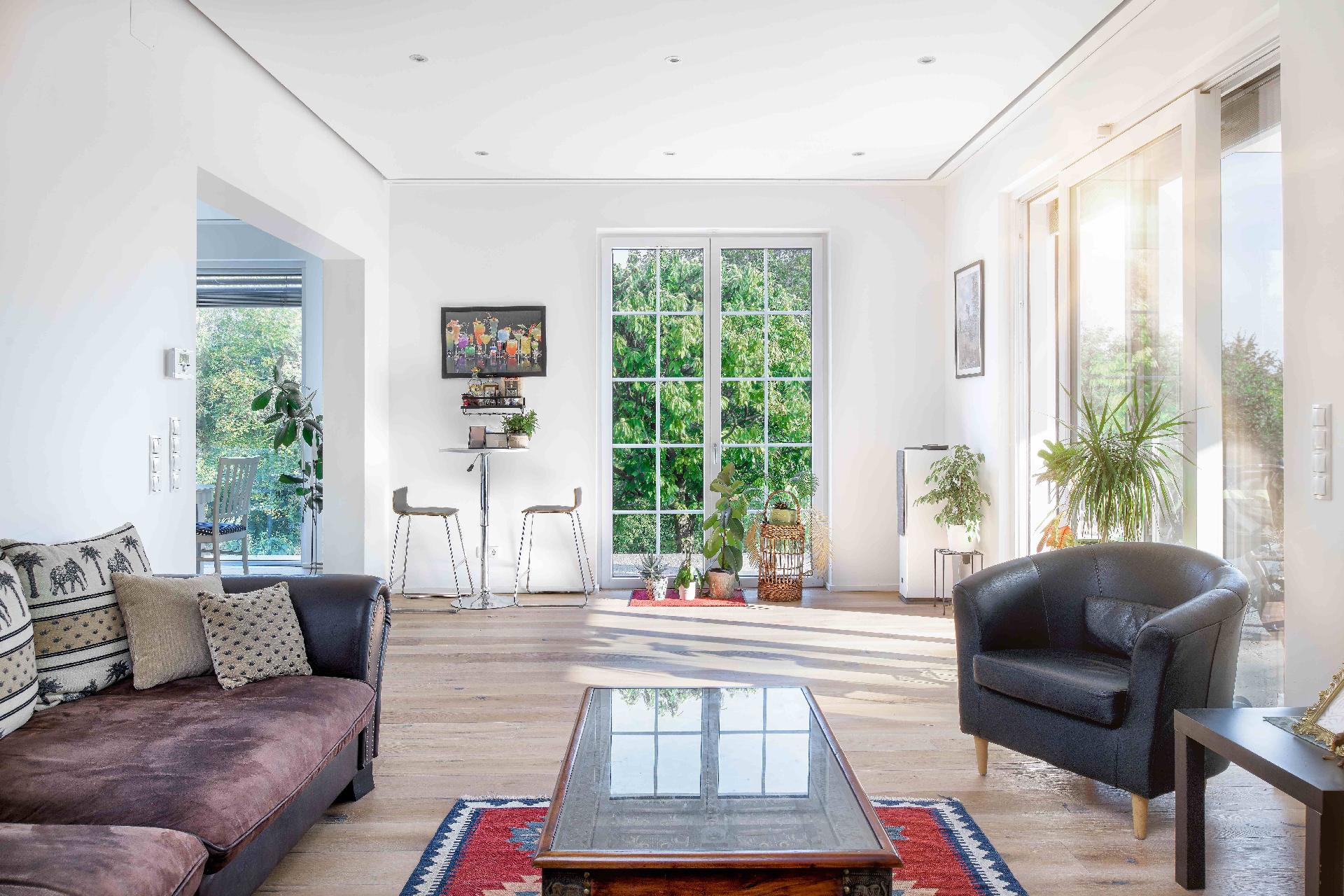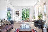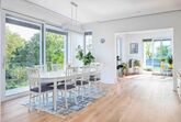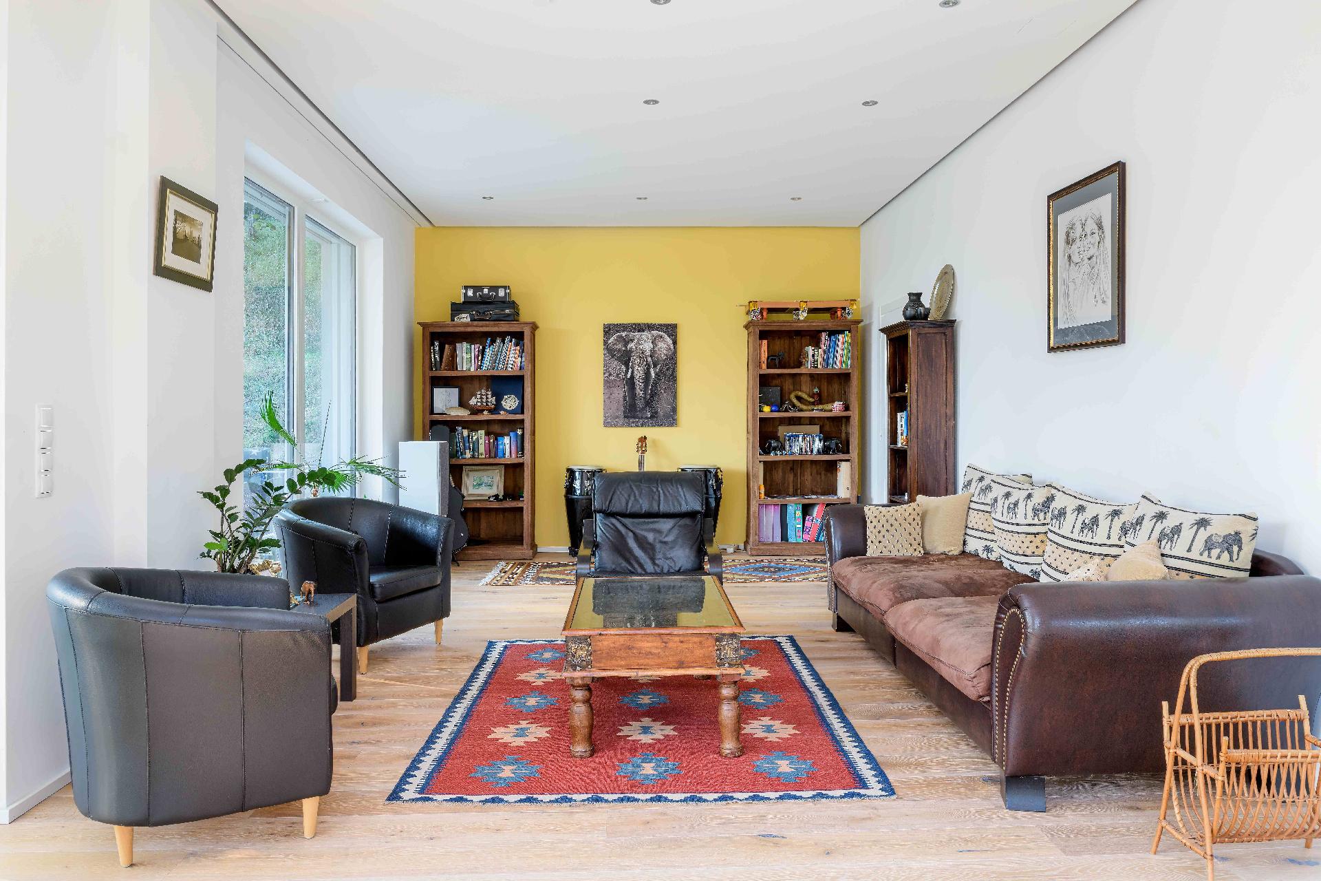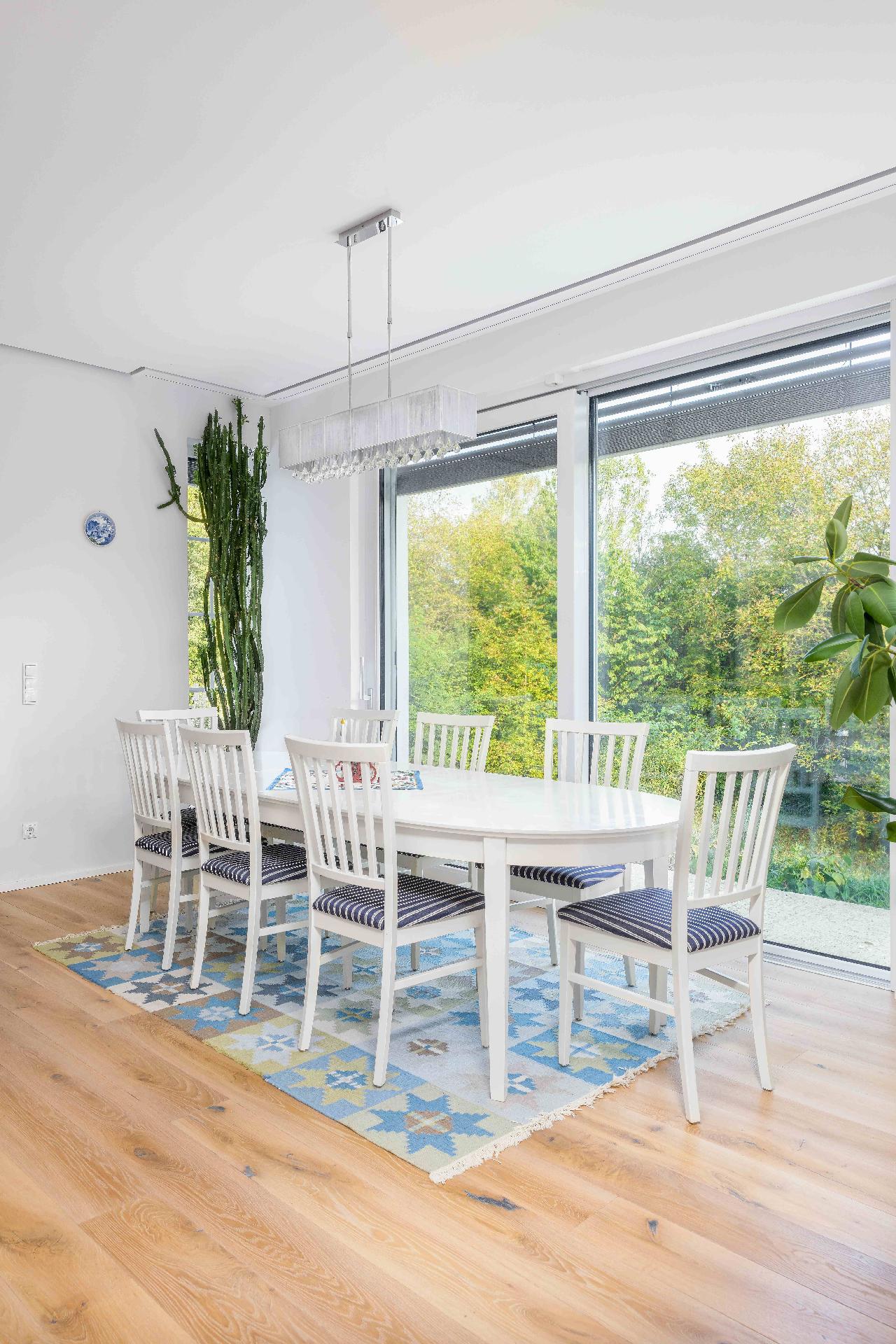 --Großzügige Wohnbereiche: Ein stilvolles Esszimmer mit Platz für 10 Personen und ein gemütliches Wohnzimmer mit Sofas und kleiner Bar.