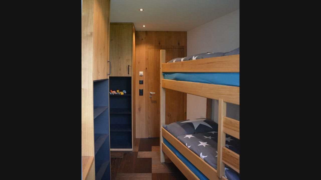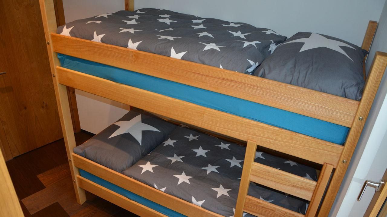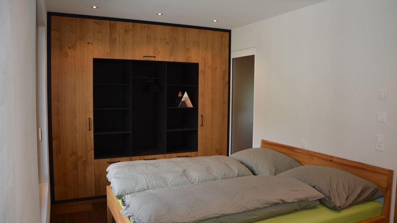 Elternzimmer mit Doppelbett, Babyreisebett vorhanden (kostenlos), grosser Einbauschrank mit viel Stauraum und Garderobe. Direkter Zugang zum Bad.