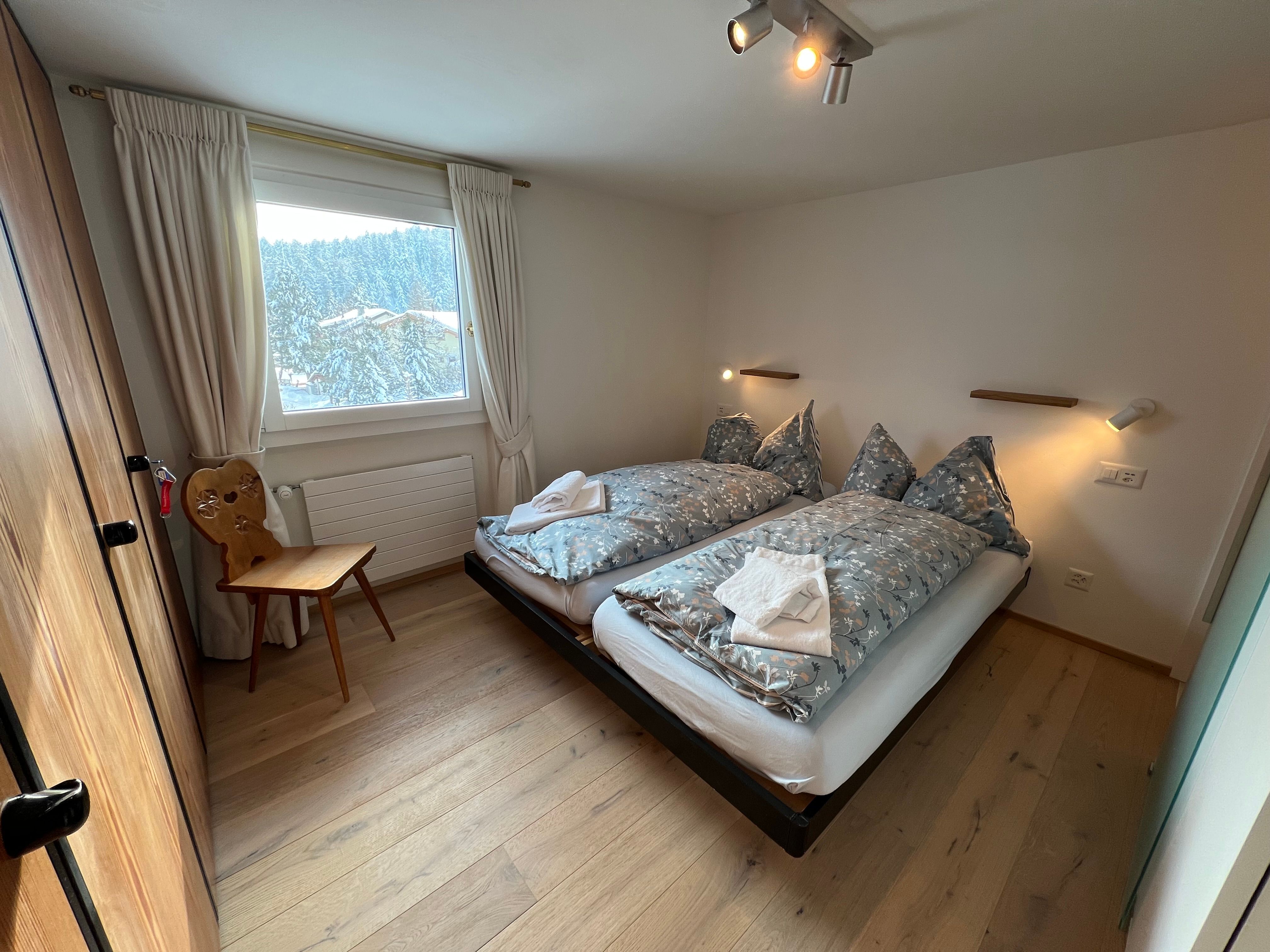 Innen bietet die Wohnung eine offene, voll ausgestattete Küche mit Backofen, Kühlschrank, Nespresso-Kaffeemaschine, Wasserkocher, Fondue- und Raclette-Set, Toaster, die für kulinarische Höhenflüge keine Wünsche offen lässt. Das gemütliche Wohnzimmer ist mit einem Sofa, einem Esstisch und TV ausgestattet, während die zwei Schlafzimmer jeweils zwei Einzelbetten beherbergen. Das Badezimmer verfügt über eine Toilette, Badewanne, Ablage für Frottéewäsche, ein Lavabo mit Spiegel und einen Haartrockner.