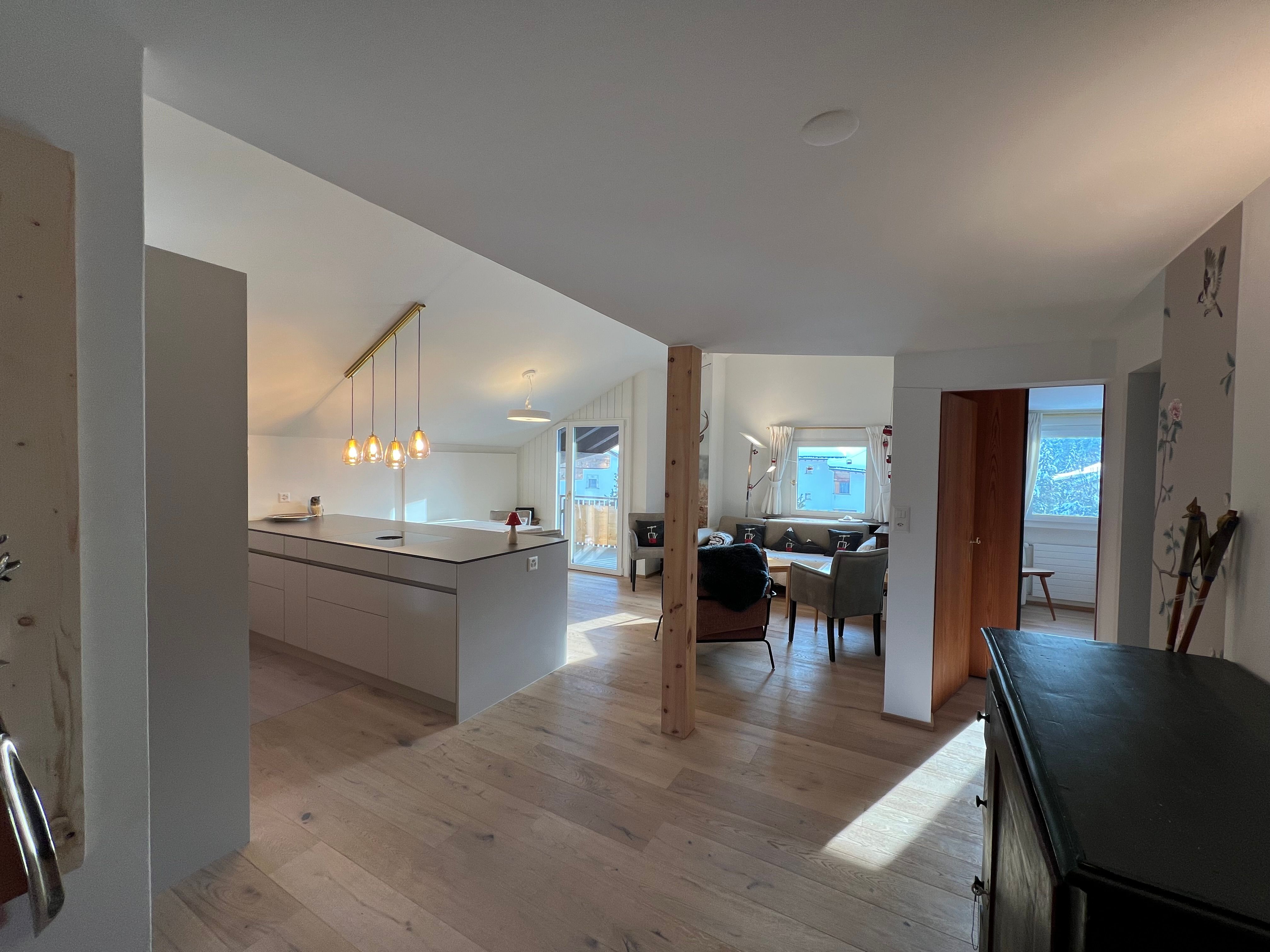 Zur Wohnung gehören eine abschließbare Garage und ein Außenparkplatz. Skiraum sowie WLAN-Zugang sind weiterhin Teil des Mietangebots. Obwohl das Treppenhaus etwas eng ist, tragen diese Annehmlichkeiten zu einem sorglosen Aufenthalt bei.